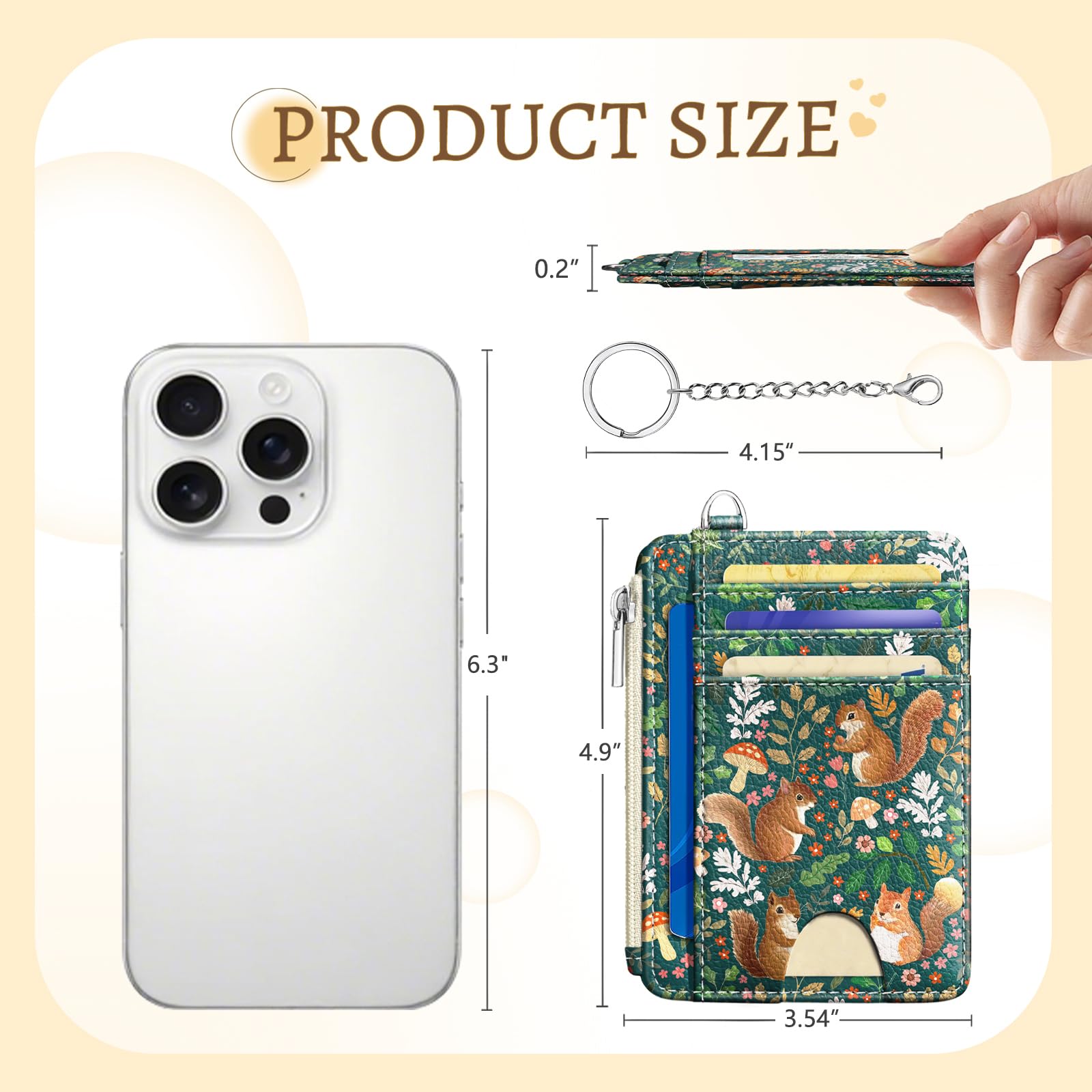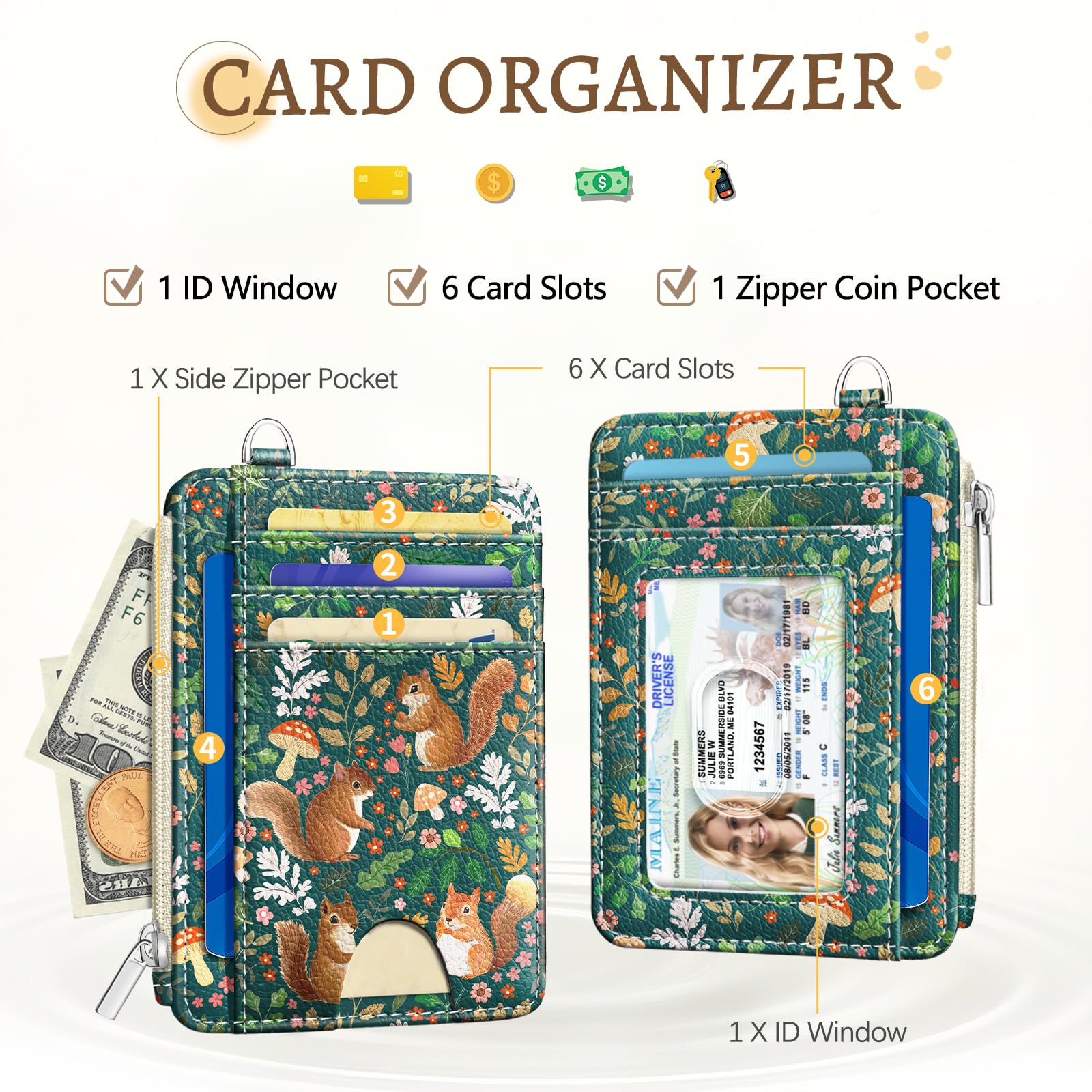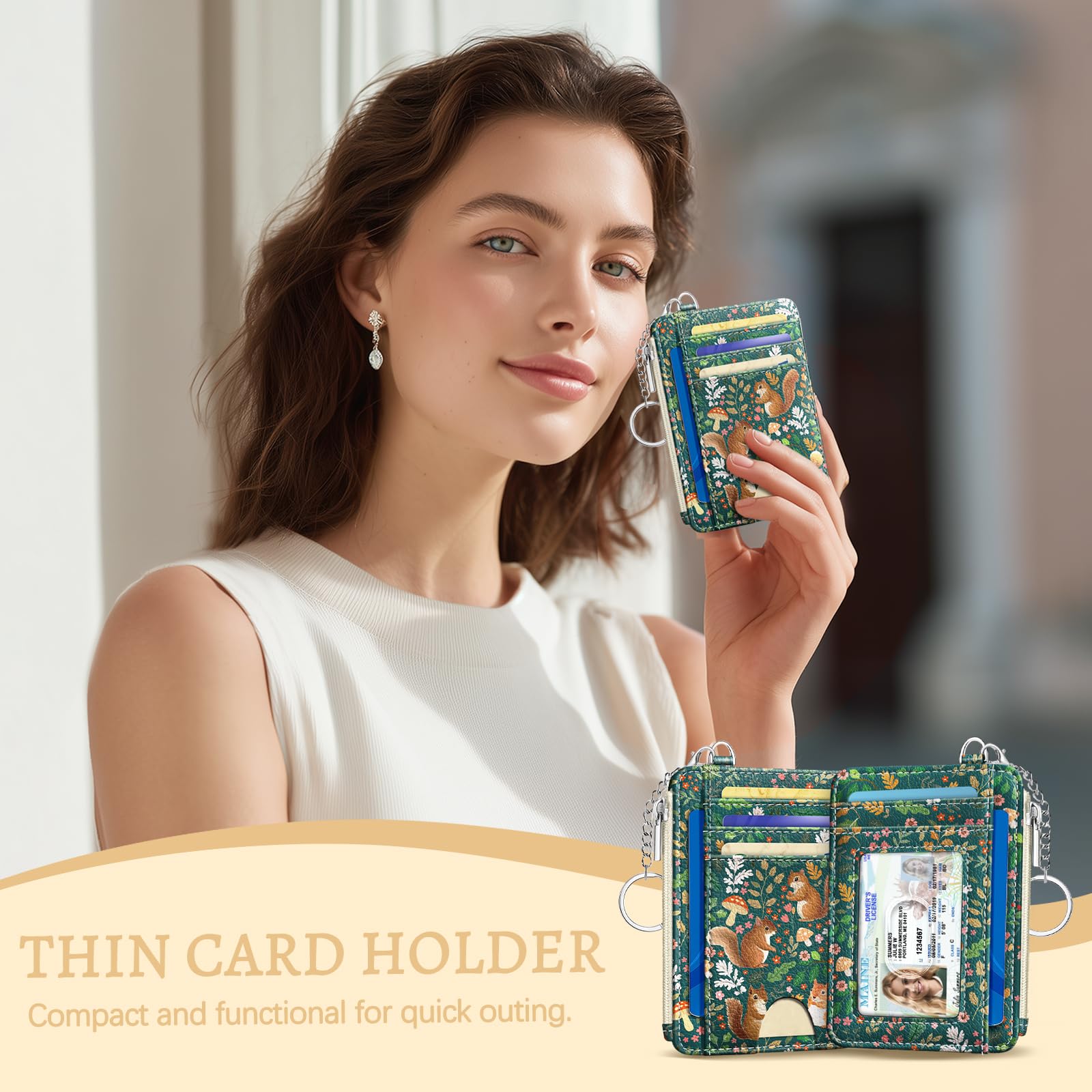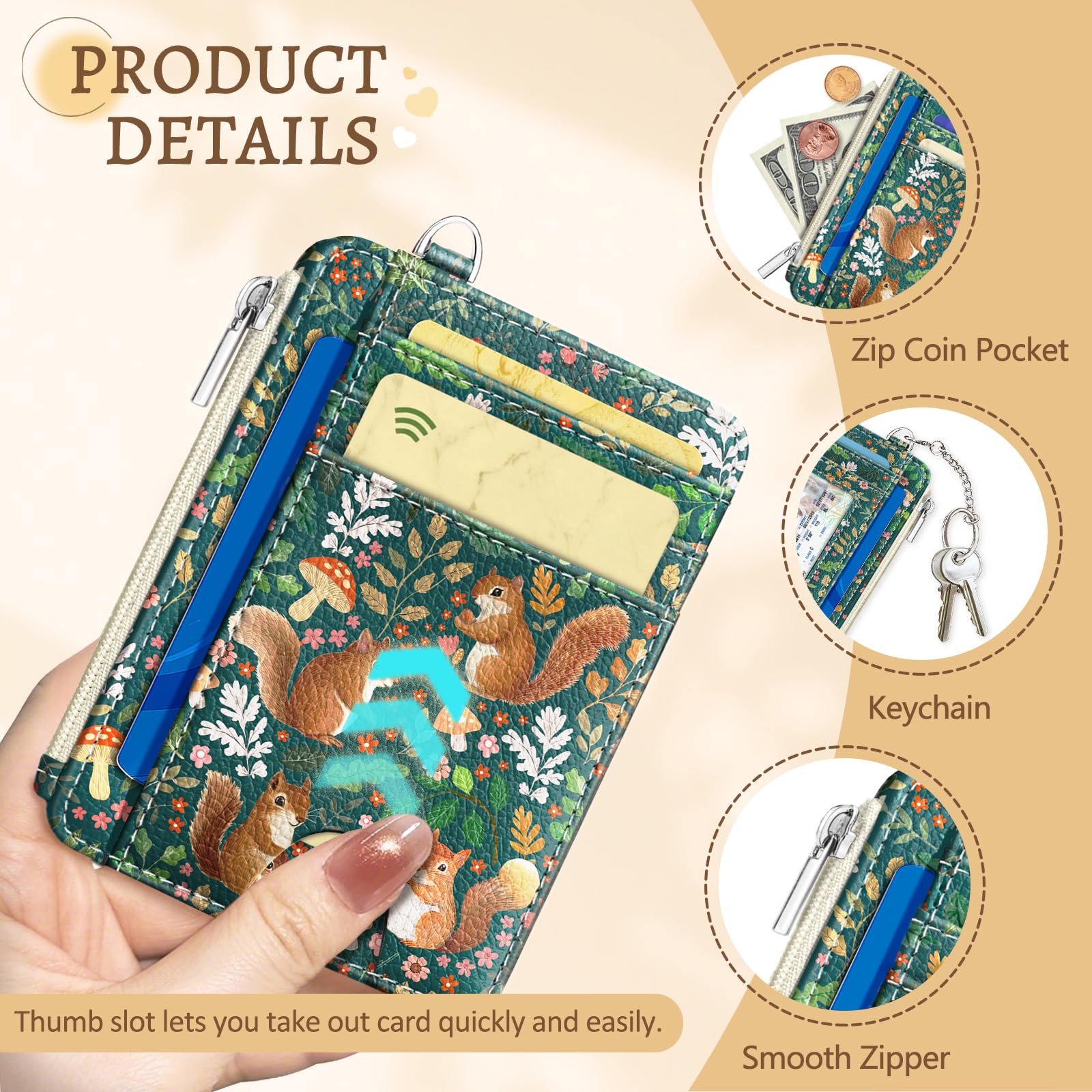 Special Pattern Design: This wallet women features adorable squirrels, mushrooms, and delicate floral in a green grass background. The compact and lightweight design of credit card holder makes it a great choice for quick outings, allowing you to stay organized without a bulky wallet. The mini wallet keeps your must-haves secure while maintaining an effortlessly charm look