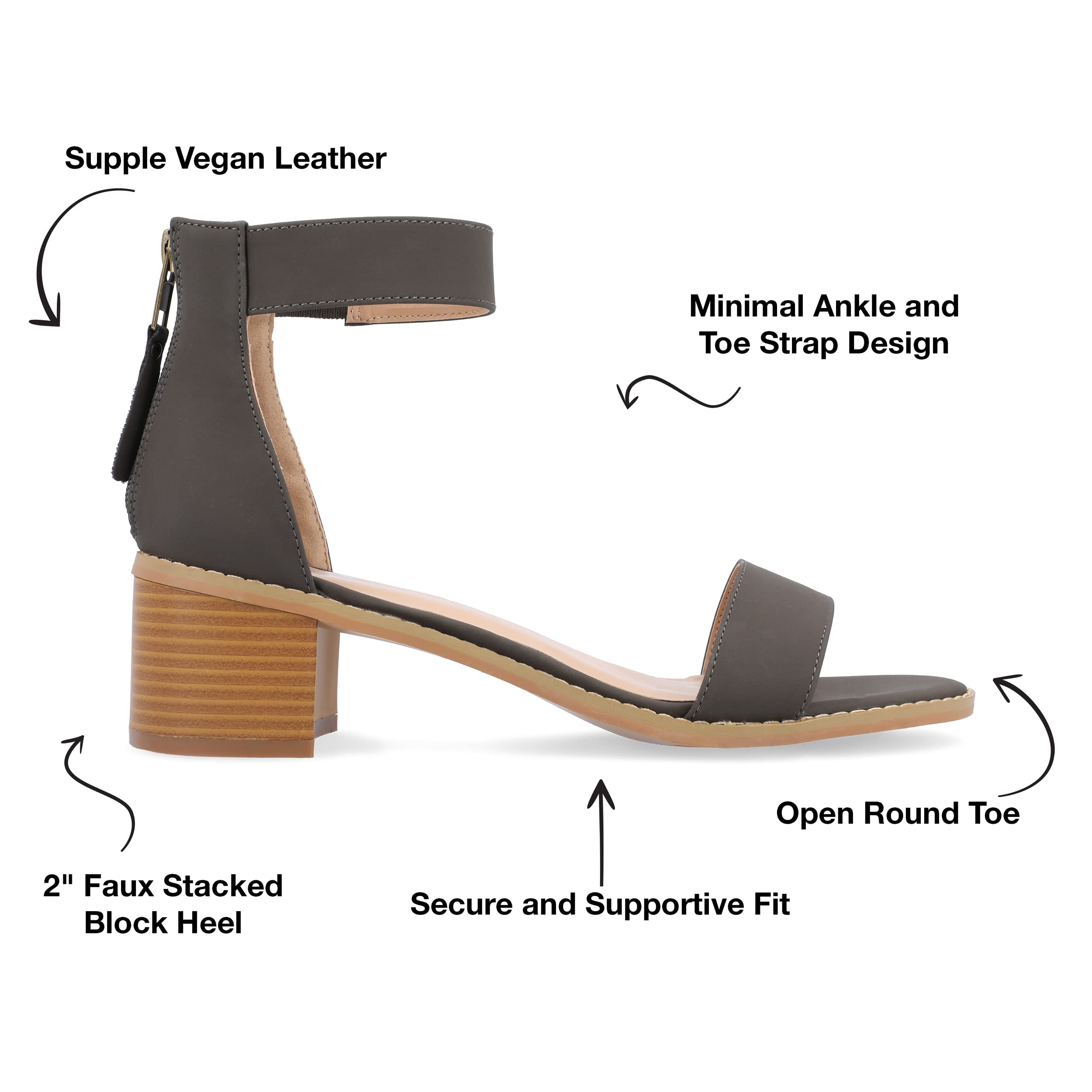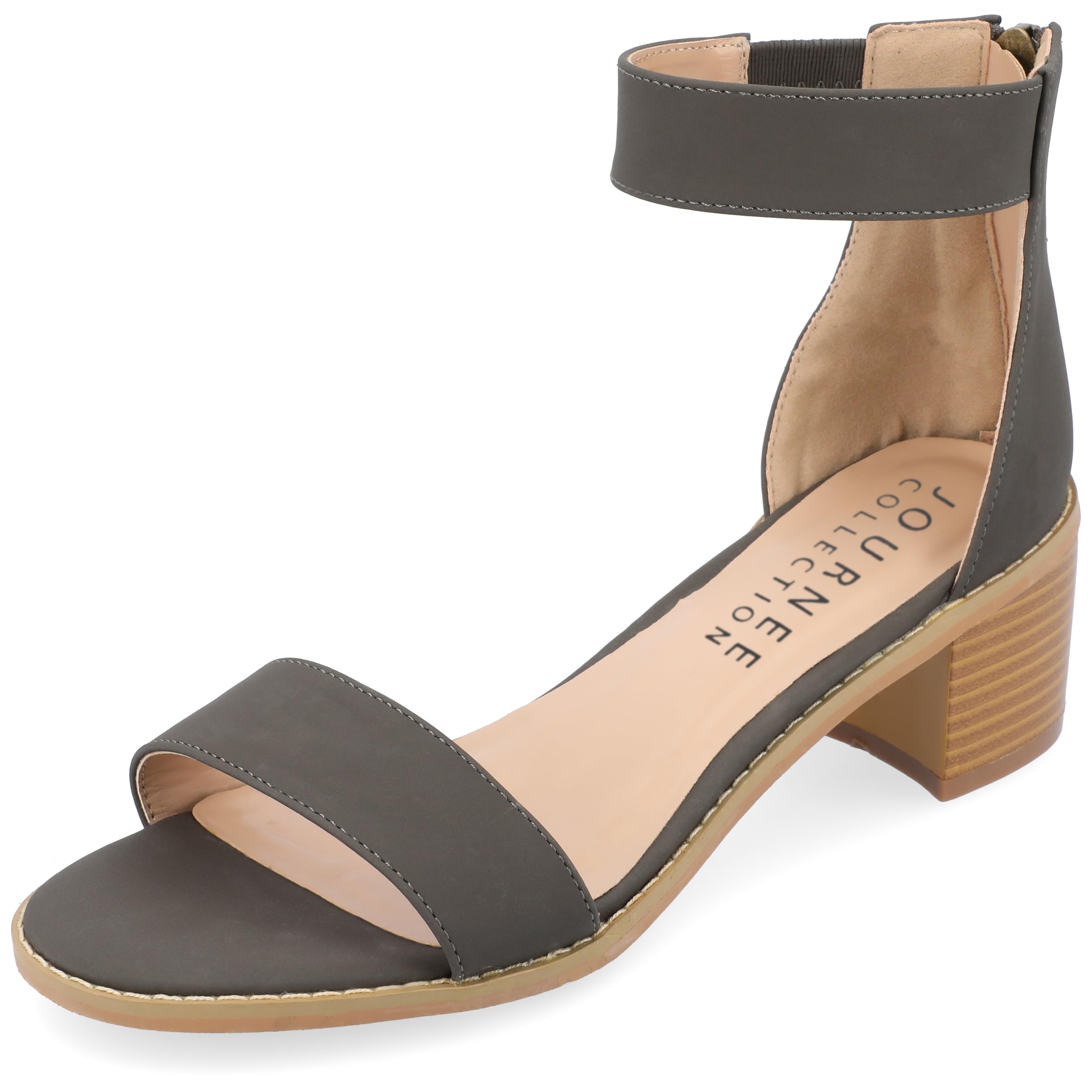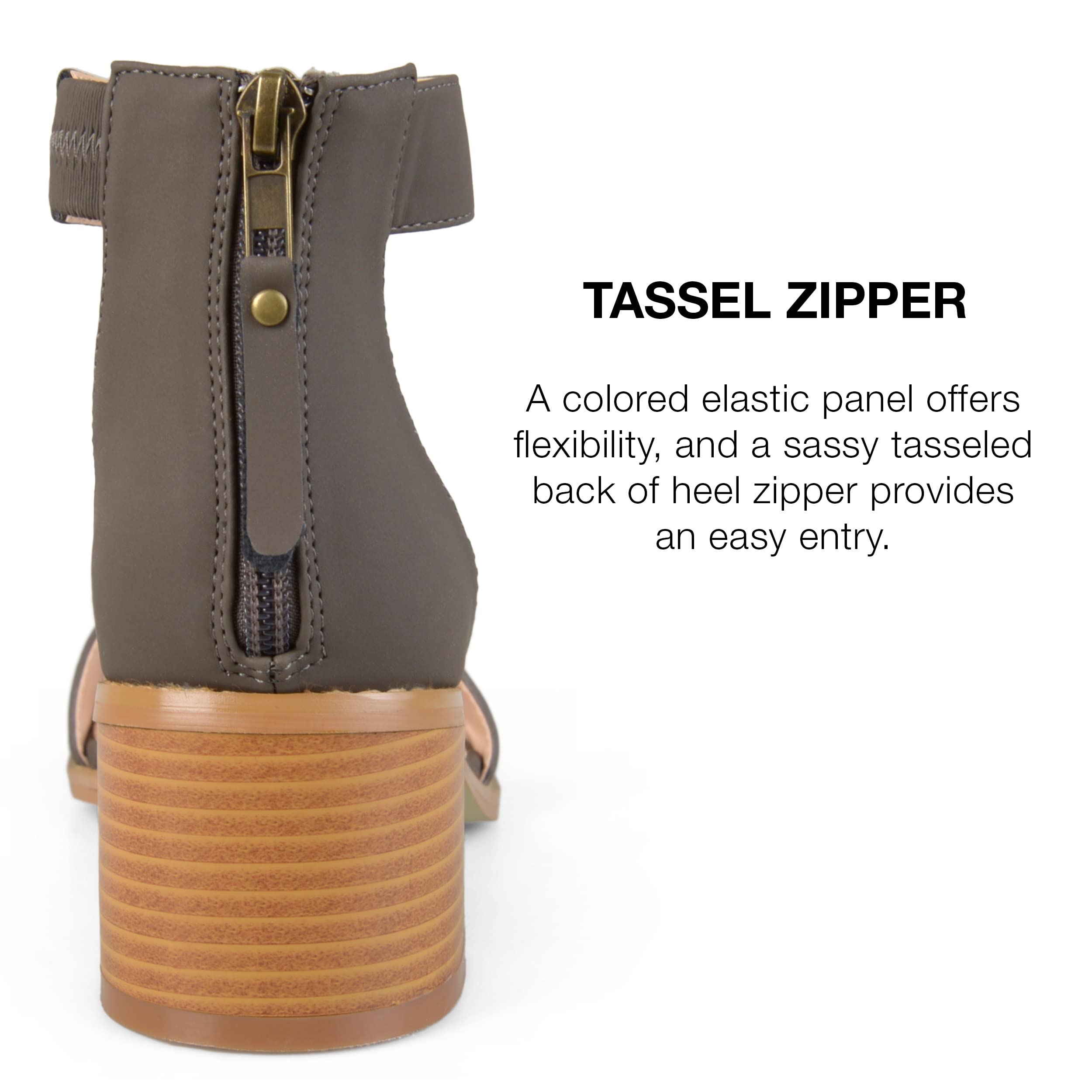 Description Show off stylish design with strappy heeled sandals by Journee Collection. These open-toe sandals feature faux nubuck uppers with ankle straps that connect to closed back heels and highlight tasseled zipper detail. At Journee Collection, our sandal styles are going to be perfect for any occasion. Whether that be a formal, business, or casual dress, these sandals will be a perfect match.