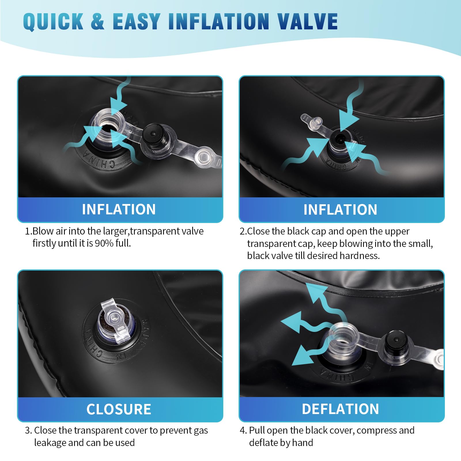 【Portable Hair Washing Sink Simple Way to Inflate/Deflate】Our portable shampoo adopts an advanced double-layer air valve design: the upper valve is easy to fill with air, and the lower valve is easy to deflate. So when there is only one air valve, there is no need to worry about the shampoo leaking easily. To inflate the simply pinch the base of the valve and blow, It can also be used with the help of an inflation pump.