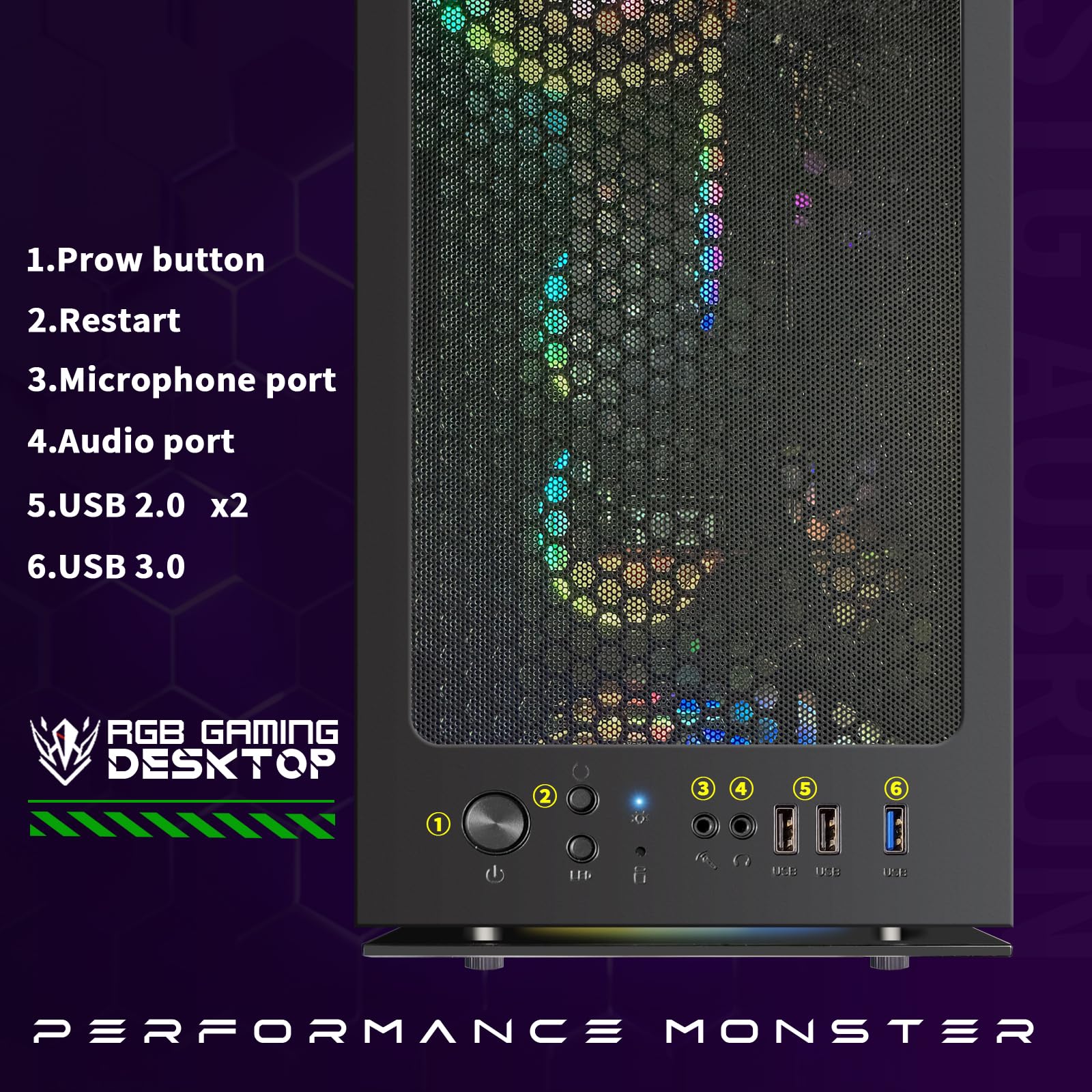 Gaming Desktop Connectivity: This gaming pc comes with RGB Fan x 4 | 1x RJ-45 | USB 600M Wi-Fi | USB Bluetooth 5.0 | NVIDIA GeForce RTX 2060 6G GDDR6 Video Card | 1x HDMI | 1x DisplayPort | 1x DVI
