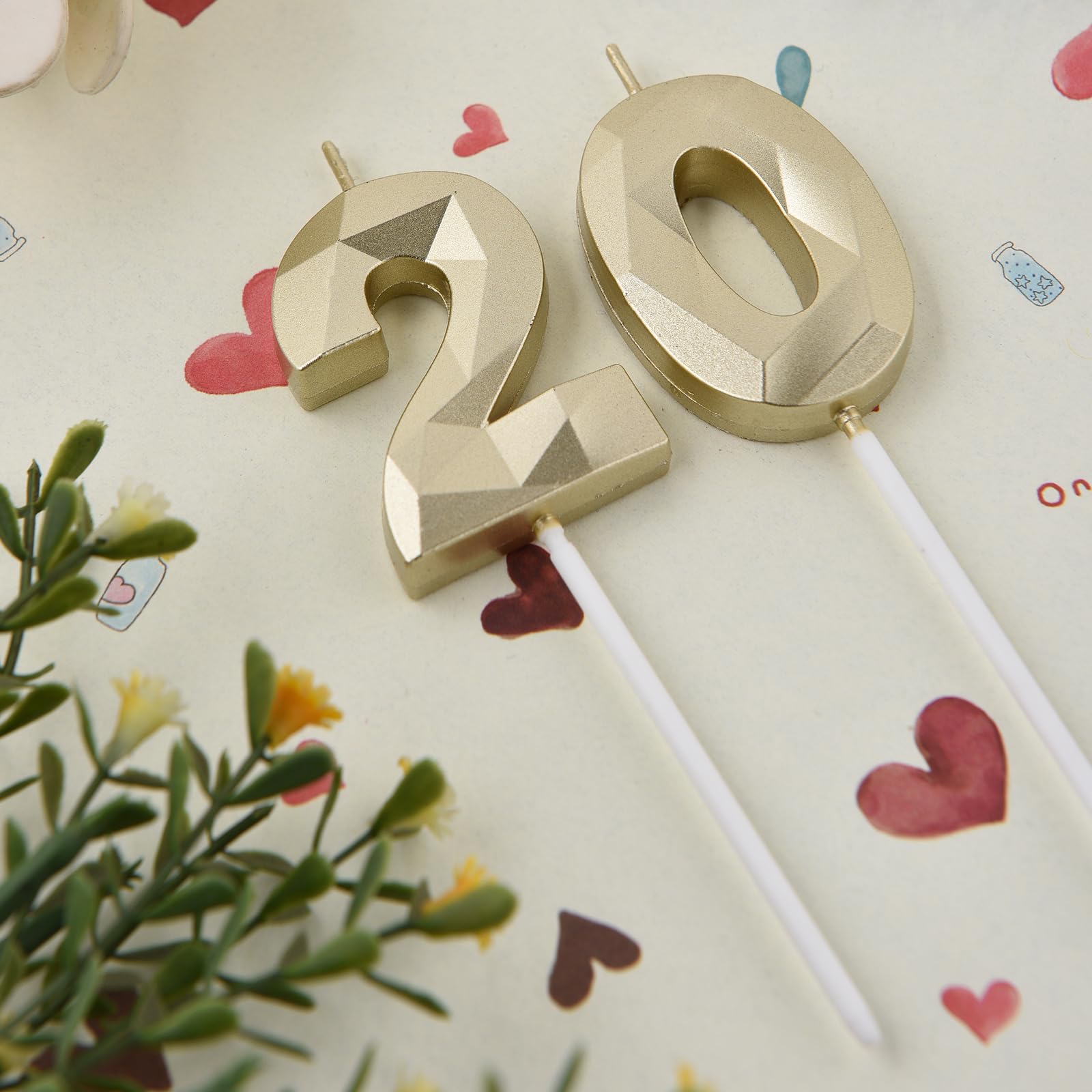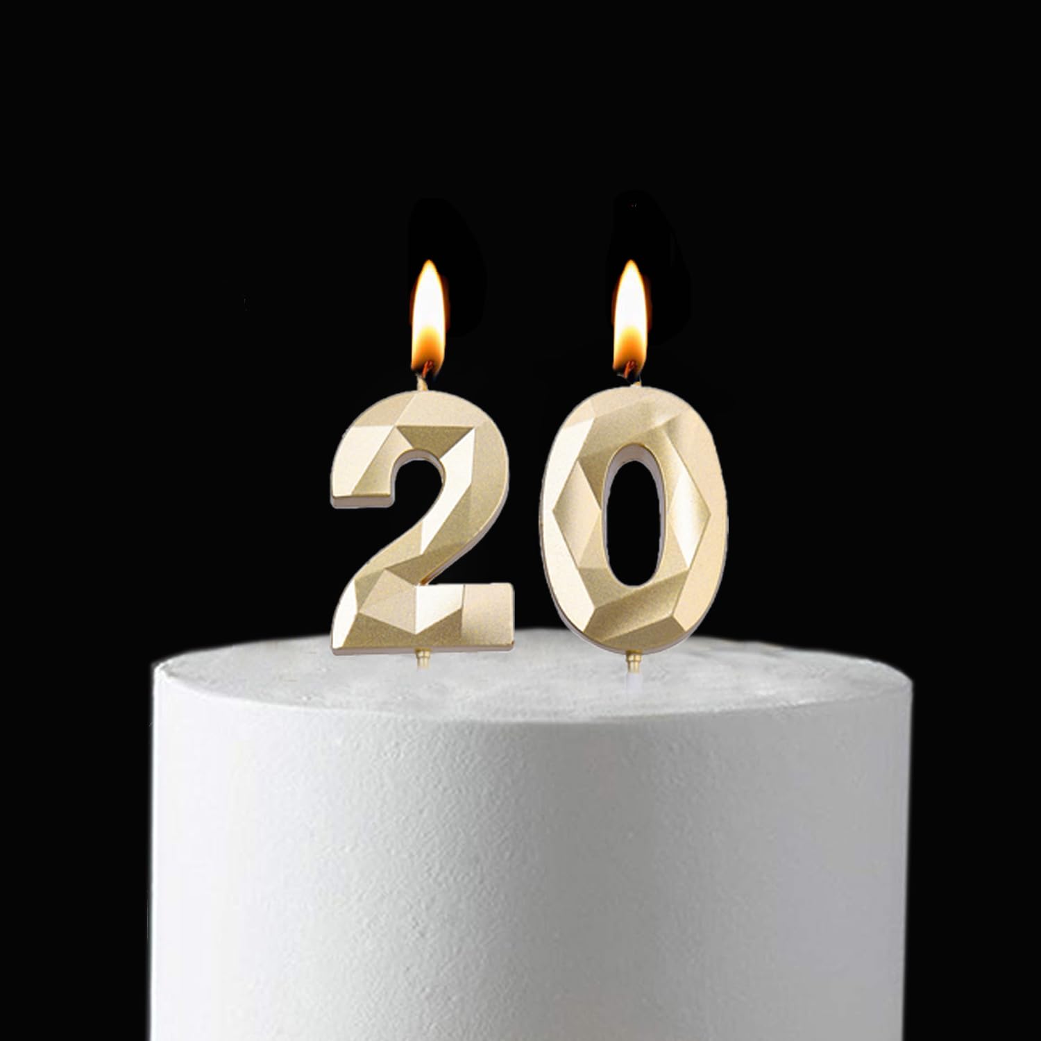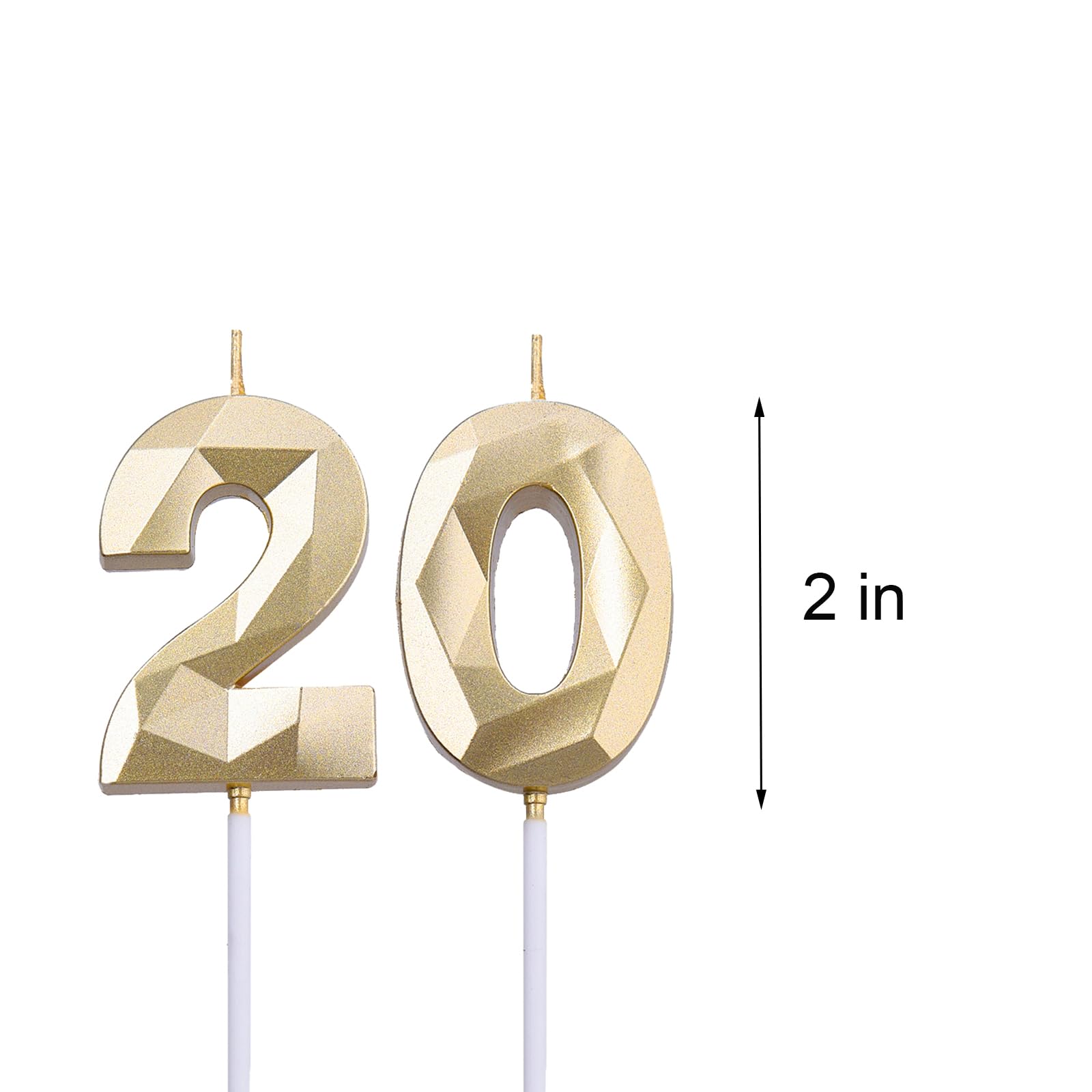 INSTRUCTIONS: Package Include: 2 pcs candles,Number 20 birthday candles Color : Glitter Gold Material : quality wax ,smokeless and non-toxic Size: Width:1.4 in. Number height: 1.97 in. Total height: 4.9 in Please Note : Warm Note:Please keep the candles in shade away from the fire
