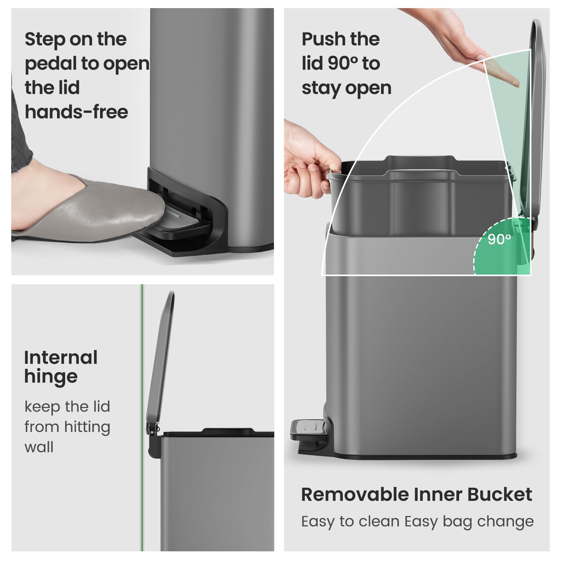 Sturdy Steel Pedal: Upgrade foot pedal of the bathroom trash can combines stainless steel tread with plastic material, making a lighter and more comfortable pedaling experience. Engineered to last over 150,000 steps, allowing you to step more than 20 steps a day for 20 years