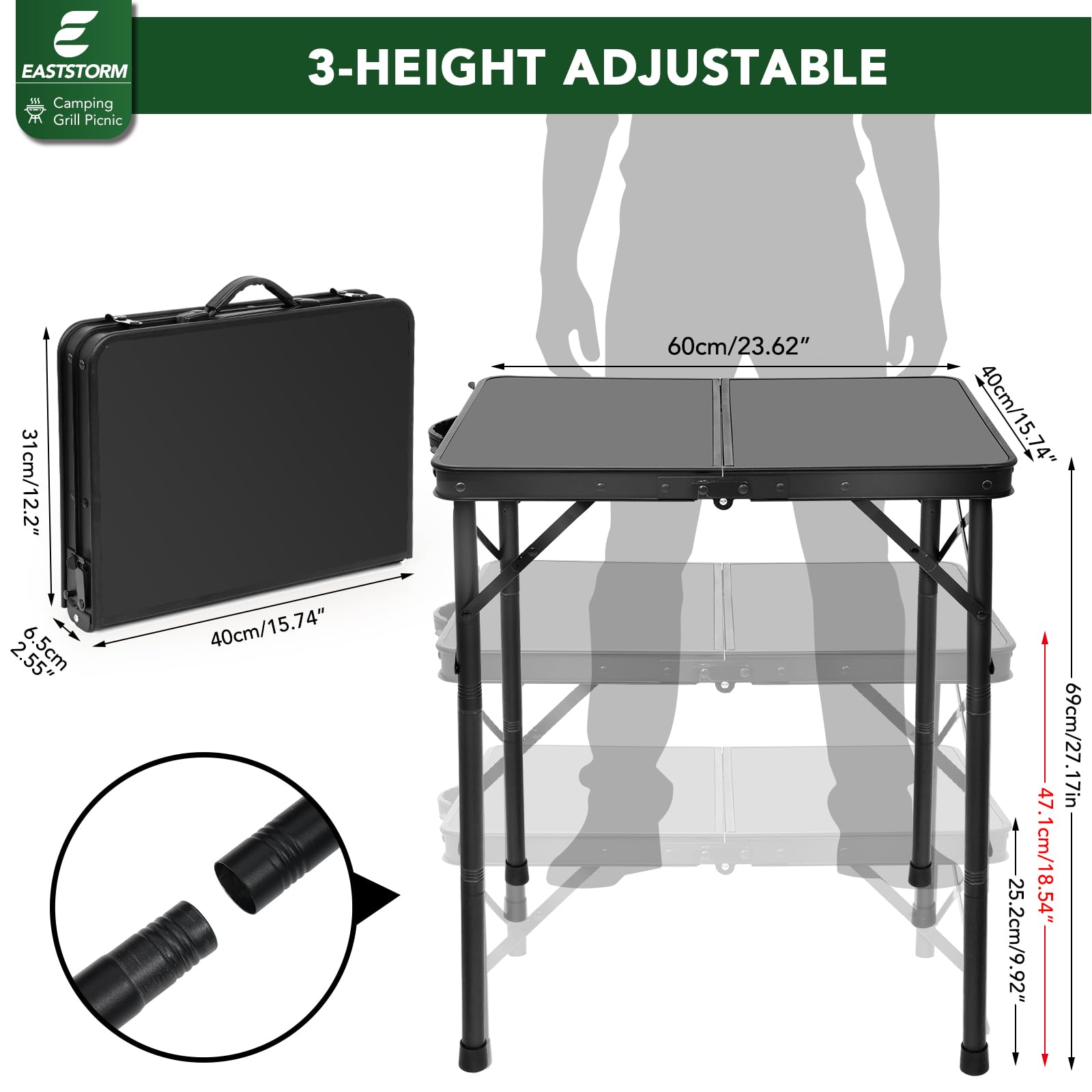 【Adjustable 3-Height Folding Design for Every Occasion】 Switch easily between 10", 18.5", and 27.2" heights to fit any situation. Use the low setting for kids’ activities or camping meals, the mid-level for crafting or bedside use, and the tall mode for garage work or outdoor cooking. This 3-height adjustable folding table adapts effortlessly to your lifestyle.