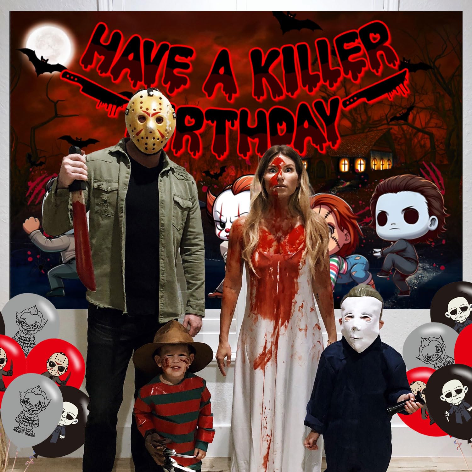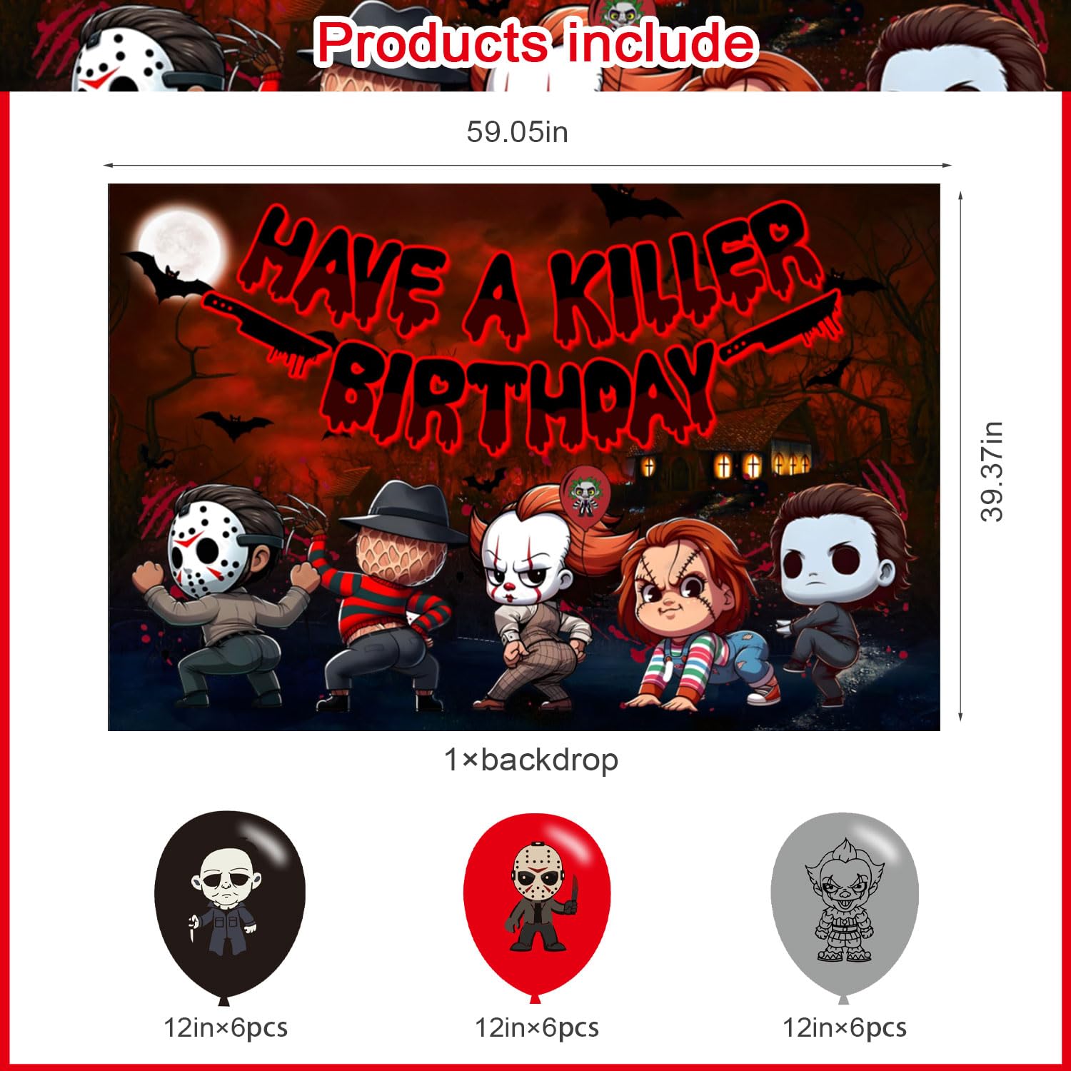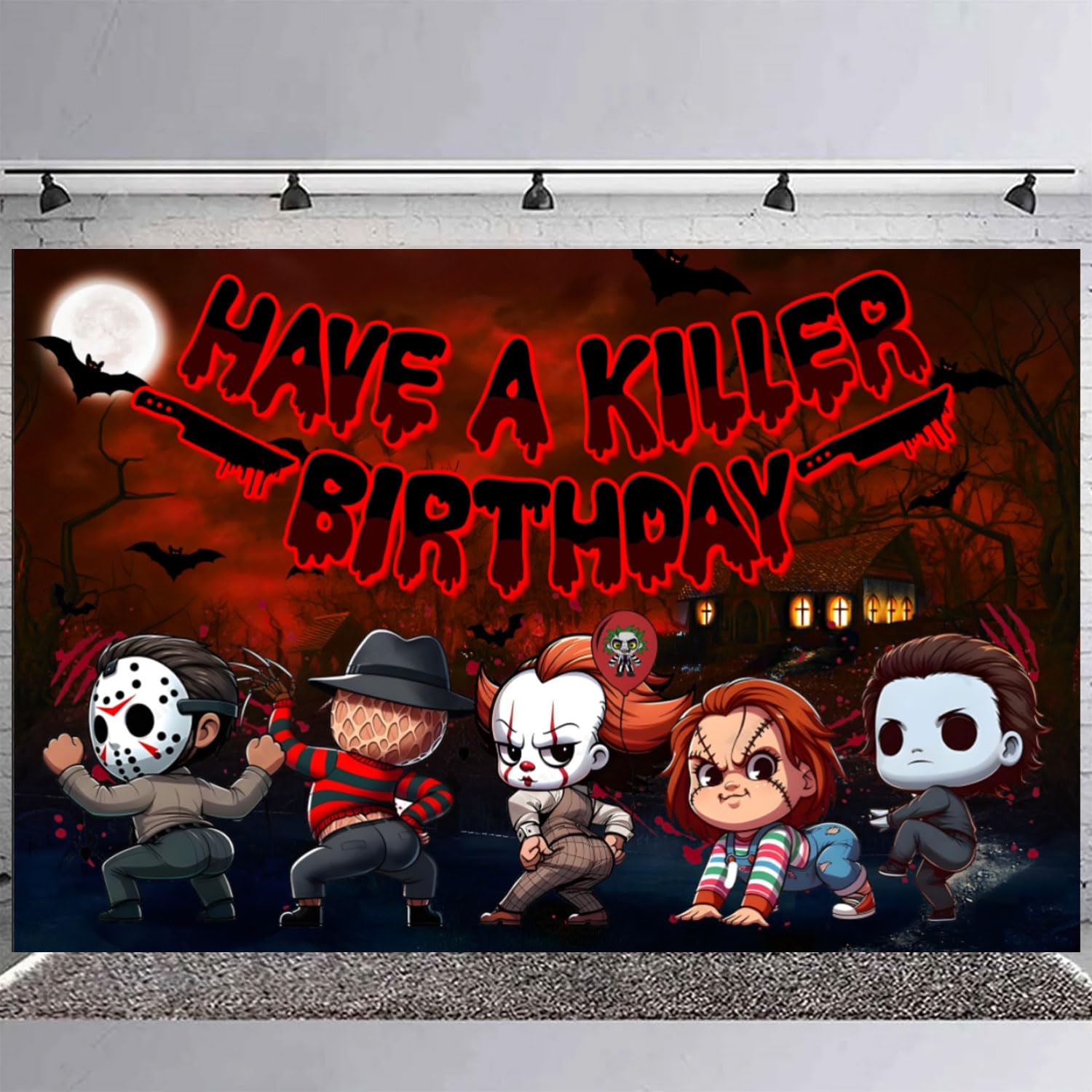 Halloween Horror Birthday Party Backdrop, Horror Classic Movie Character Birthday Party Decoration,Horror Movie Themed Happy Birthday Banner Shoot Photo Backgrounds Props for Boys and Girls Party 5x3ft