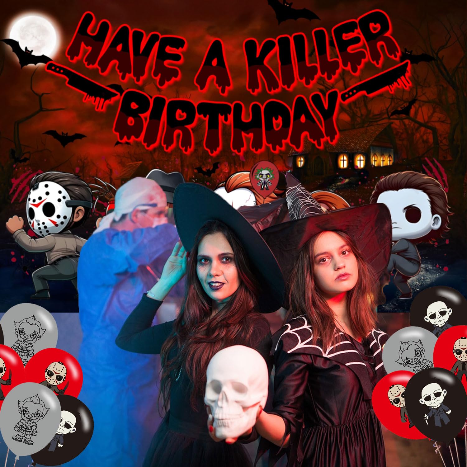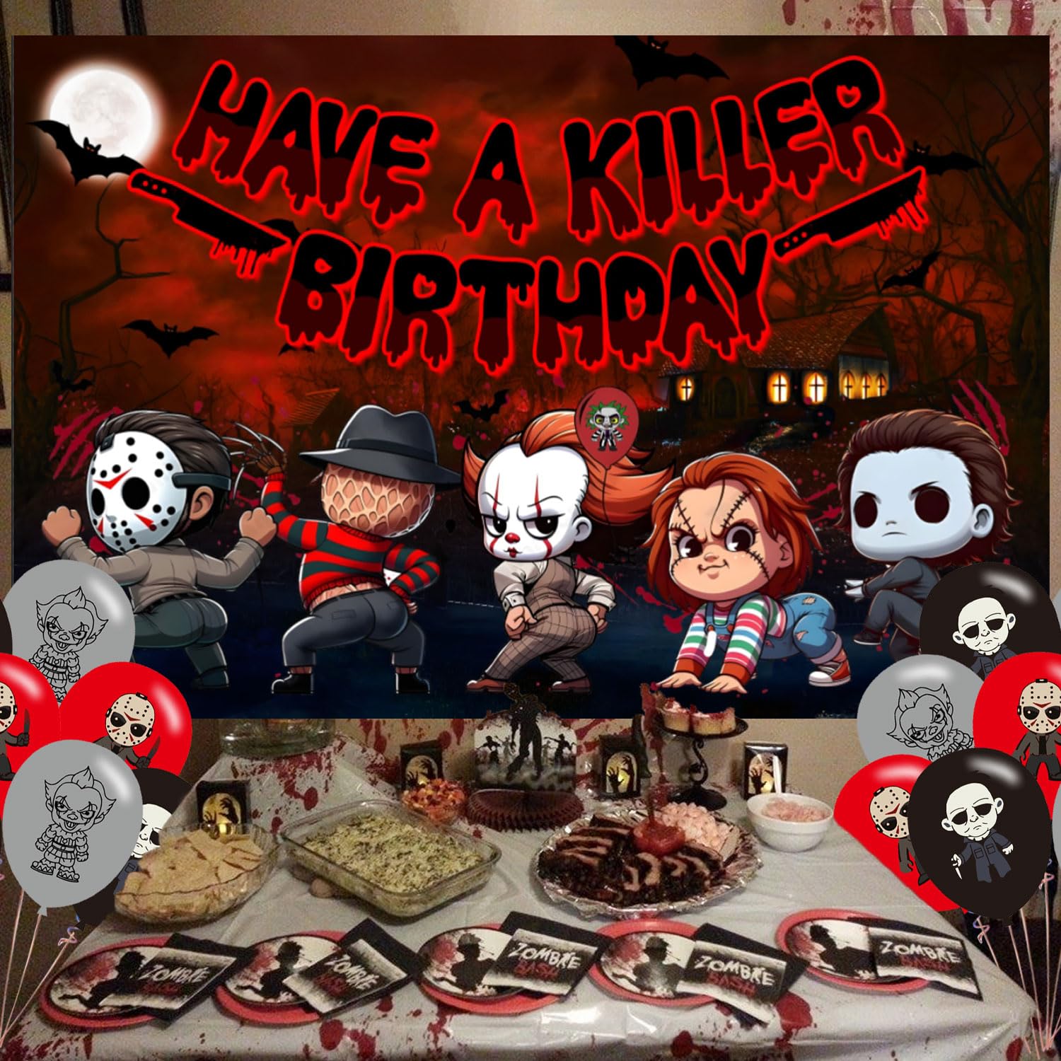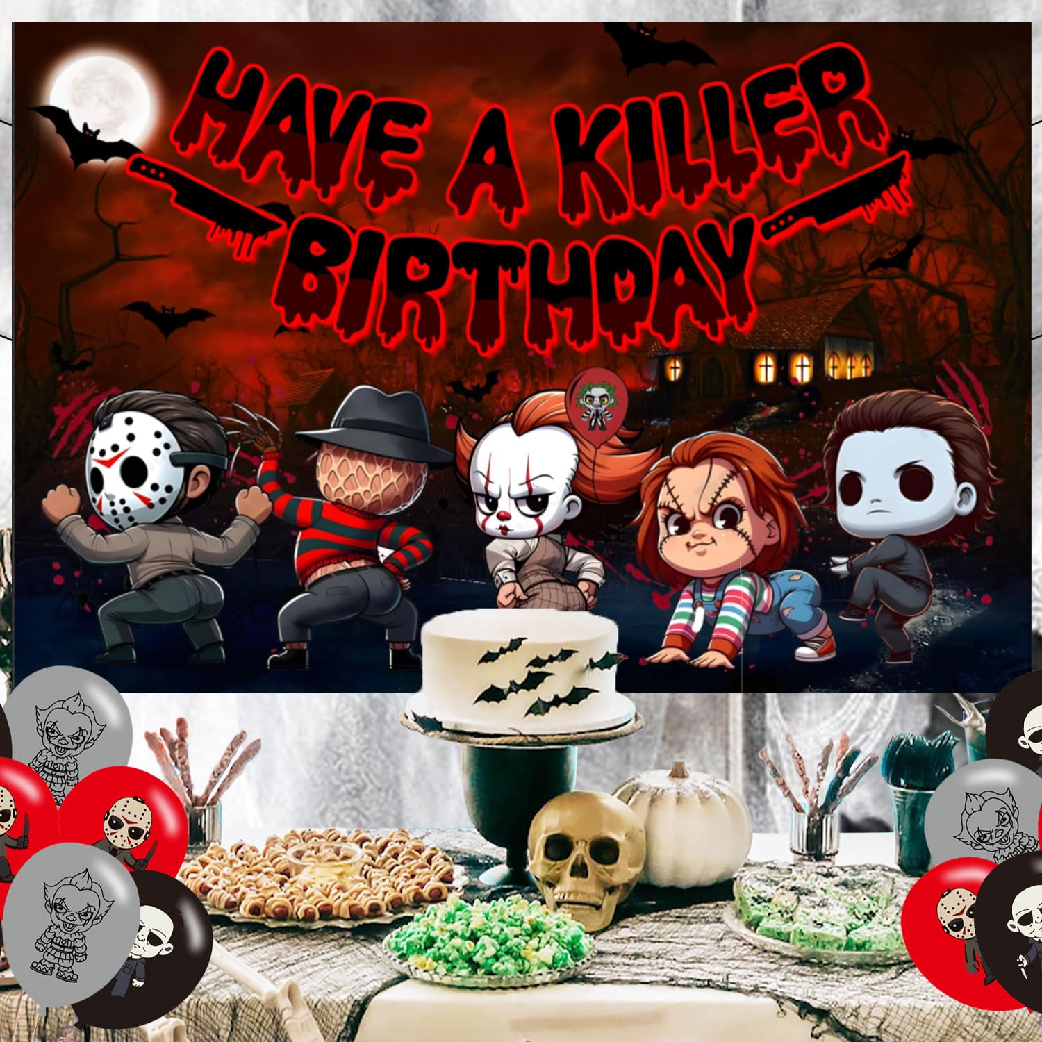 Halloween Horror Birthday Party Backdrop, Horror Classic Movie Character Birthday Party Decoration,Horror Movie Themed Happy Birthday Banner Shoot Photo Backgrounds Props for Boys and Girls Party 5x3ft