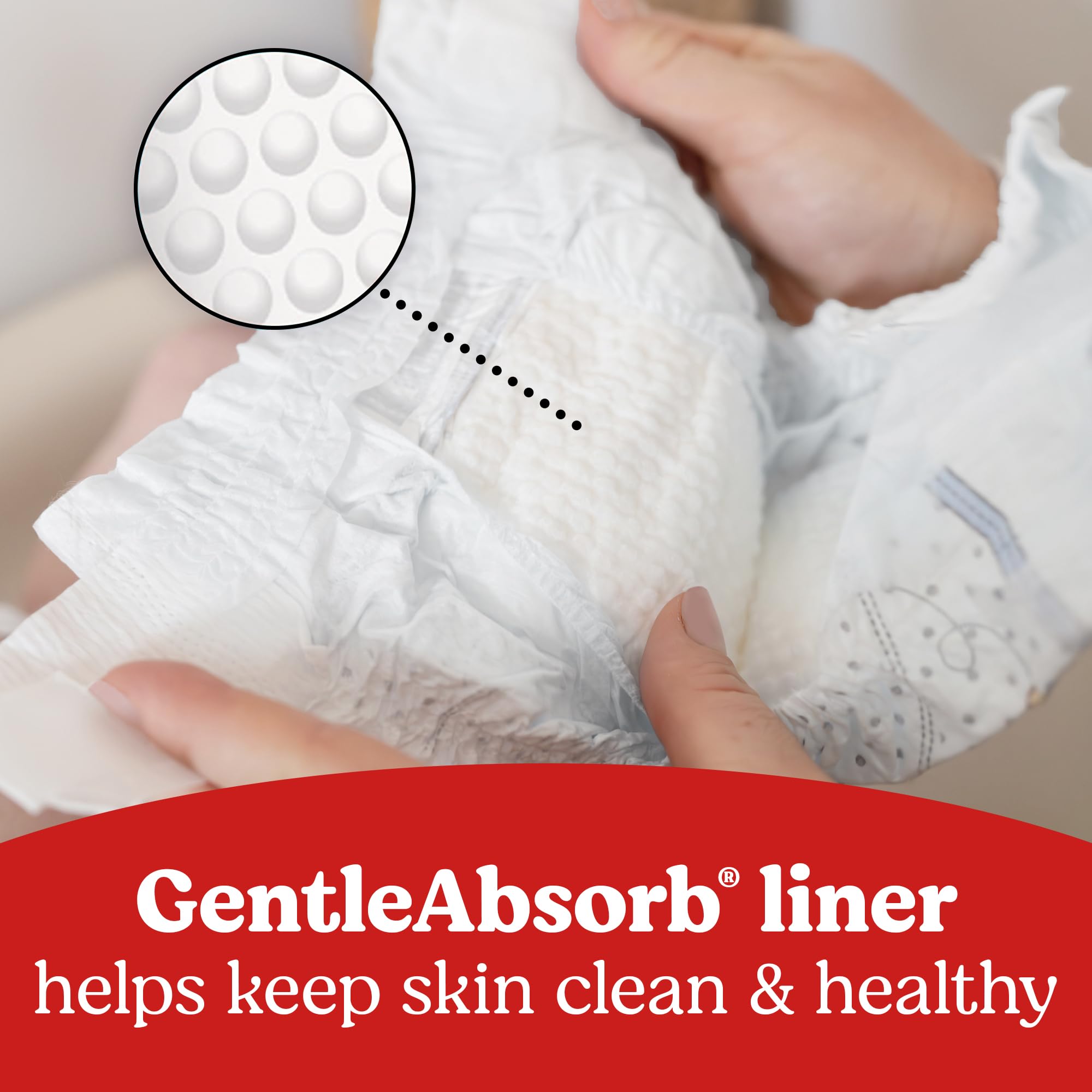 GentleAbsorb Liner: Each disposable diaper is made with Huggies’ GentleAbsorb Liner*** that absorbs wetness on contact to help keep your baby’s skin clean and healthy (***Available in Little Snugglers sizes Preemie-2)