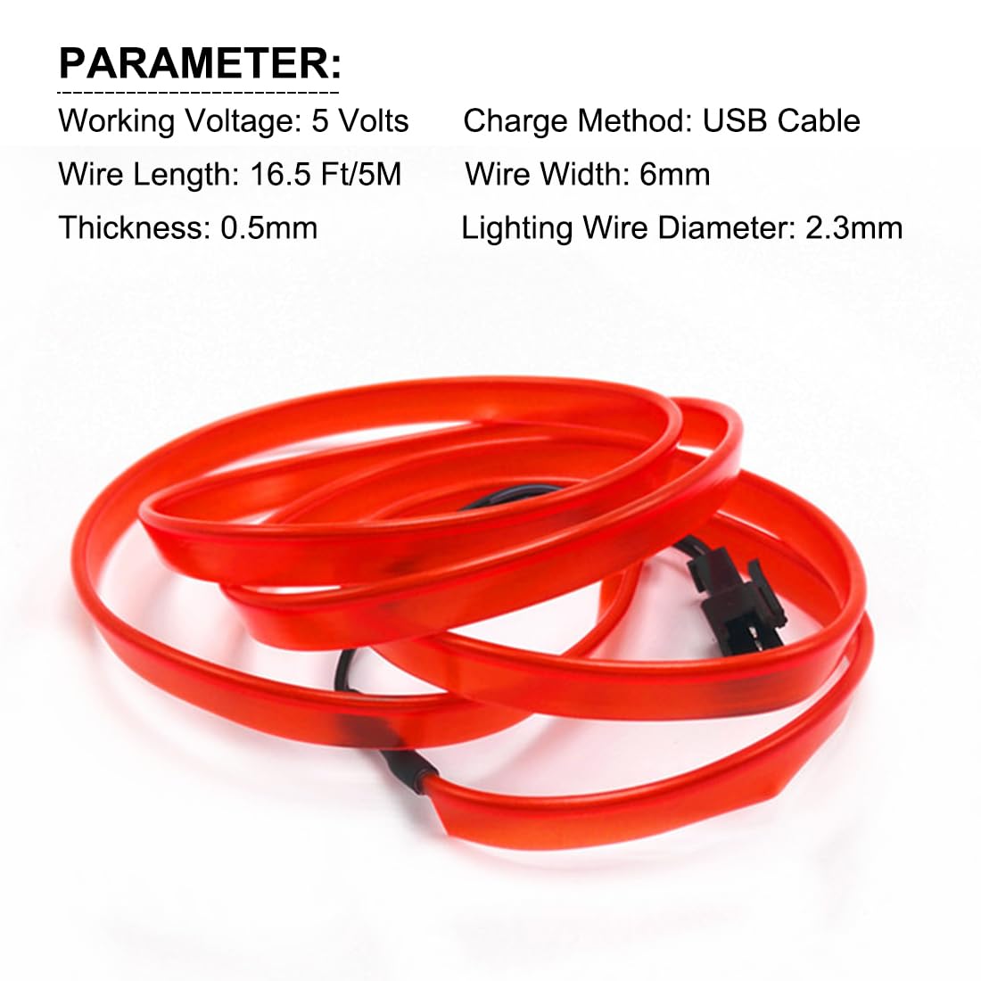Flexible EL Wire: Neon rope light is about 5m/16.5ft long; Wire-Diameter: 2.3mm; Sewing Edge: 6mm, Neon Electroluminescent (EL) Wire, flexible and water resistant, easy to install, can be bent into any shape and cut into any length (you need to seal the new end).