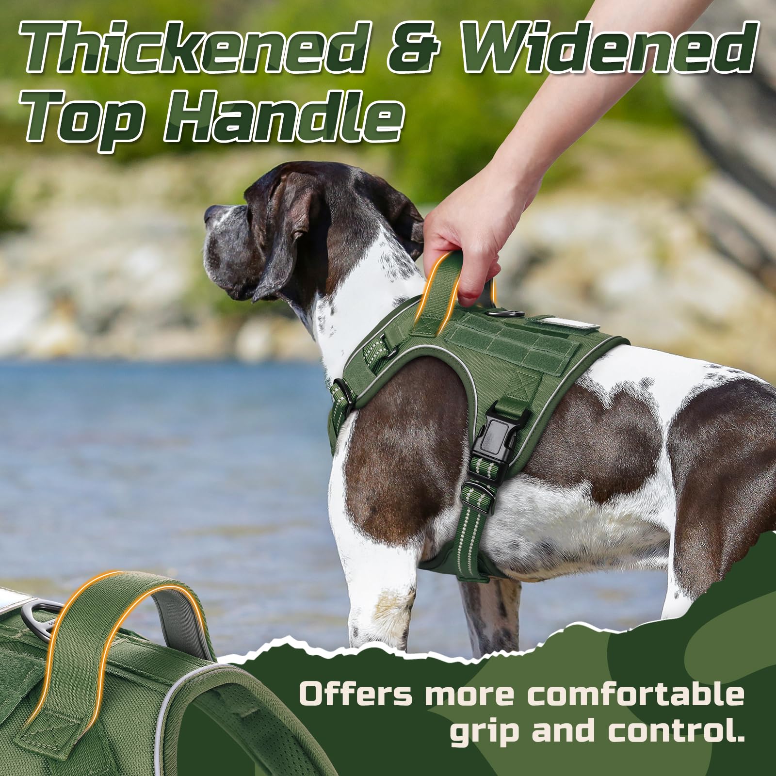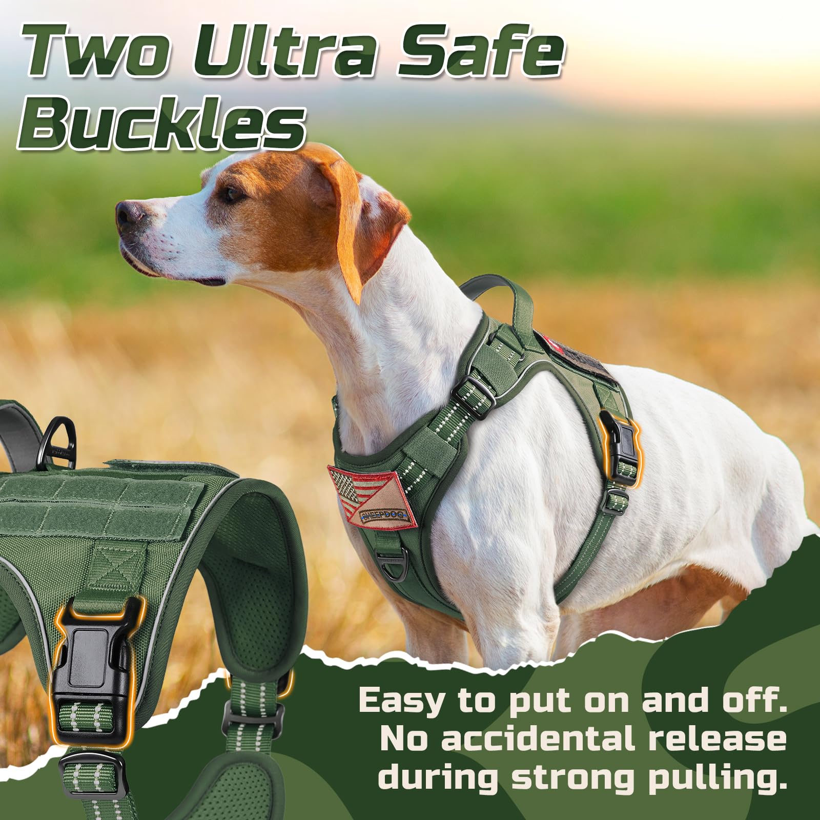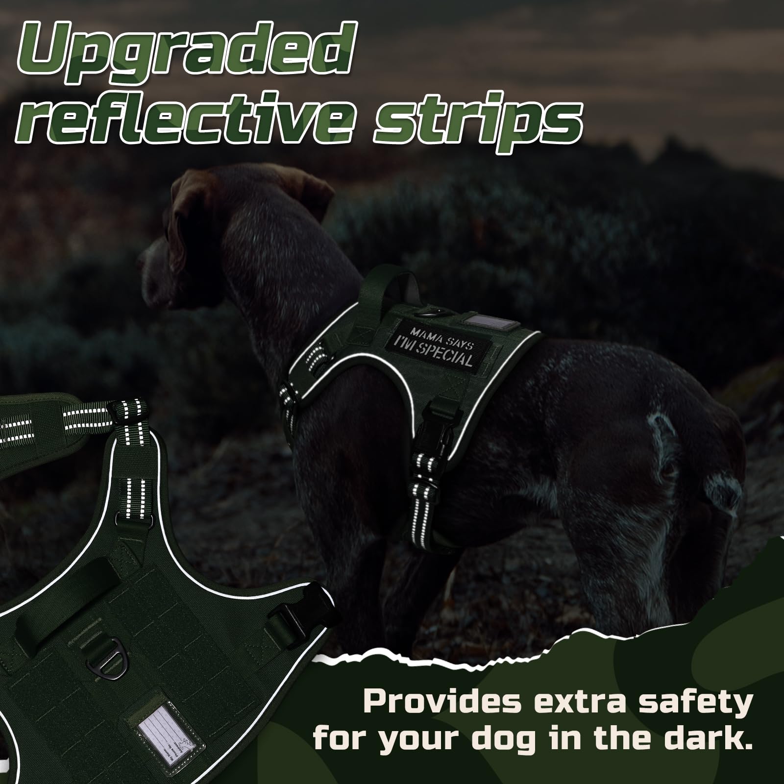 Easy to Adjust & Wear: The tactical dog harness features 4 convenient adjustment points (2 Shoulder, 2 Chest) to ensure a snug fit for dogs of all sizes. Two quick-release buckles are designed not only for easy on and off, but also can withstand great pulling force, providing security for training, hunting, walking, and any other occasions