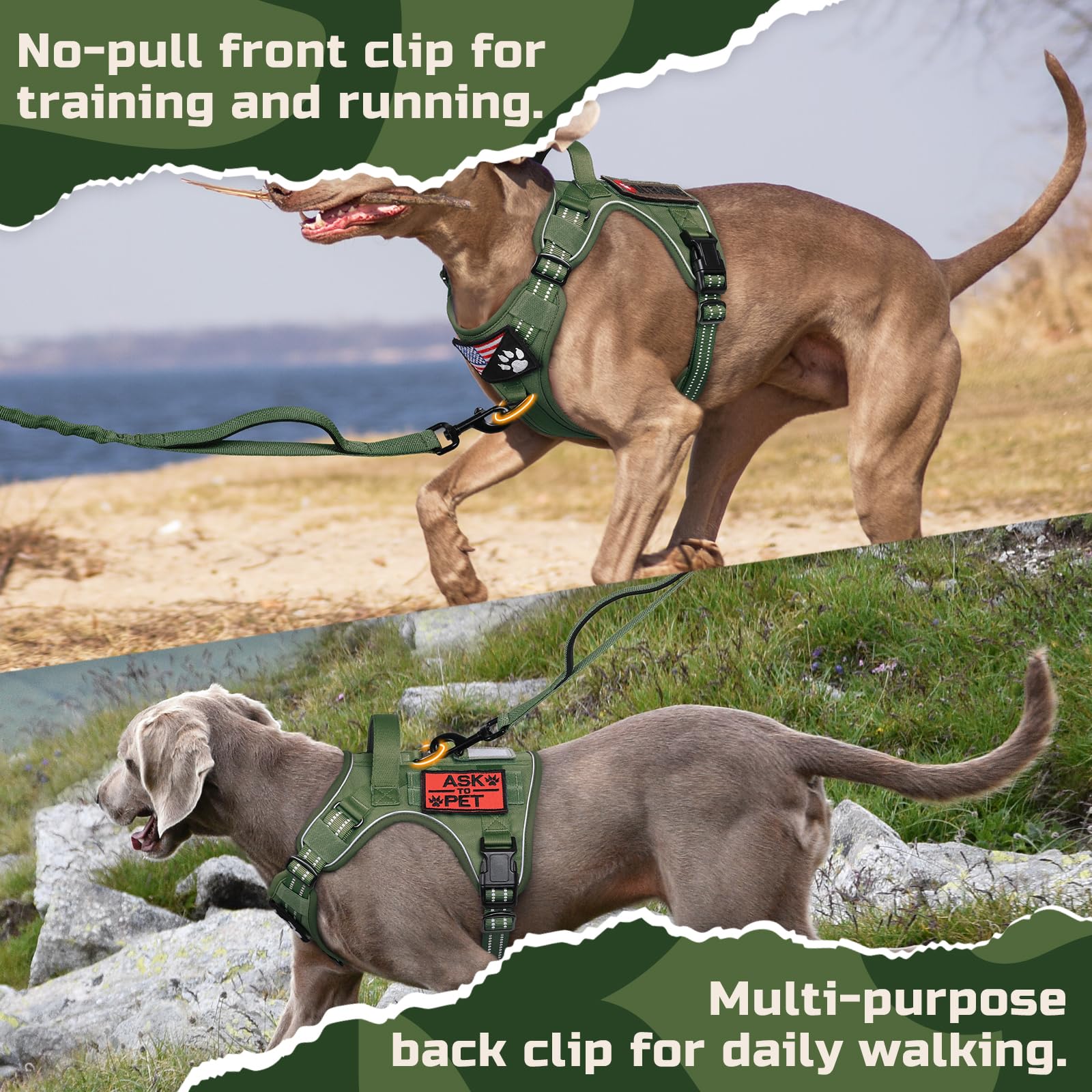 Ultra Safety Design: The reflective trims all around the tactical dog harness for optimal visibility and security at night. Two secure metal leash attachments for different occasions. Daily back clip for well-trained dog's casual walking or jogging. No-pull front clip helps discourage your dog from pulling