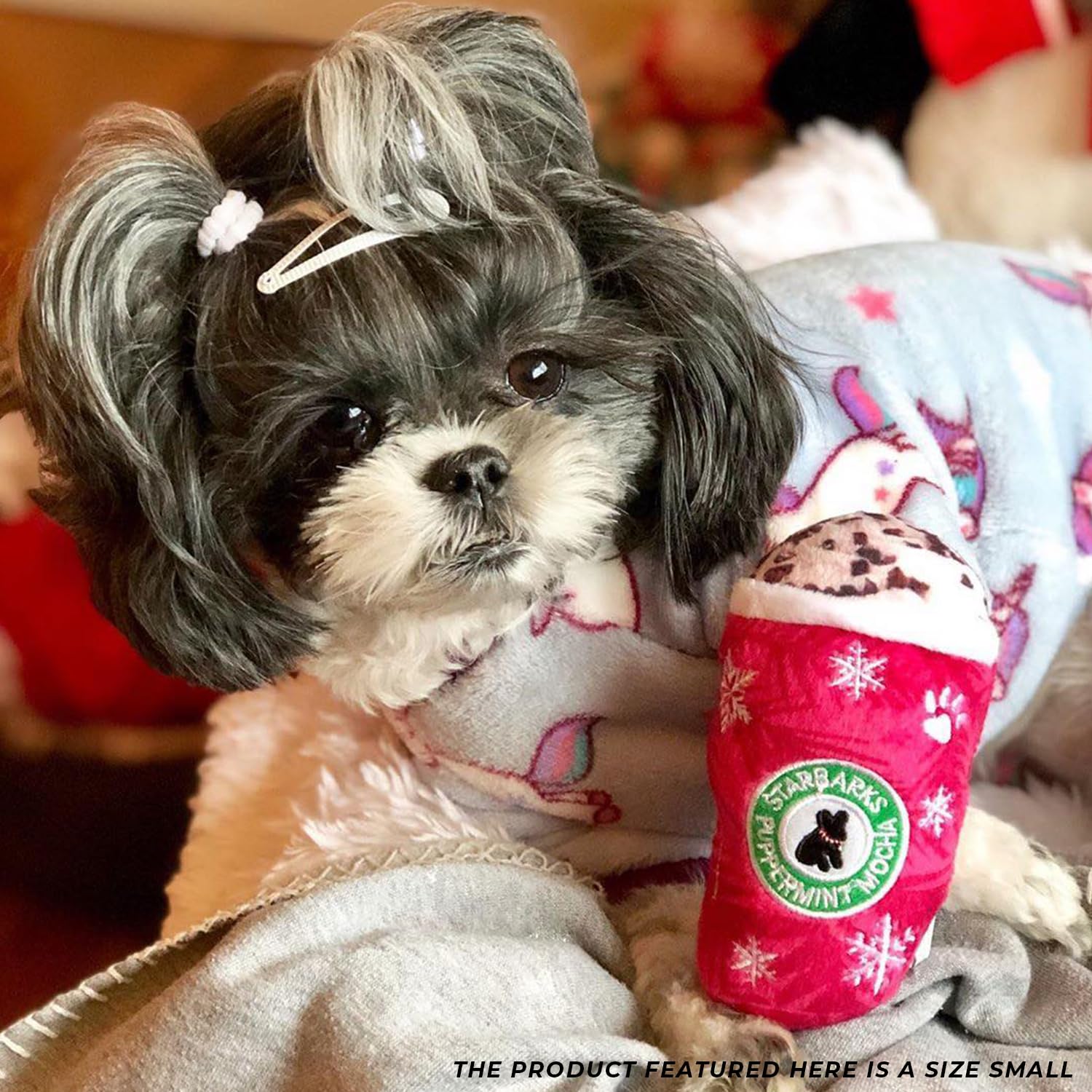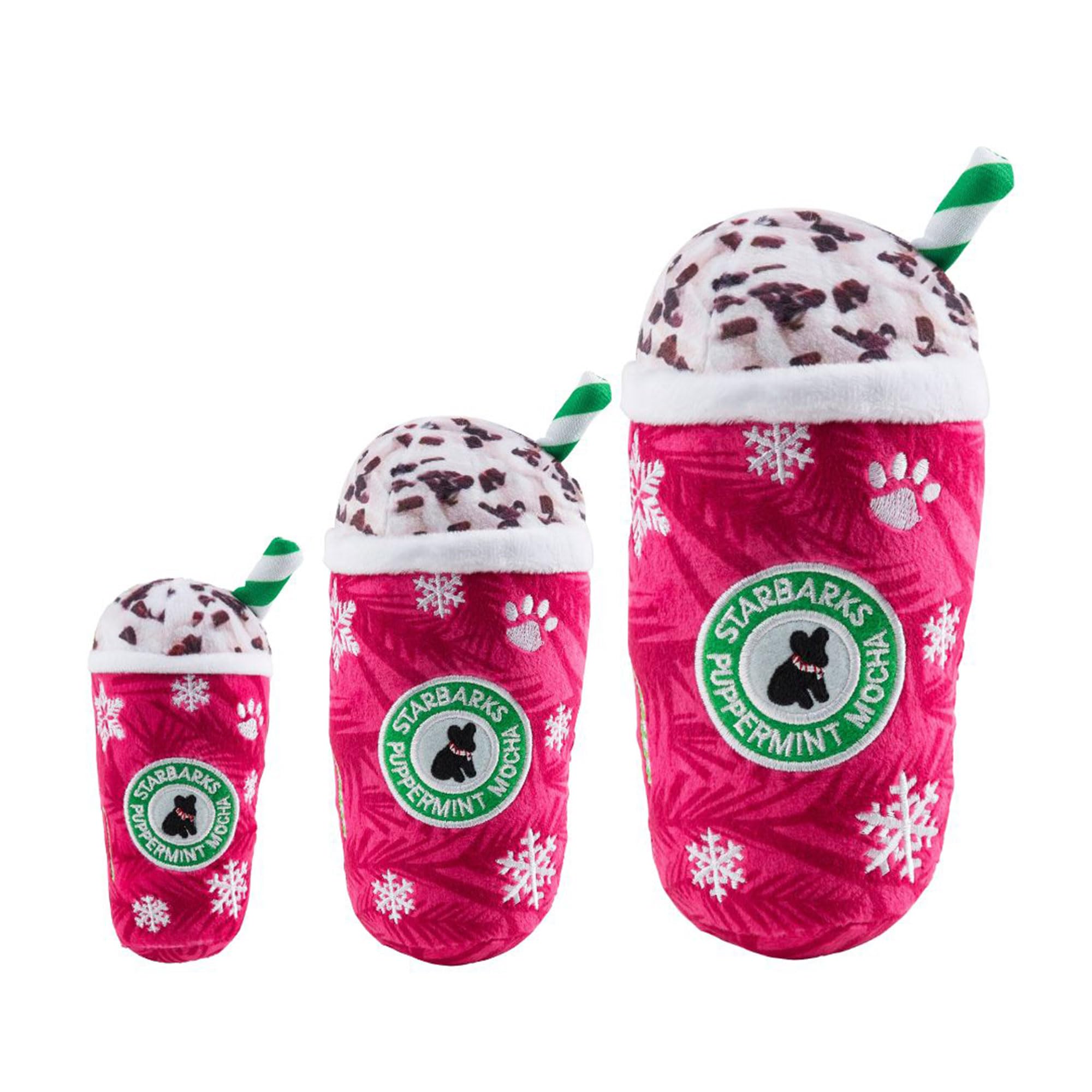 Funny Parody Plush Dog Toy: Perk up your pooch with our Starbarks Puppermint Mocha dog toy. This dog toy features a holiday-themed red and white plush exterior with a built-in squeaker hidden inside. It’s a fun, cute interactive dog toy that will warm up those winter nights! Size Small 5"x4"x1.5".
