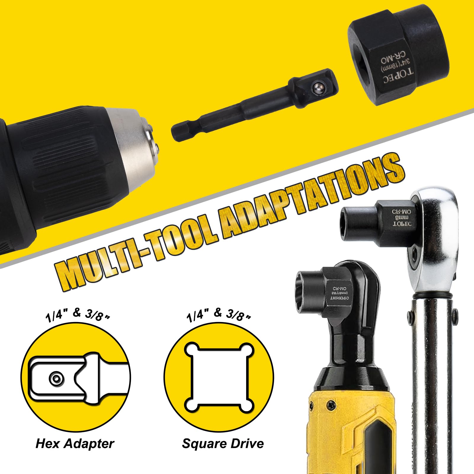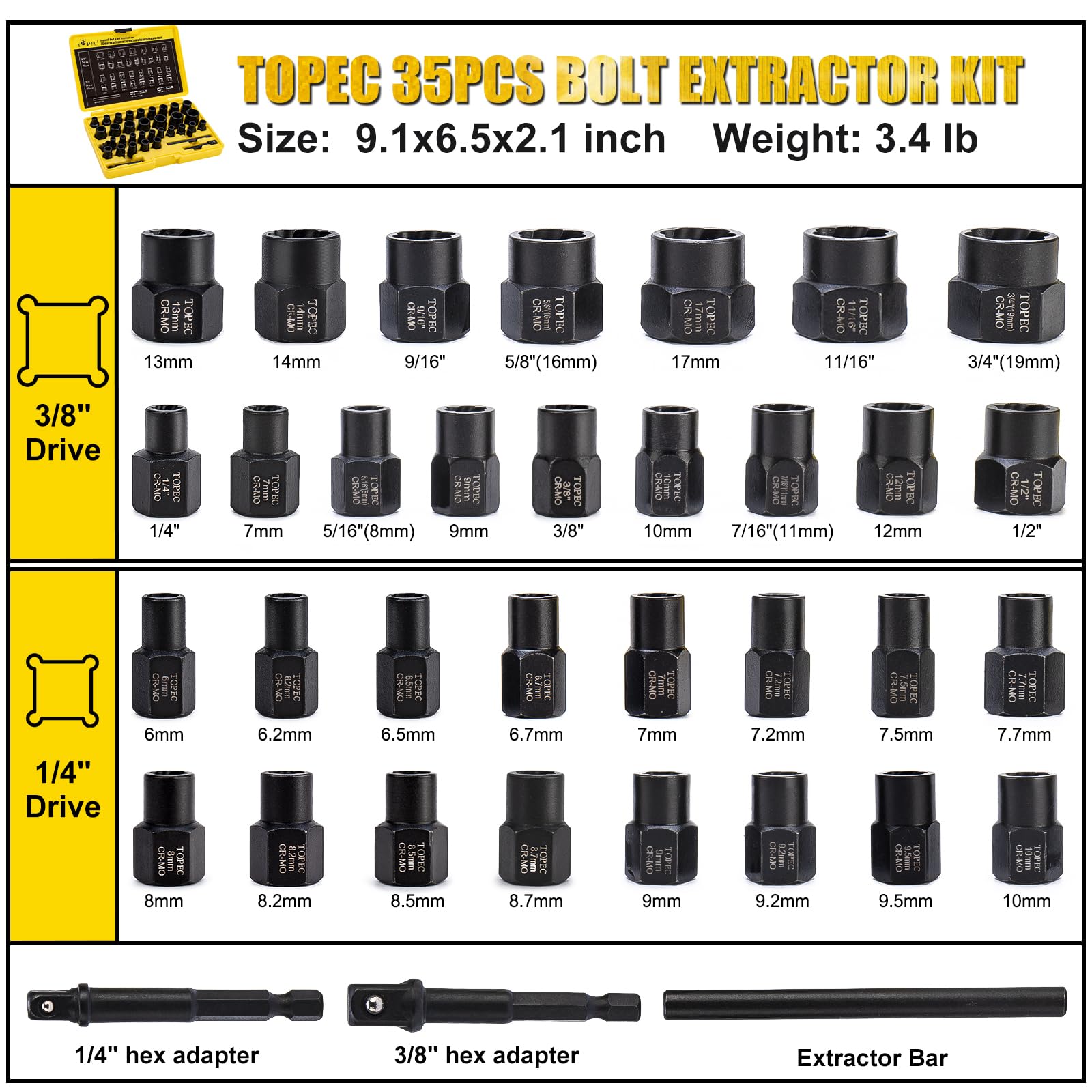 Complete Size Range: 16-piece 3/8-inch drive lug nut remover tool, Metric & SAE from 1/4" to 3/4"(19mm); 16-piece 1/4-inch drive broken bolt extractor kit, Metric from 6mm to 10mm; with a 1/4" hex adapter, a 3/8" hex adapter and a knockout pin.