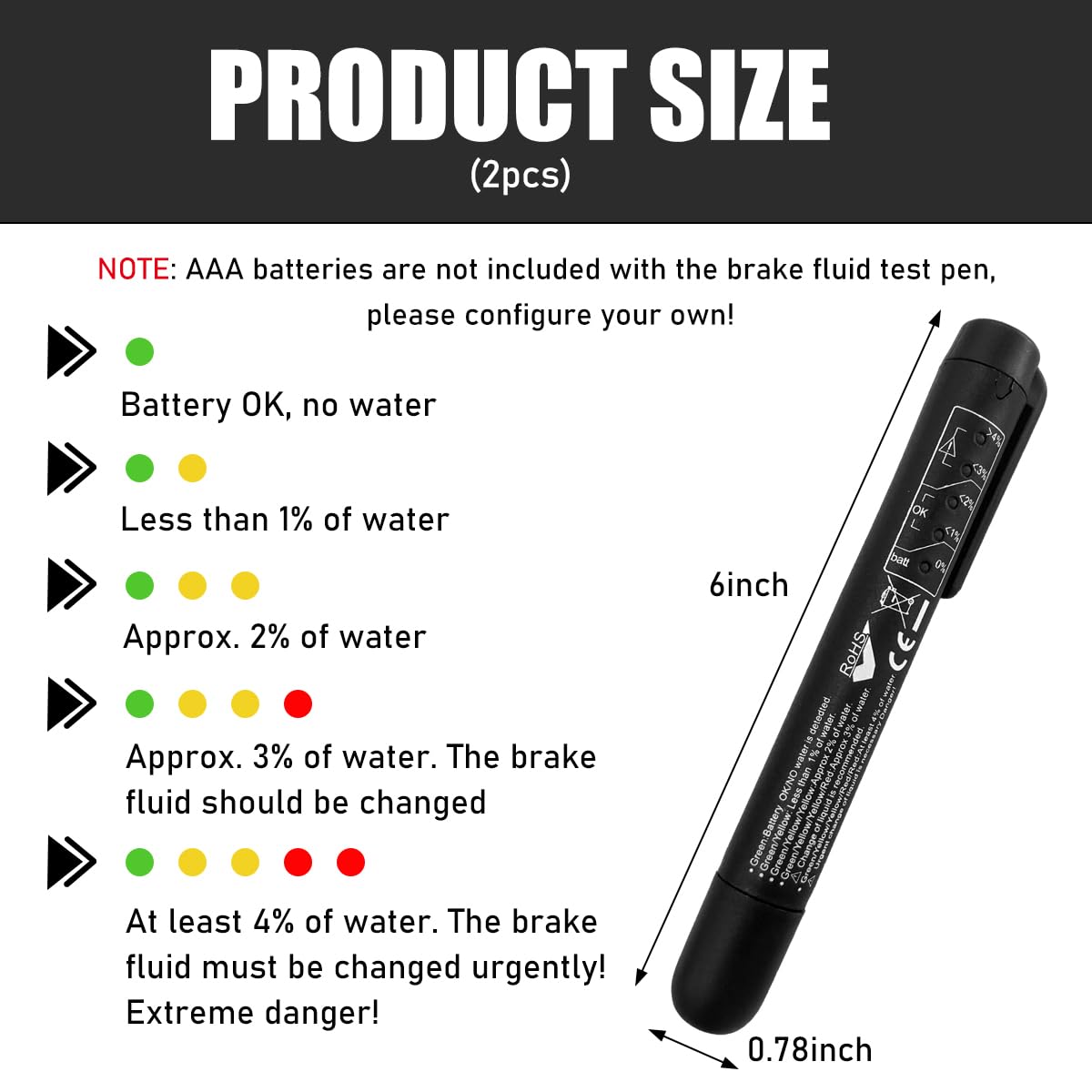 【Scope of Application】: Our brake fluid test pen is suitable for DOT3, DOT4, DOT5.1 brake fluid moisture percentage testing. In addition, it a requires AAA batteries to work. But please note that the battery is not included in the package, so you need to buy it separately.