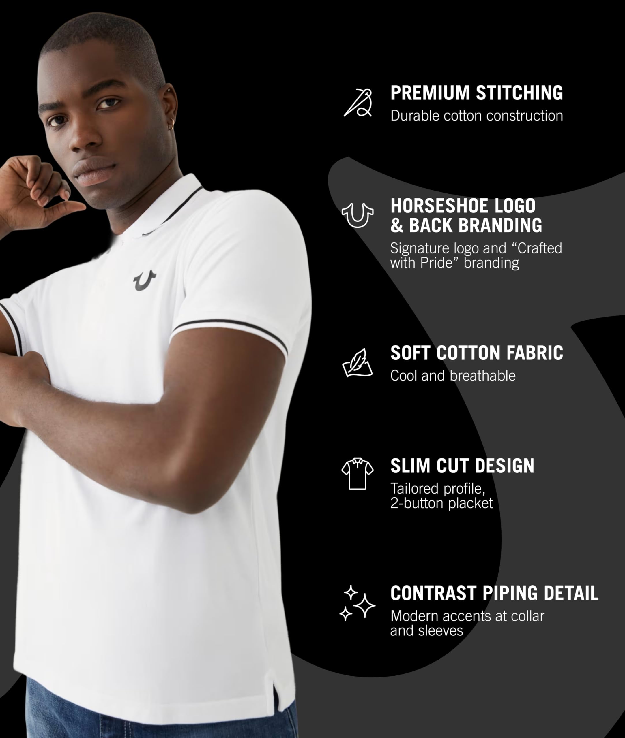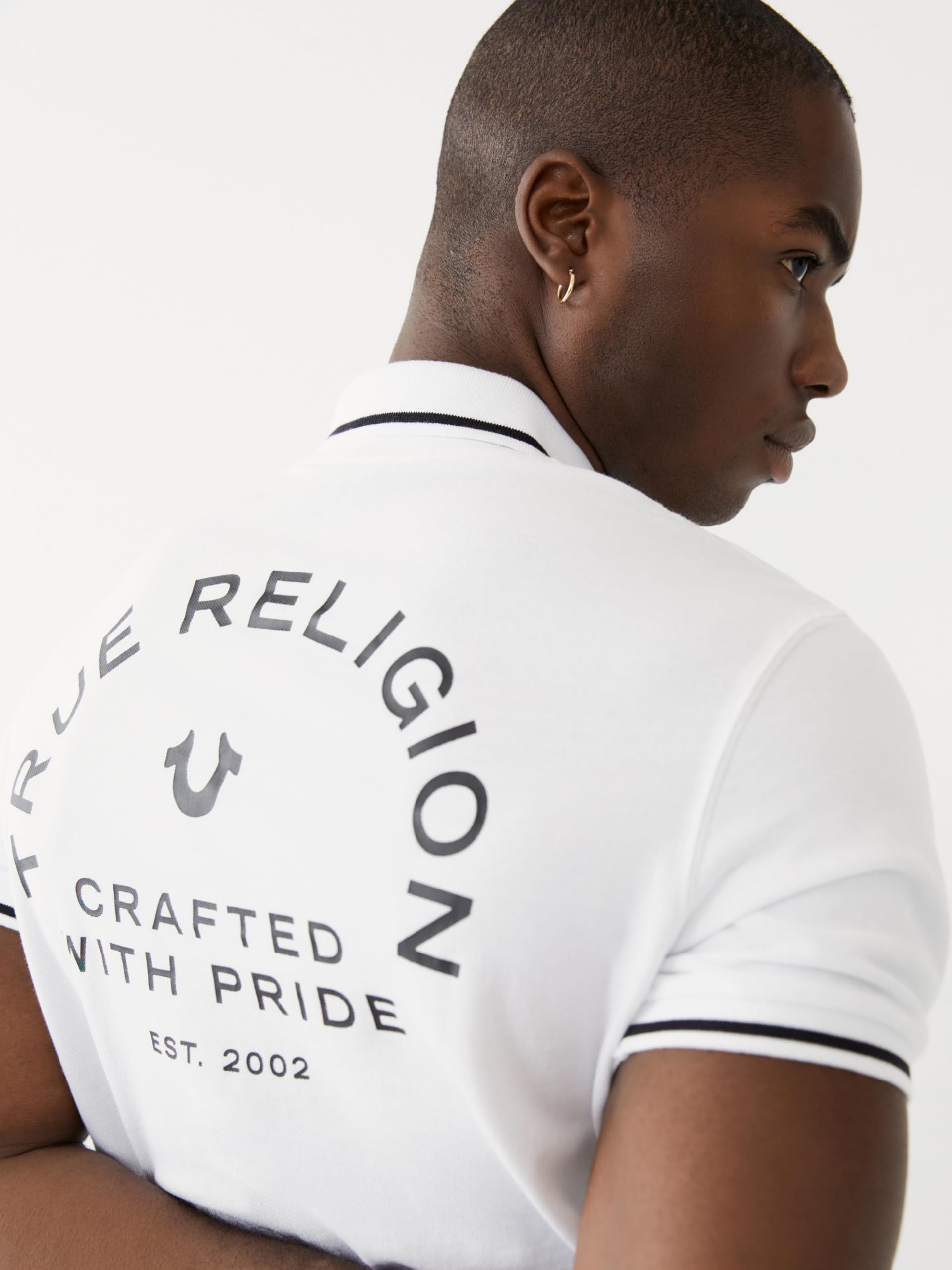 Description The True Religion Men’s Crafted with Pride Polo blends premium comfort with modern style, making it a must-have in men's polo shirts collections. Designed from soft cotton, this slim fit piece provides breathable comfort while maintaining its structure. A 2-button placket and polo collar give it a polished look, while contrast piping at the collar and sleeves adds standout detail compared to standard mens shirts. Signature elements like the embroidered horseshoe chest logo and “Crafted with Pride” back branding showcase True Religion’s craftsmanship. Perfect for casual weekends, workdays, or evening outings, this versatile option ranks high among polo t shirts for men, offering a reliable mix of durability, comfort, and standout style. Available in multiple colors and sizes, it’s built for everyday wear and lasting appeal among shirts for men.