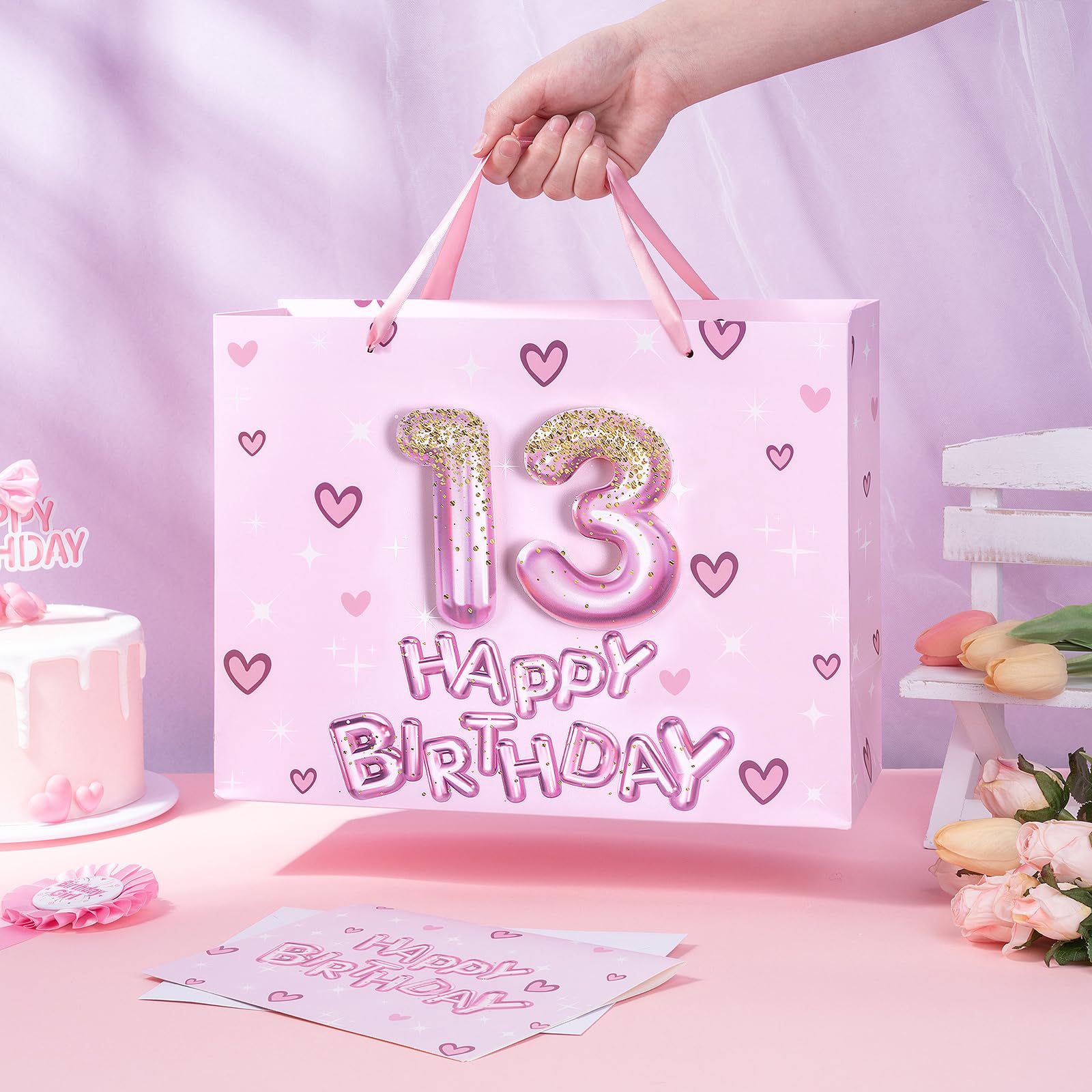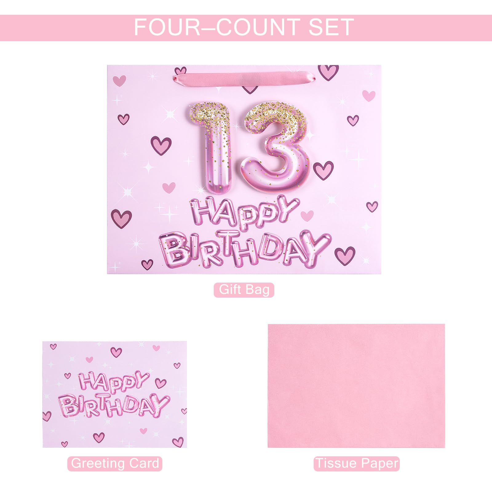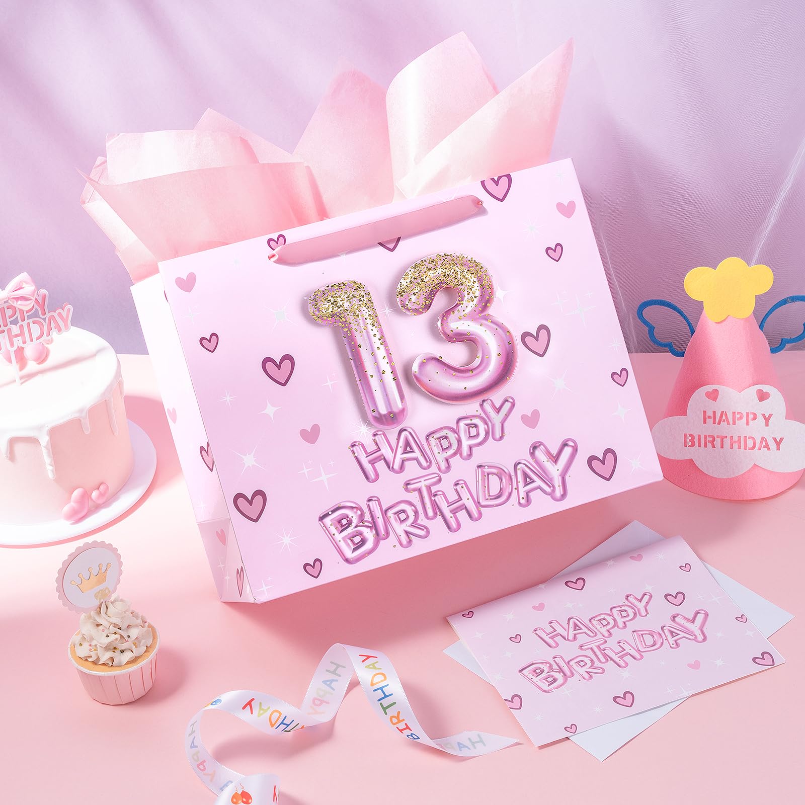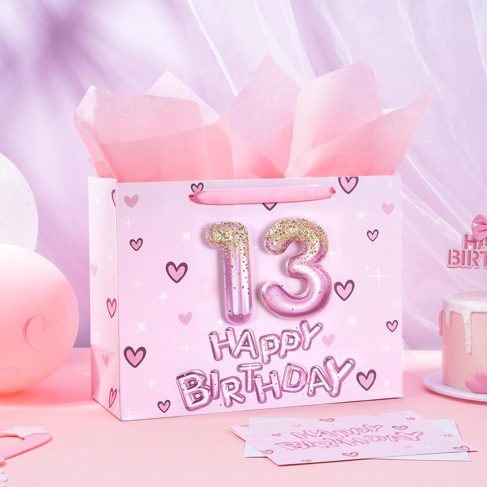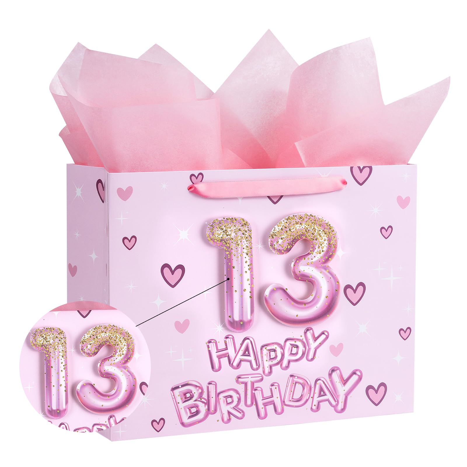 BIRTHDAY DESIGN: Gift bag printed 3D pink number 13 balloons, hearts and "HAPPY BIRTHDAY" text on pink background comes with nice ribbon handles and supportive reinforced bottom, making it perfect for girls' celebrations