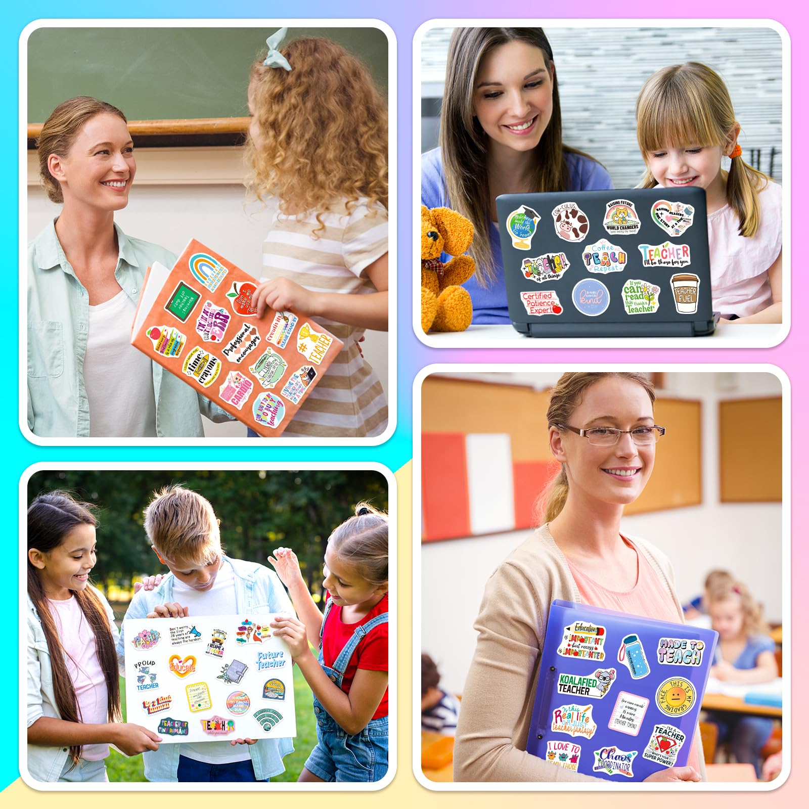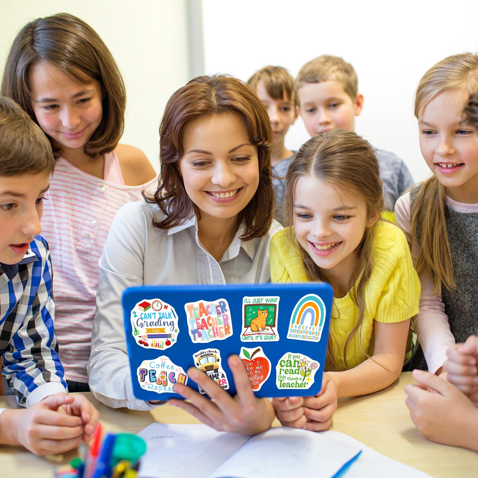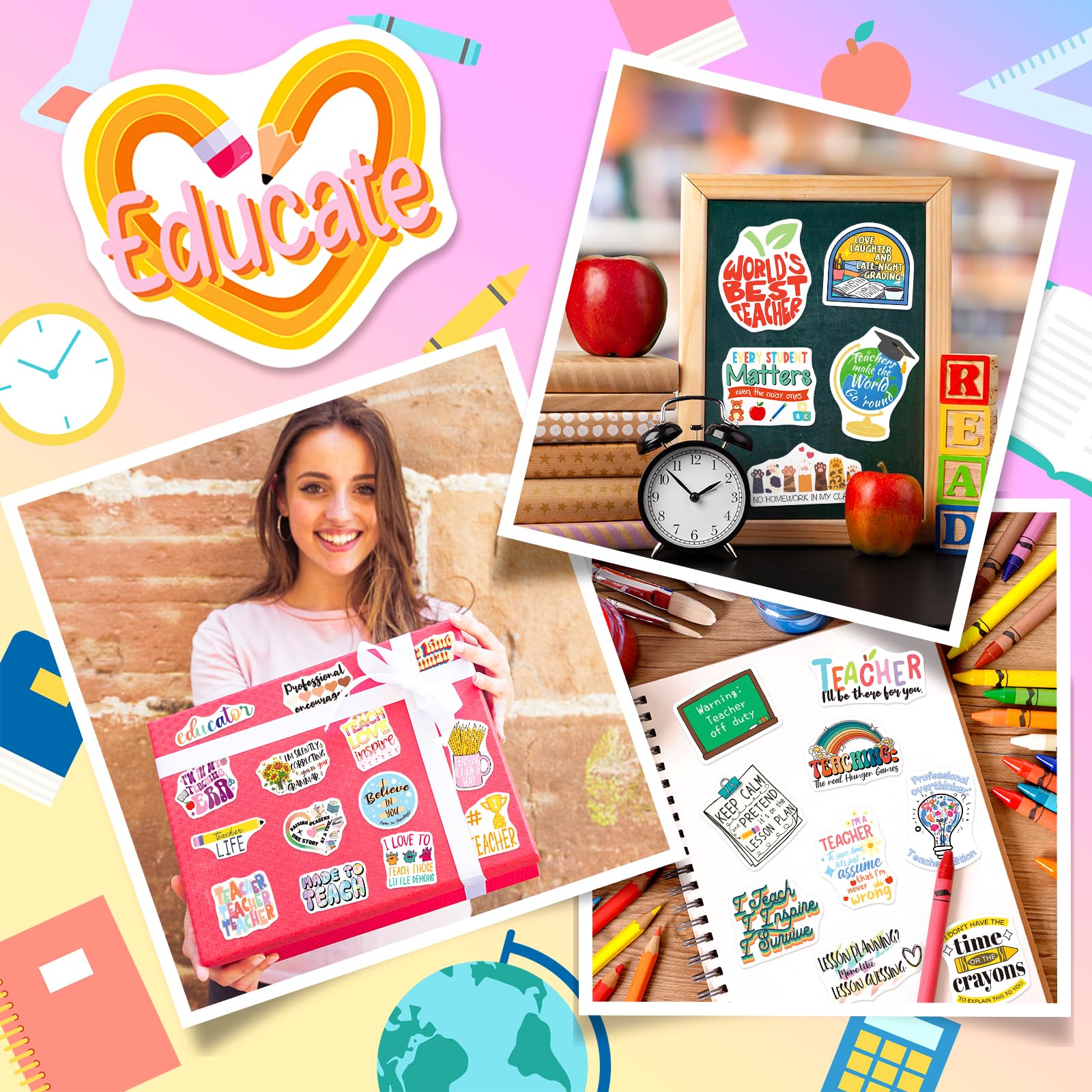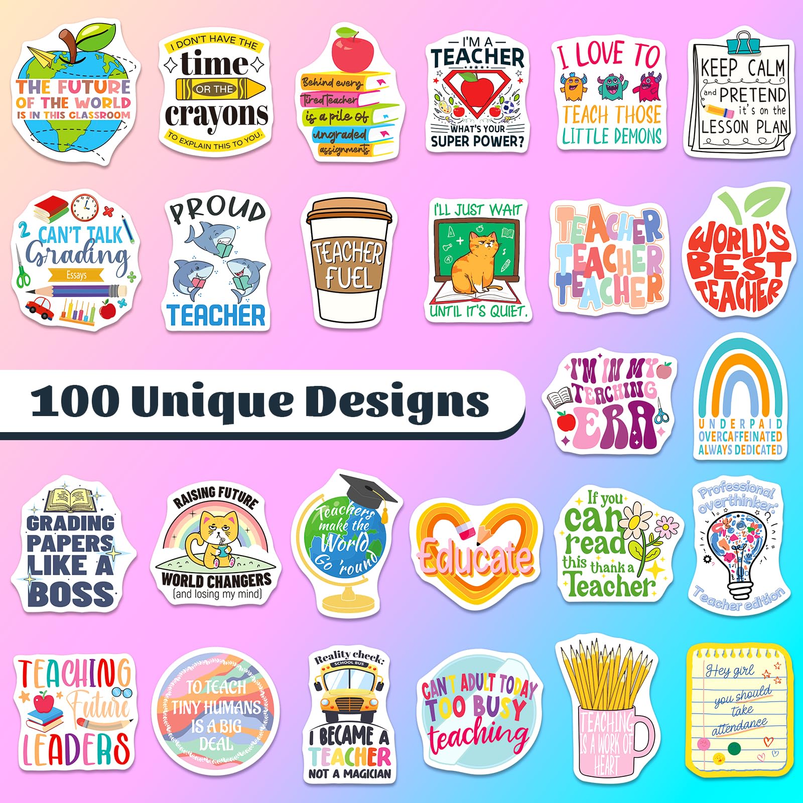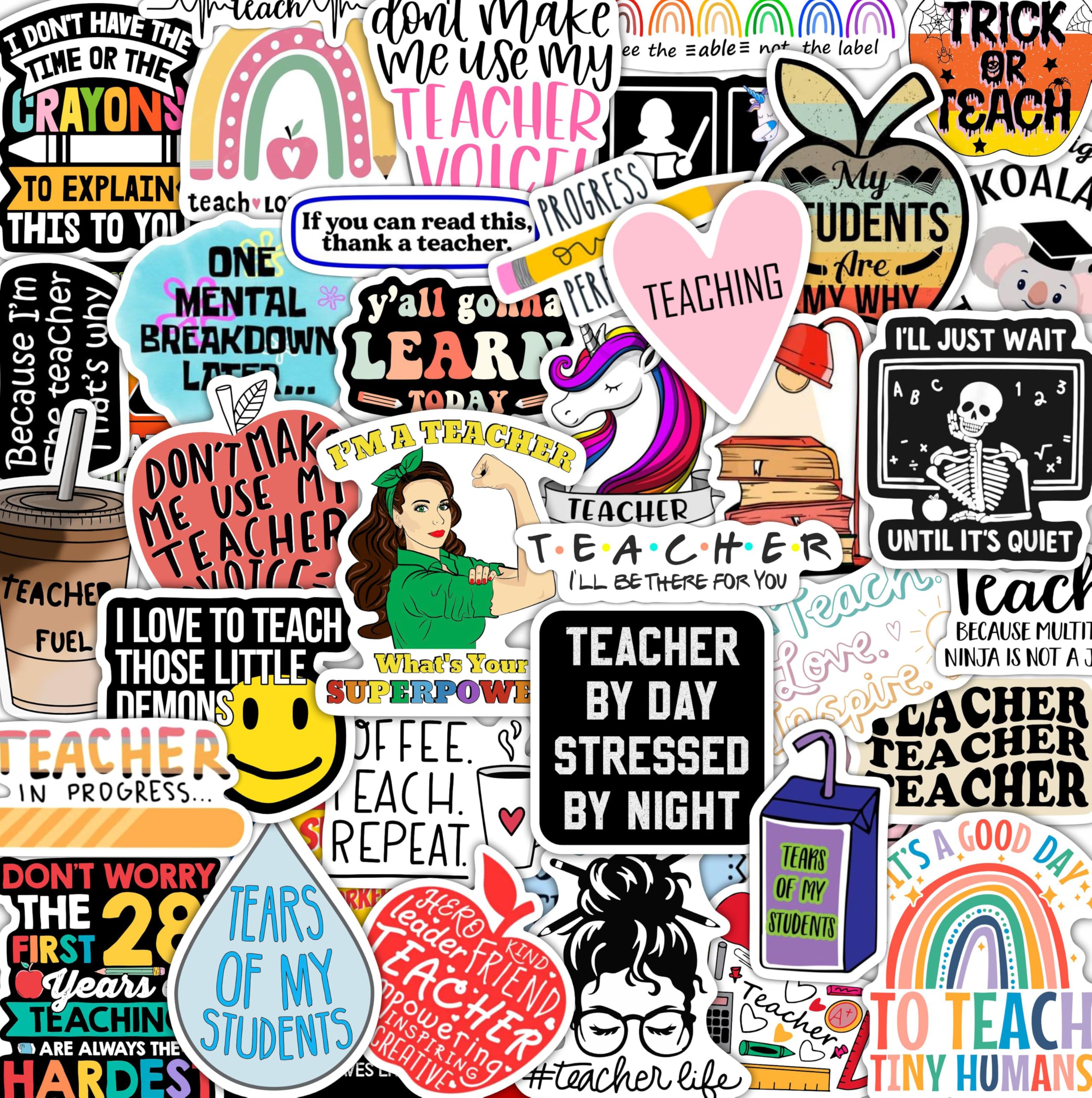 Funny Teacher Stickers: This set includes 200 vibrant stickers featuring 100 unique designs. With bright colors and school-friendly themes, these teacher stickers bring positivity to every teaching moment.