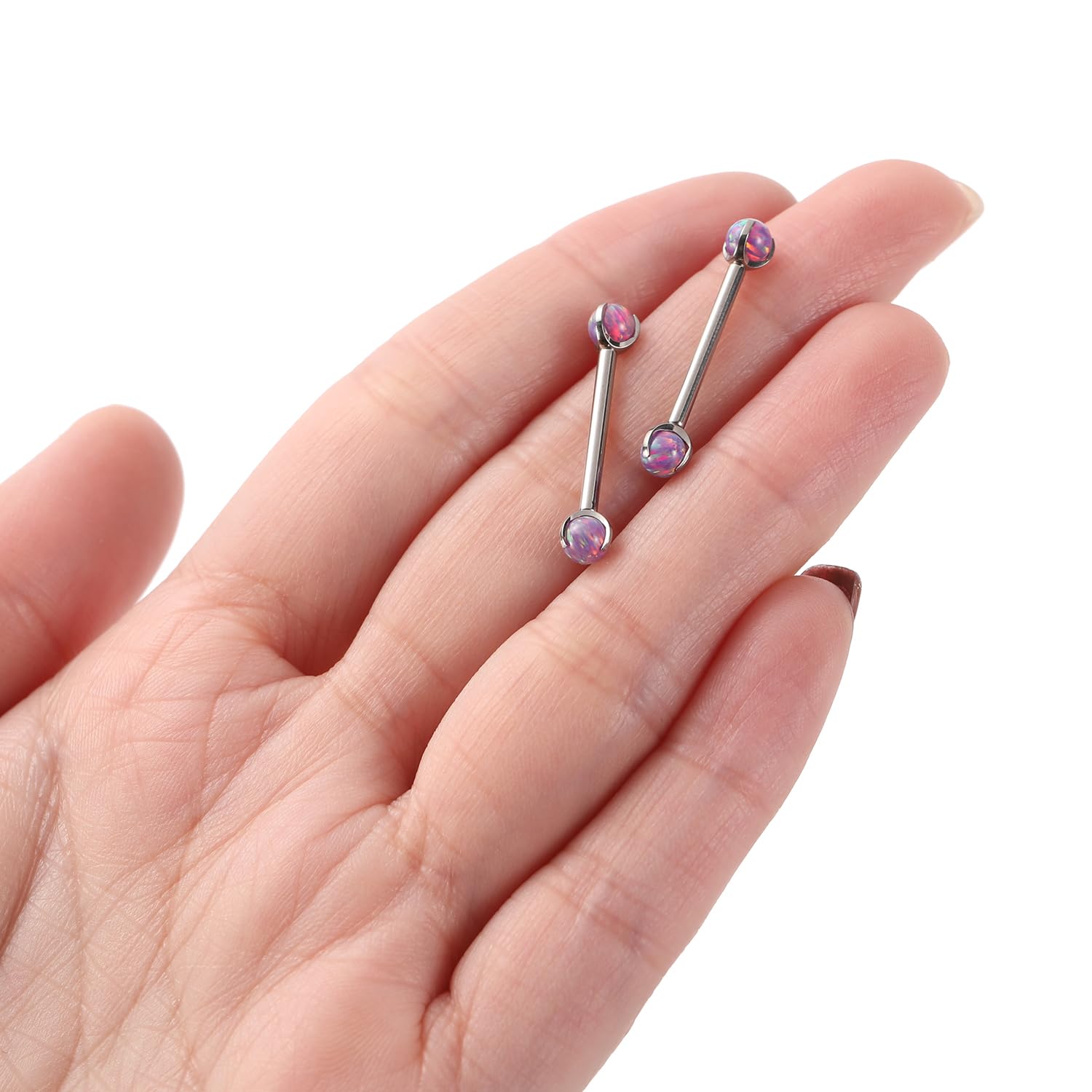 14 G Nipple Jewelry Gauge: 14 G(1.6 mm); Nipple Barbell Length: 5/8"(16 mm); Ball Size: 4 mm; Color: Silver; Opal Color: Purple