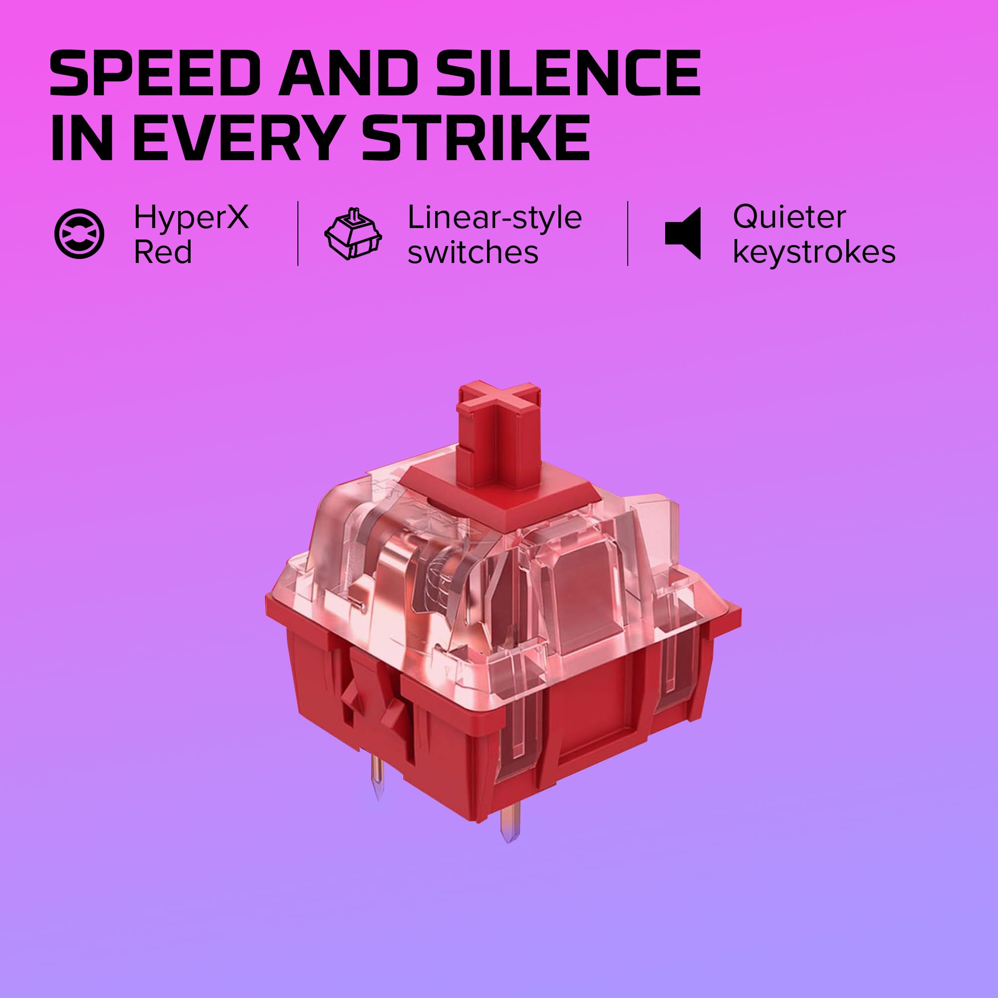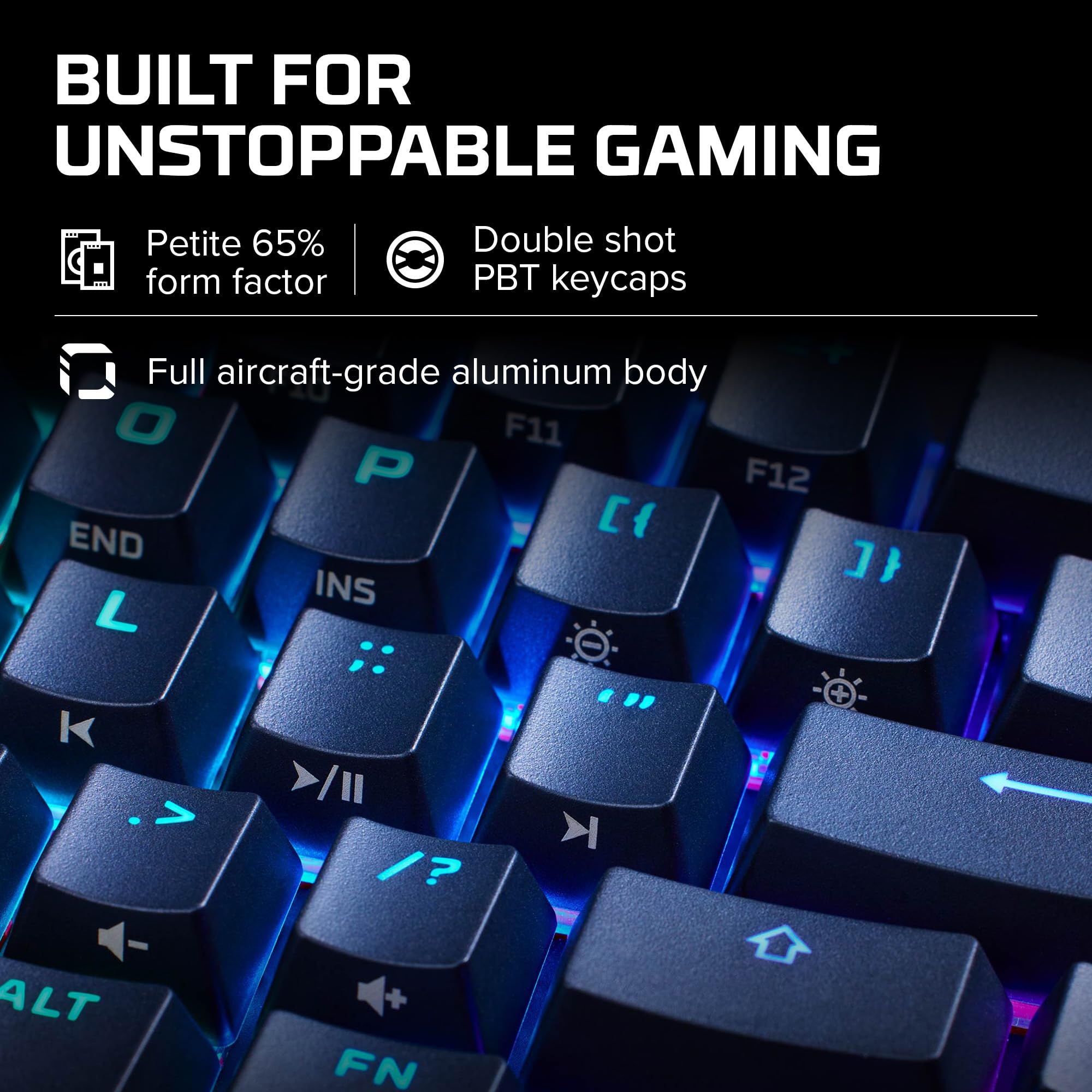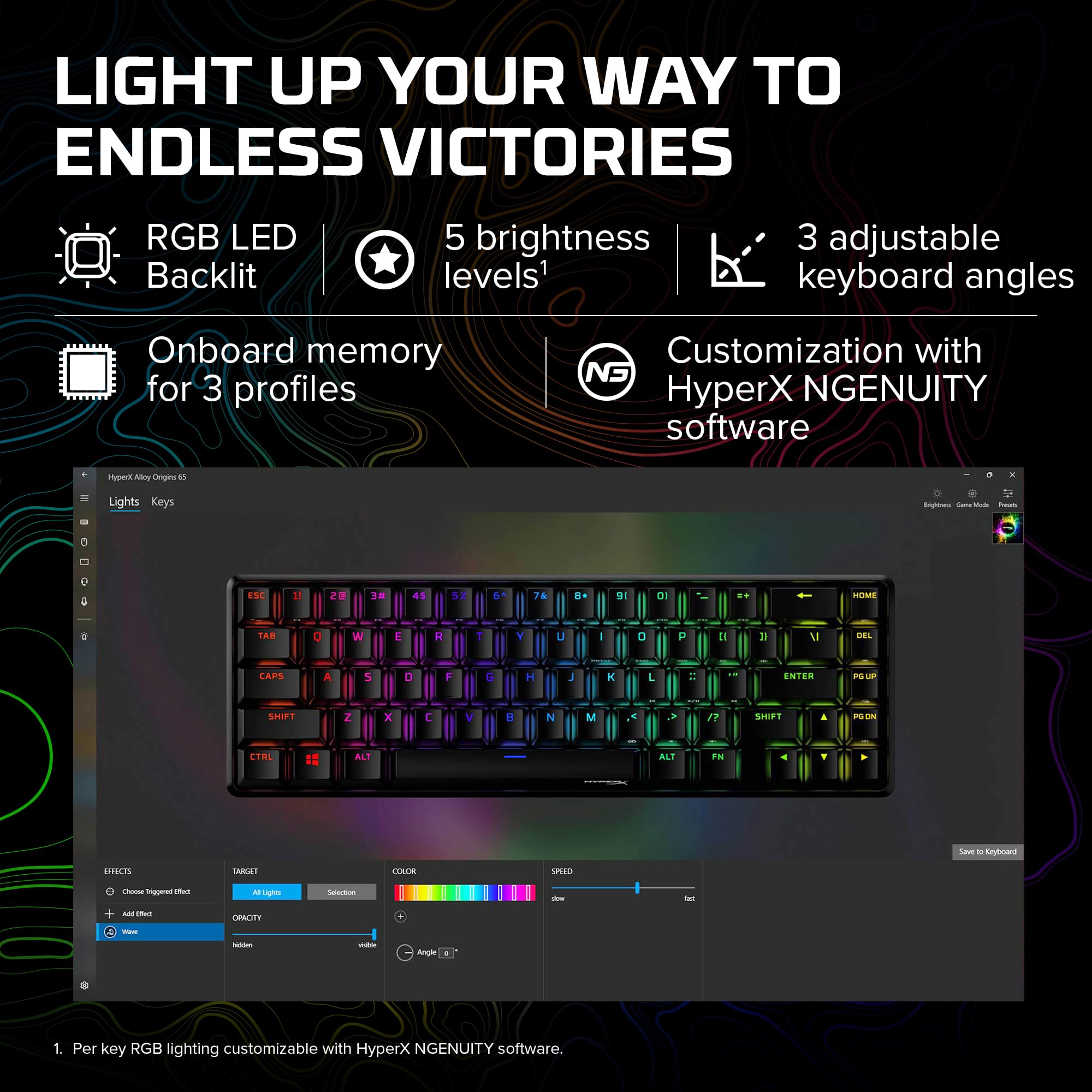 Functionally compact 65% form factor An optimized balance of compactness and functionality. The 65% form factor frees up more mouse space than a tenkeyless keyboard, but keeps dedicated arrow keys, Page Up/Down, Home, and Delete keys. Full aircraft-grade aluminum body The aluminum casing keeps the keyboard structurally sound and stable when the action gets intense and the game hangs in the balance; battle after battle, night after night. Double shot PBT keycaps with side-printed secondary functions The keycaps are designed with durable PBT material that is resistant to wear, friction, and solvents. Secondary functions are printed on the sides of the keycaps for quick recognition. HyperX Mechanical switches The keycaps are designed with durable PBT material that is resistant to wear, friction, and solvents. Secondary functions are printed on the sides of the keycaps for quick recognition. RGB backlit keys with radiant lighting effects Get brighter, more luminous RGB lighting, thanks to the exposed LED design of the HyperX mechanical switches. Advanced customization with HyperX NGENUITY Customize Game Mode, build macros, and set up per-key lighting and effects. Three adjustable keyboard angles and detachable USB-C cable Two-step keyboard feet allow you to set your keyboard up at 3 different tilt angles. A detachable USB-C cable makes this ultra-compact keyboard super portable. Included keycap puller and additional keycaps A keycap puller, an additional Esc key, and the special alternate spacebar design for the Alloy Origins 65 are included for additional customization.