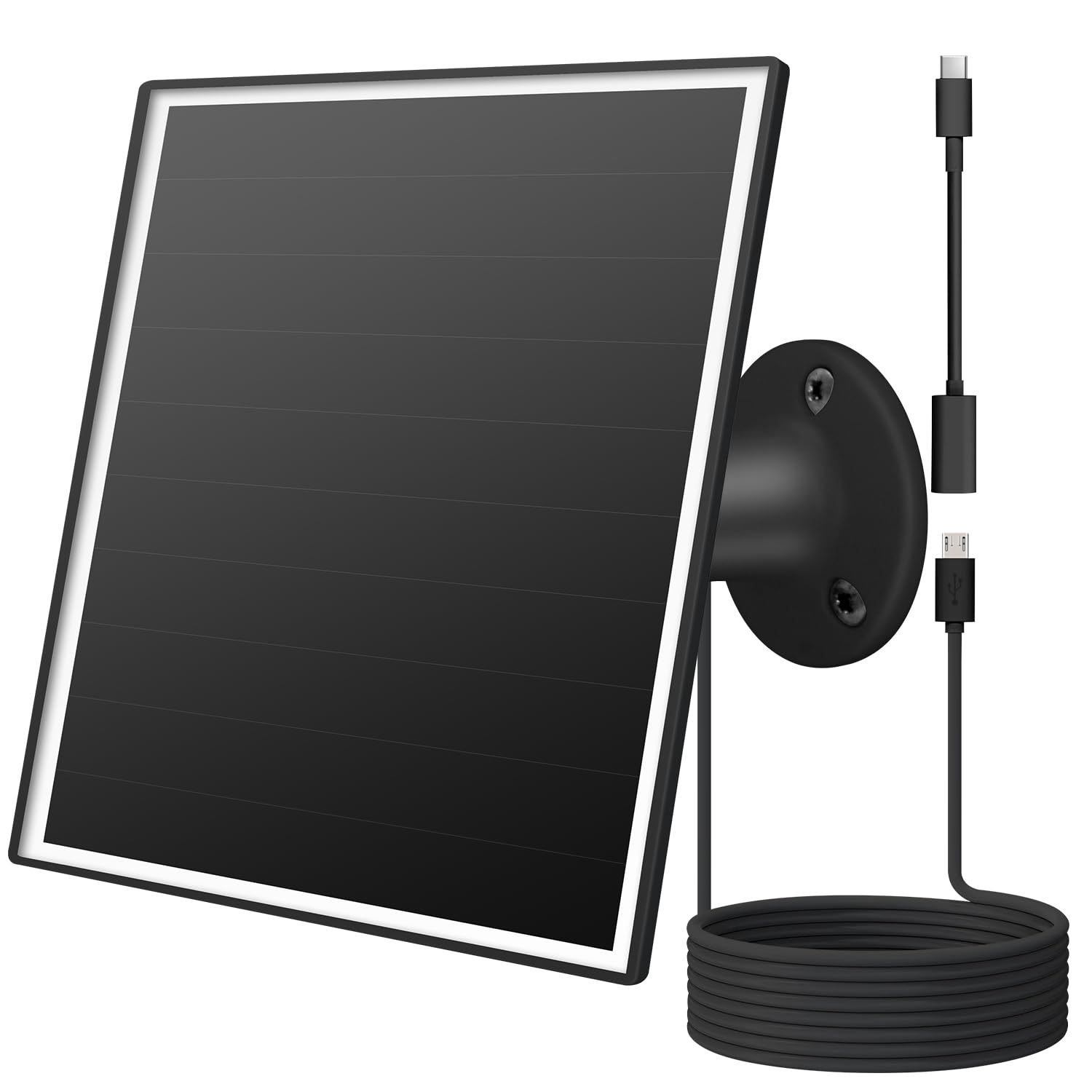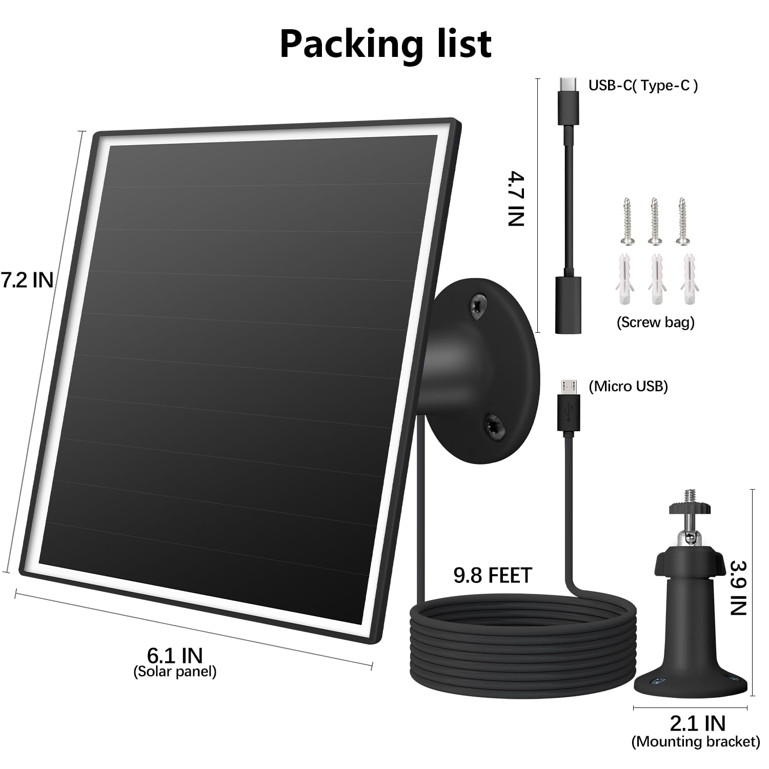 【Easy to Install】:Complete installation accessories are provided. You can install the solar panel with just 3 screws. The package includes: 6W solar panel, 360° adjustable mounting bracket, screws kit, manual, Micro USB/USB-C interfaces.