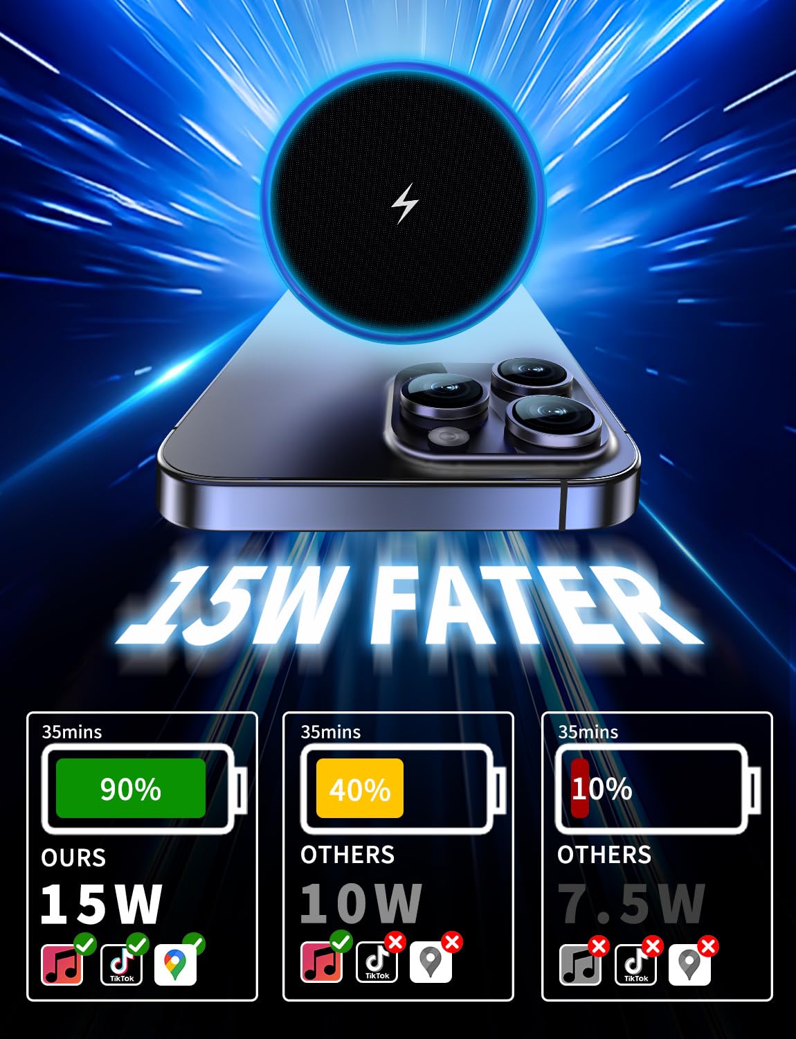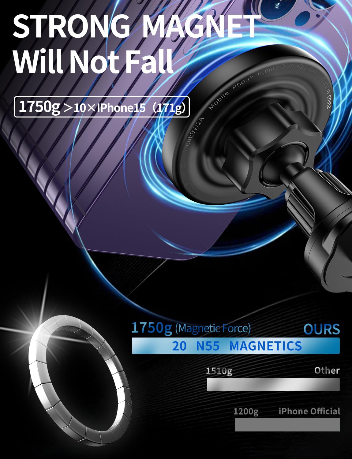 【Upgraded Magnetic Power】Experience a secure and reliable magnetic connection that firmly locks your phone in place, ensuring it stays steady even on bumpy roads. With its strong hold, you can enjoy hassle-free charging and worry-free driving without any interruptions or the risk of your phone slipping
