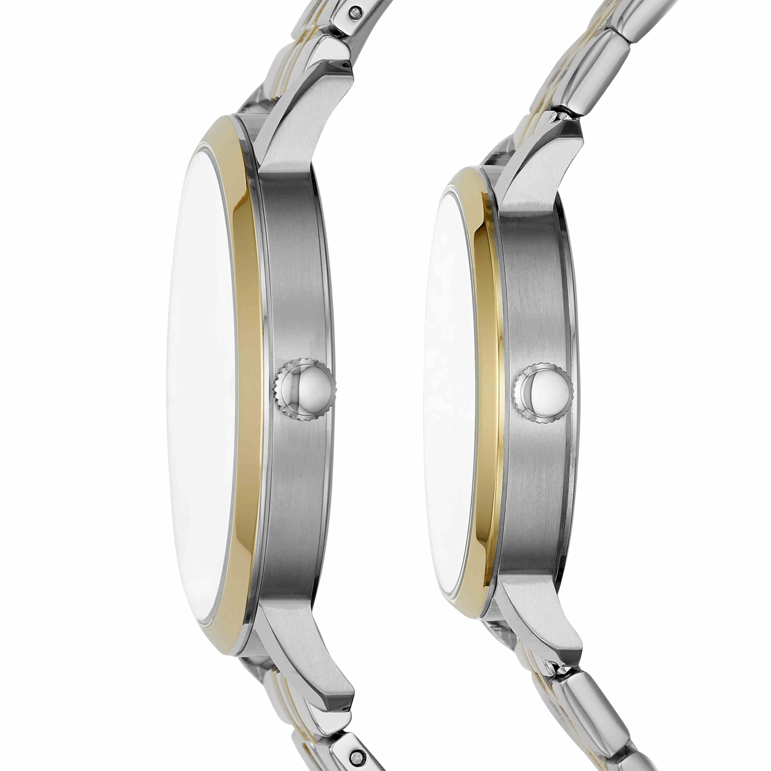 Description This gift set features 44mm and 34mm Lux Luther watches, matching silver sunray dials with a genuine diamond at the 12-hour marker, three-hand movement and two-tone stainless steel bracelets. Sku: BQ2467SET Case Size: 44MM Movement: Quartz Platform: LUX LUTHER Strap Material: Stainless Steel Strap Color: 2T Silver/Gold Case Water Resistance: 5 ATM Case Material: Stainless Steel