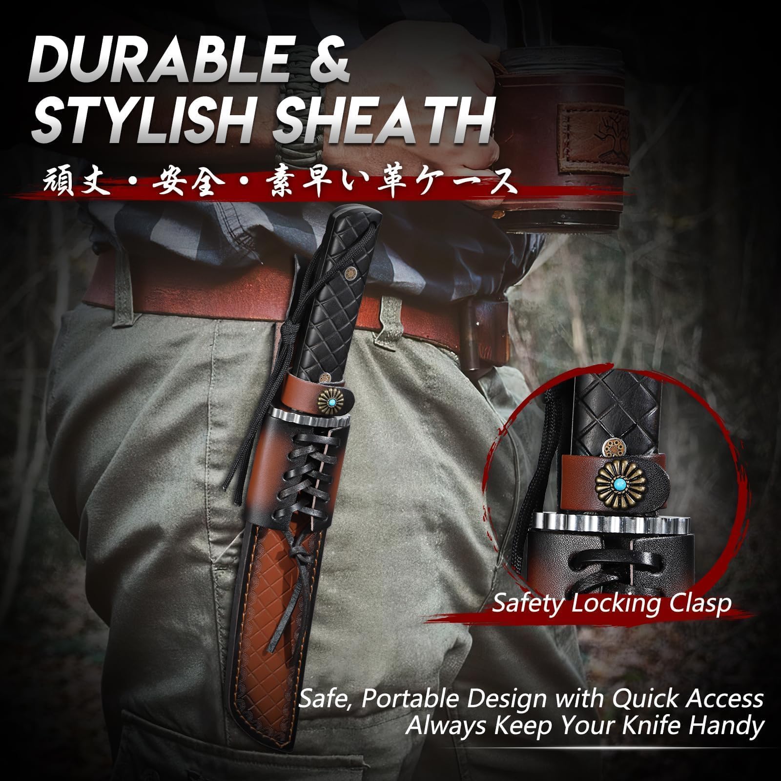 Quick-Draw Sheath: Retro design with reinforced belt loop ensures secure carry and quick access, combining rugged durability with practicality. Built for hiking and camping, it keeps the full tang bushcraft knife within easy reach