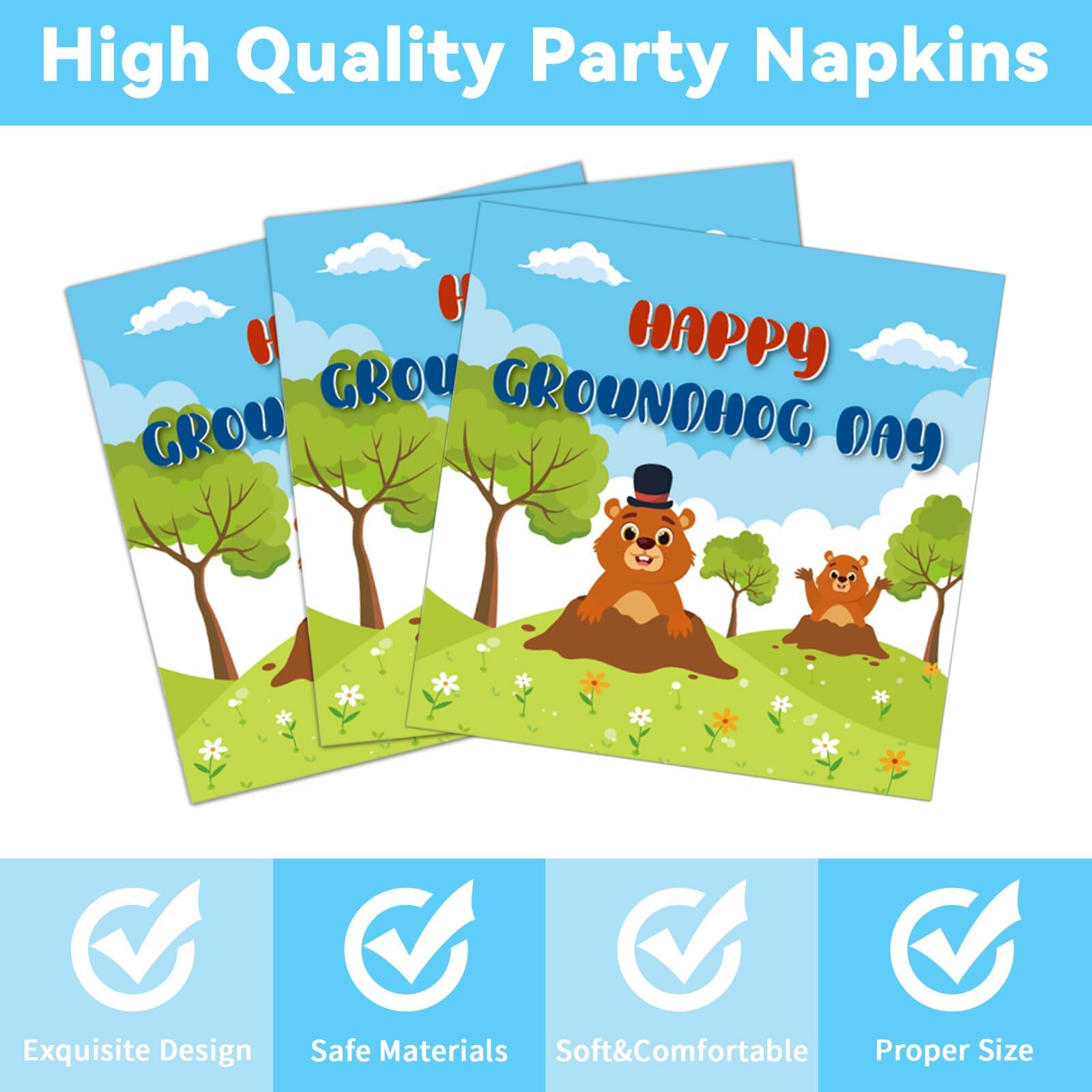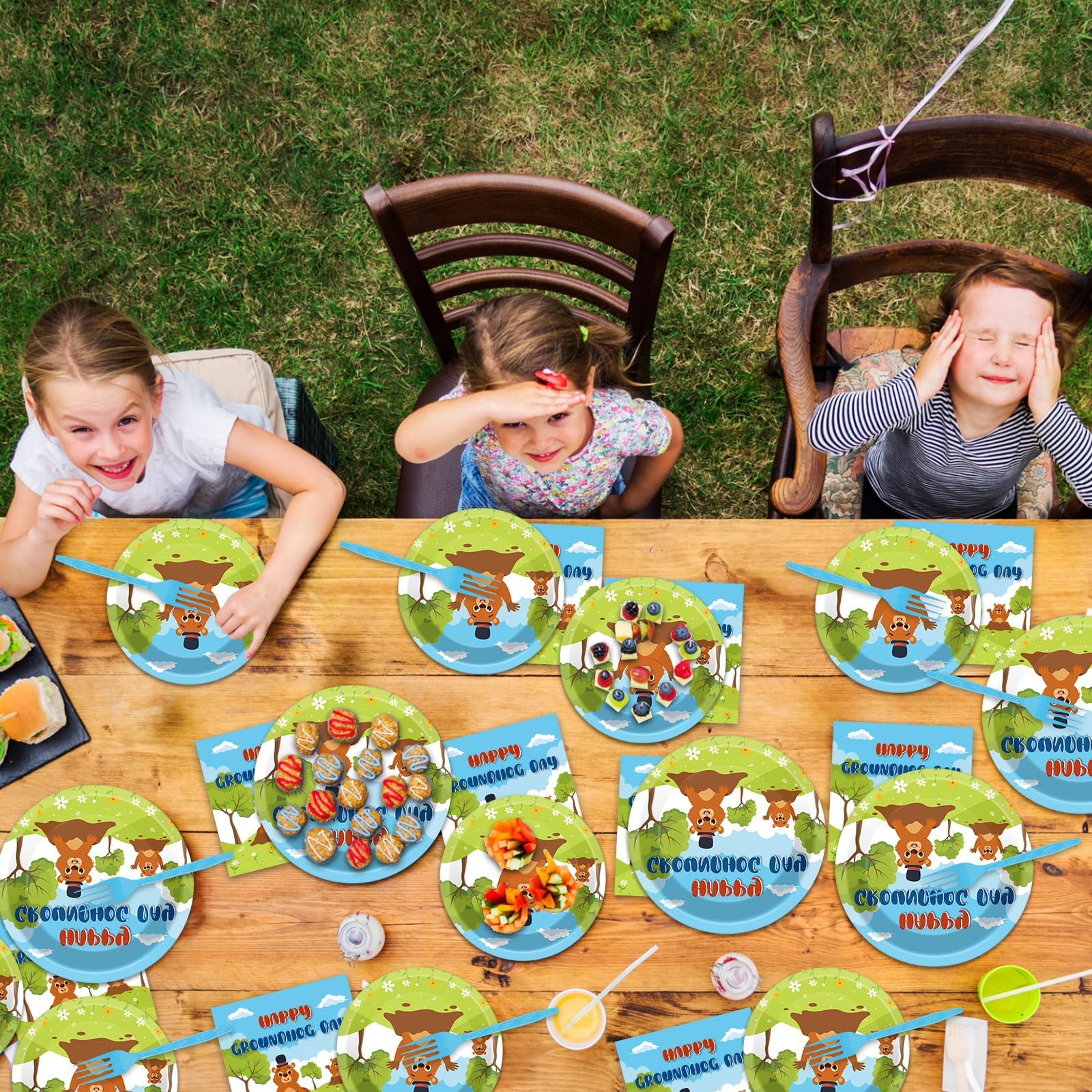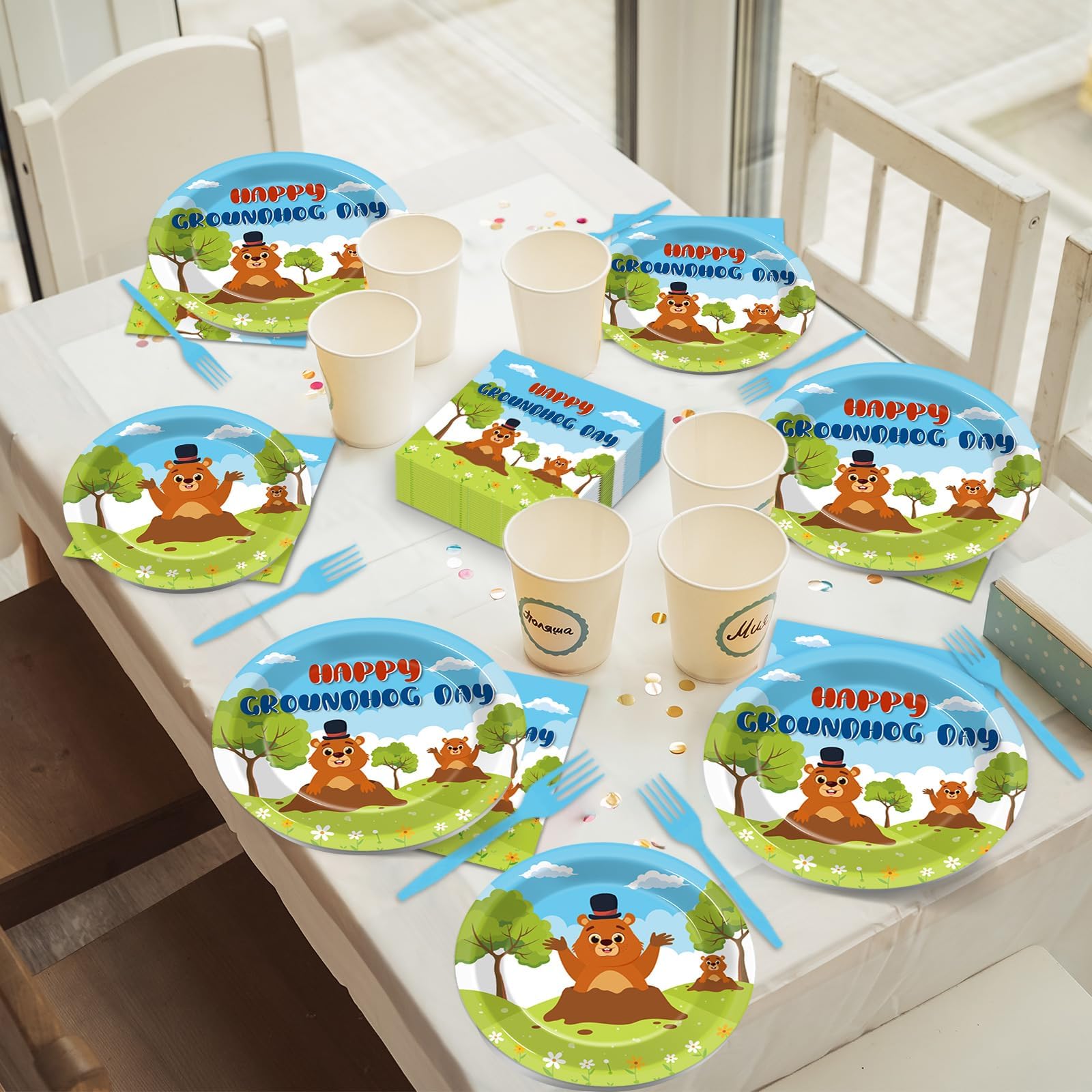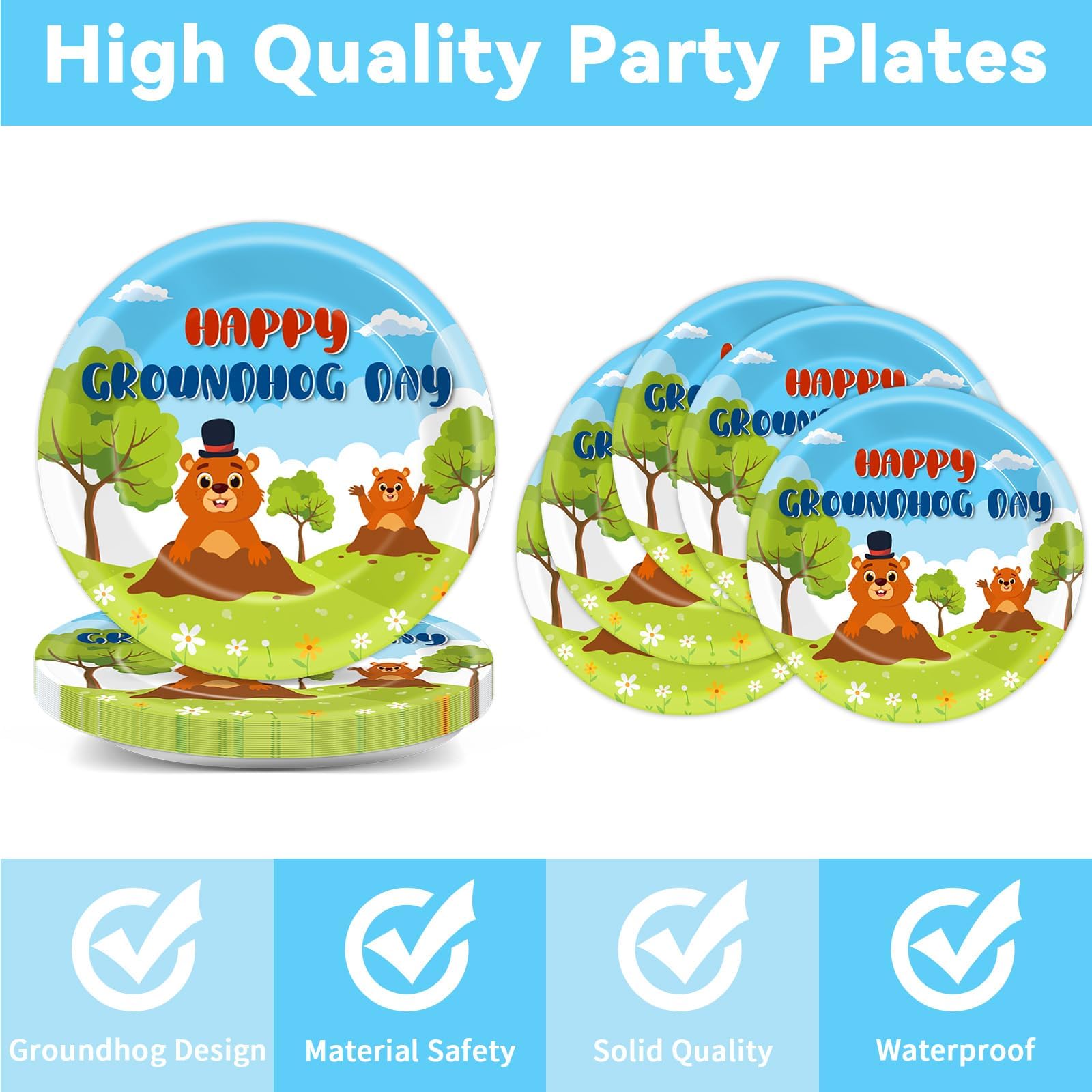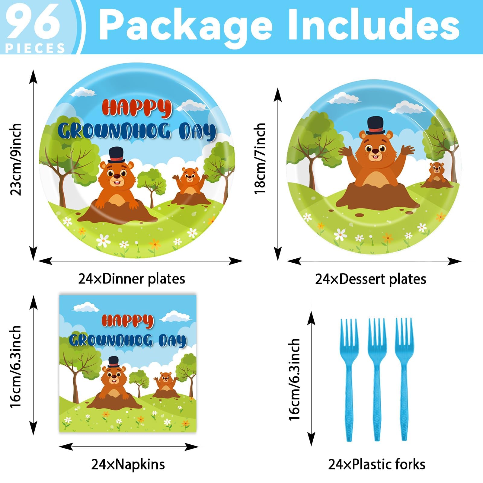 Package includes:Happy groundhog day tableware set includes 24 9-inch plates, 24 7-inch plates, 24 forks, 24 double-layered napkins. This set serves a perfect meal for 24 people.