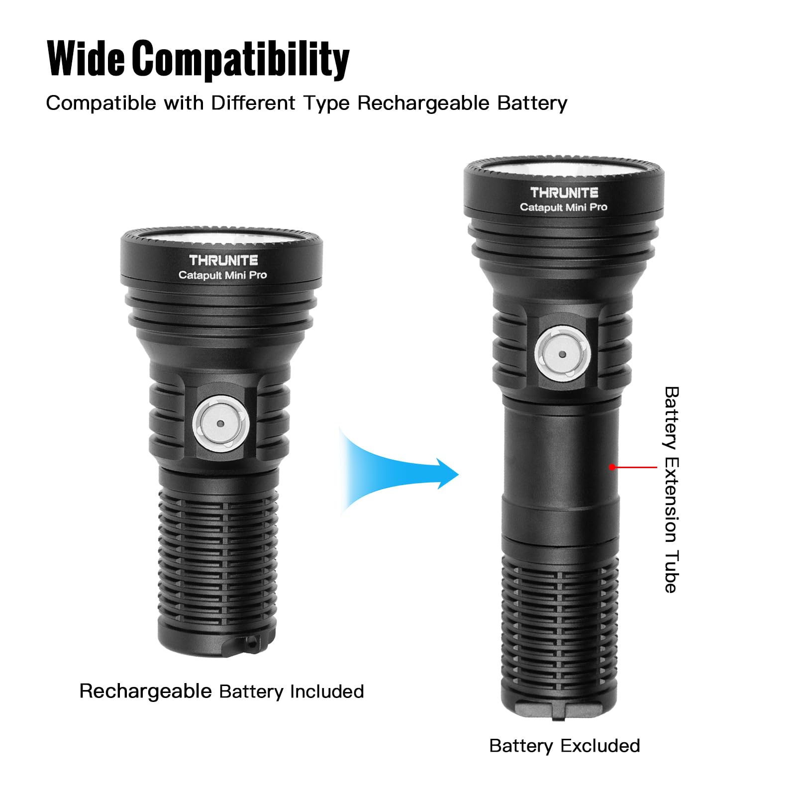 Wide Compatibility: Compatible with Two types Rechargeable battery.1*Rechargeable Battery contained in the flashlight.Included battery extension tube allows it to be powered by another high capacity battery, maximize the run time of the light.