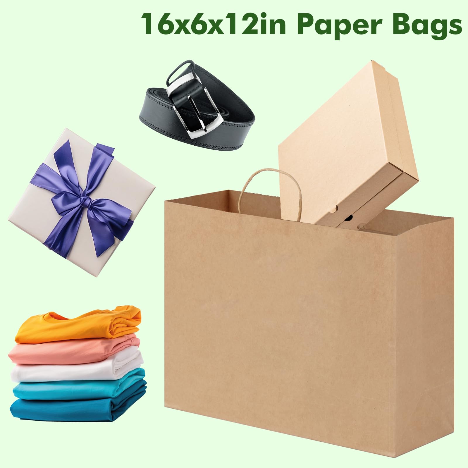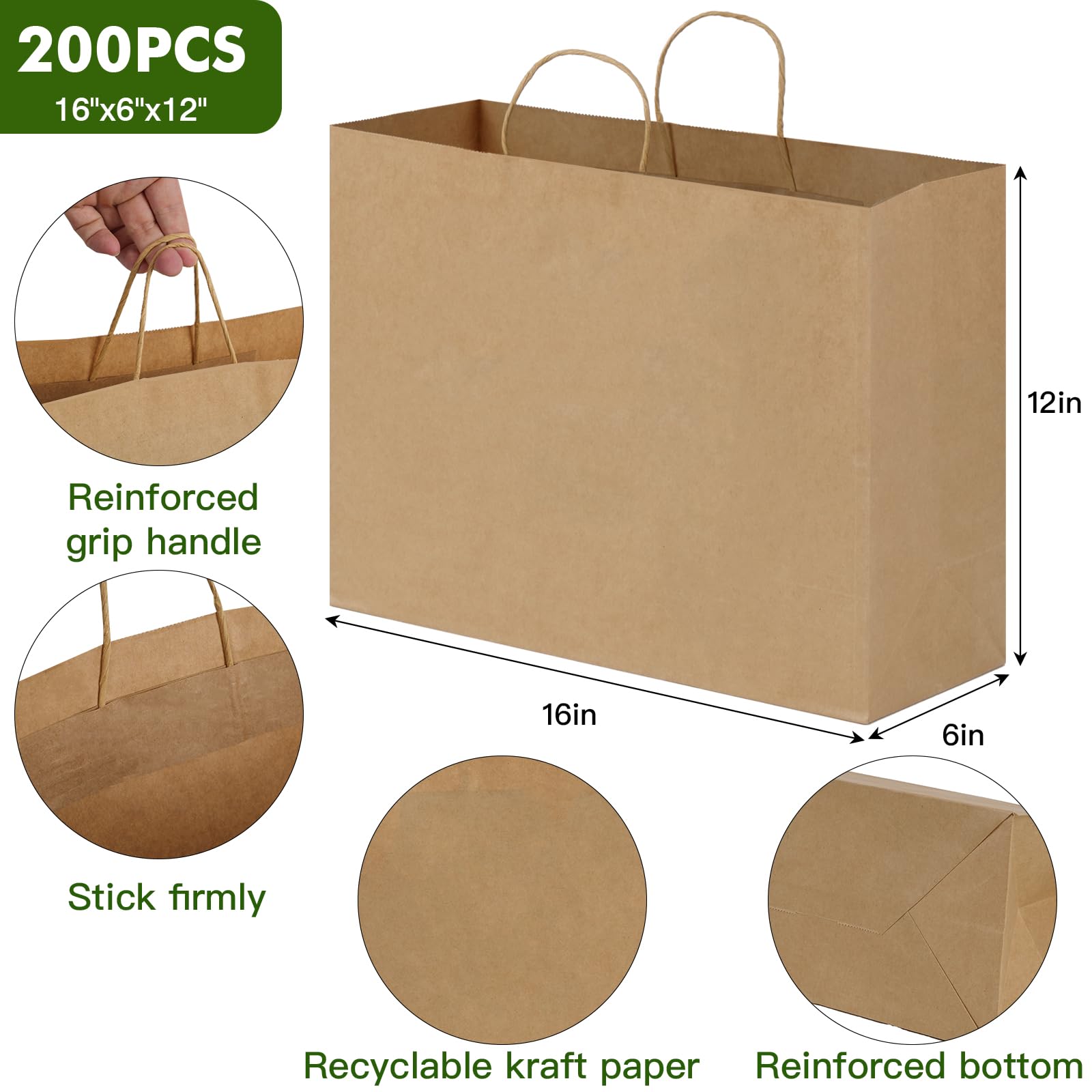 Super-Value Paper Bags Set: The size of brown paper bags with handles is 16 x 6 x 12 in, 200pcs in total, can meet your different needs.
