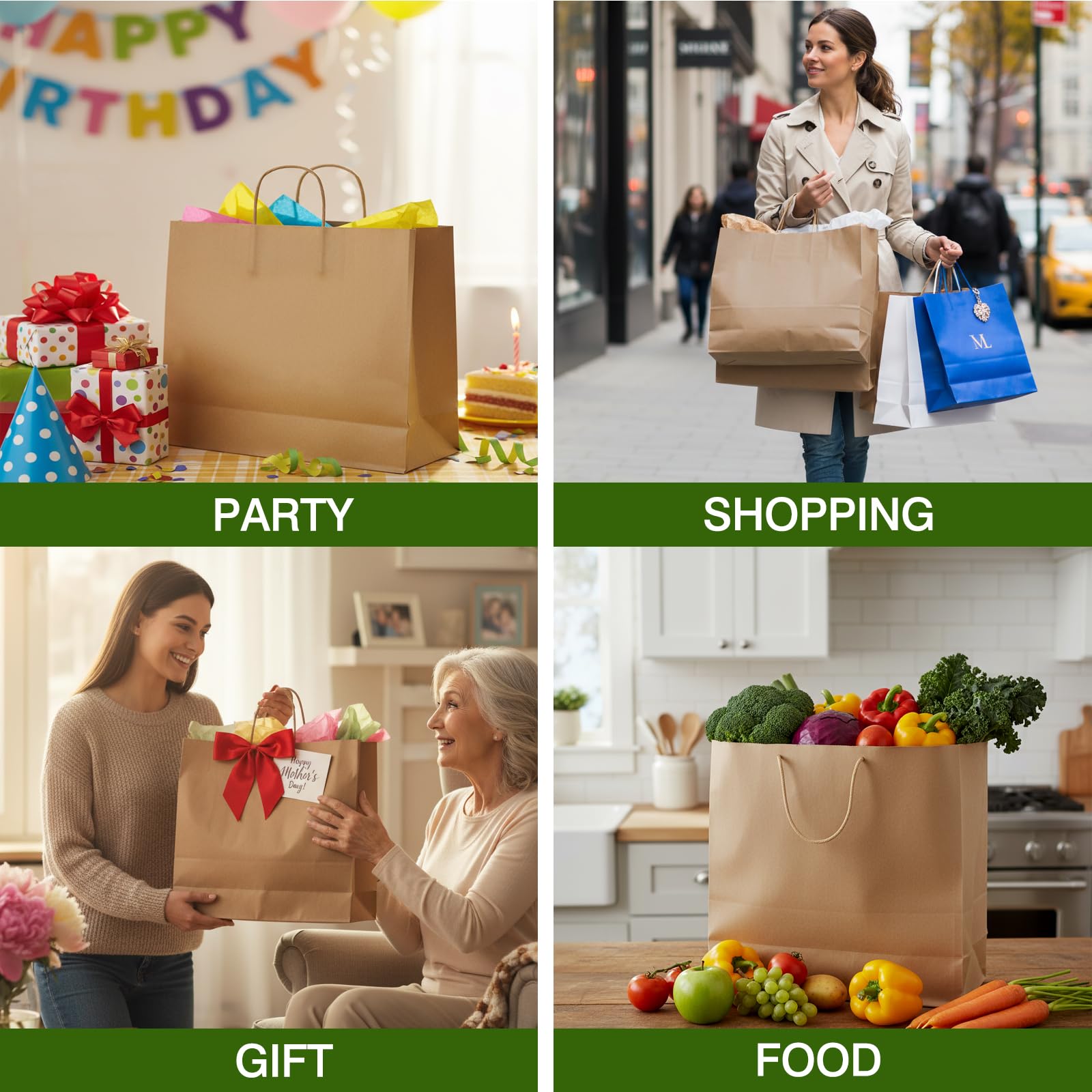 Perfect Structure: The well structured paper handles ensure that they are both fashionable and practical. The sturdy and flat bottom of the paper bag makes it easy to stand and accommodate more goods.