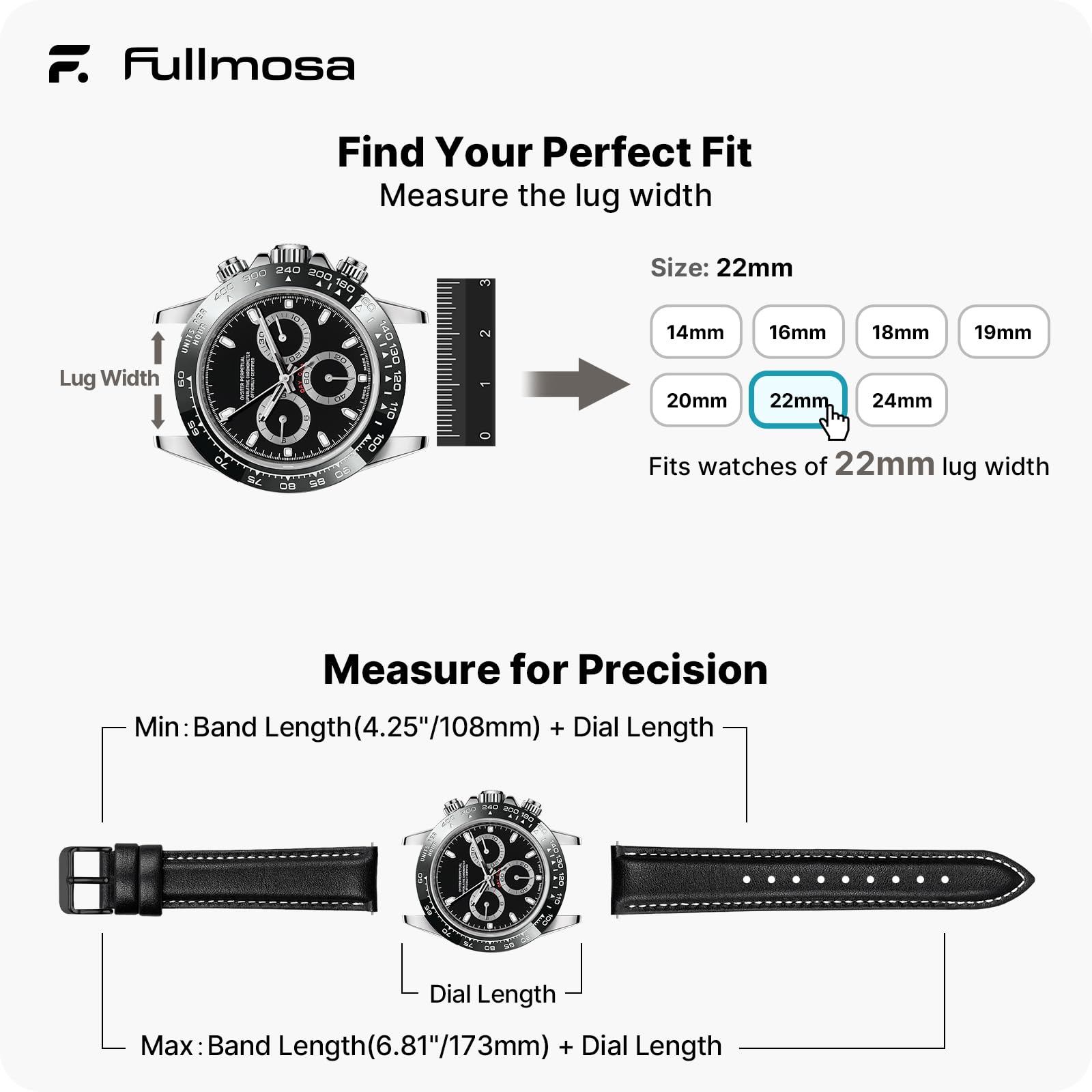 [Adjustable and Perfect Fit] Designed to fit almost any wrist.These 22mm watch bands fit wrist (4.25"+dial length)--(6.81"+dial length).11 (22mm) precision cut eyelets allow for individualized adjustment to achieve the perfect fit.Before you order, measure the breadth of your watch lugs.