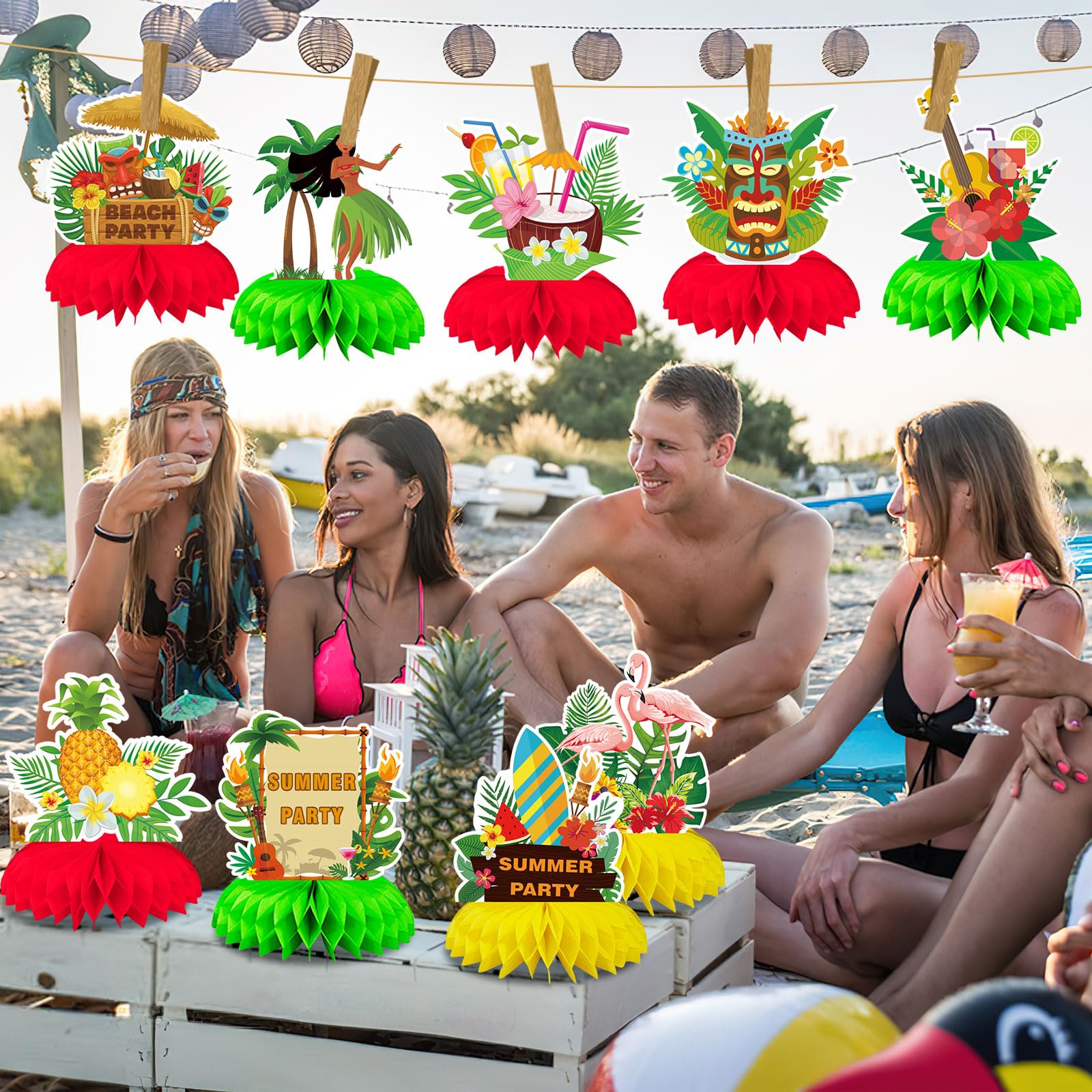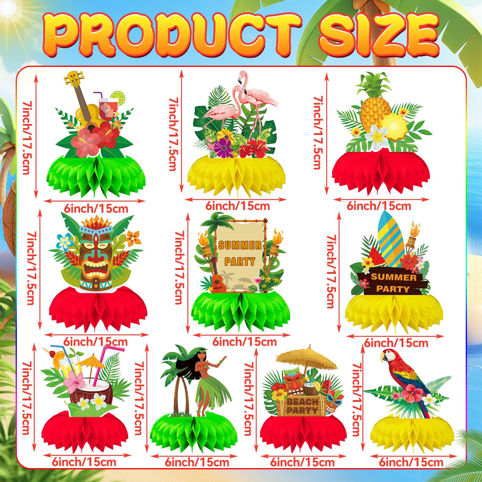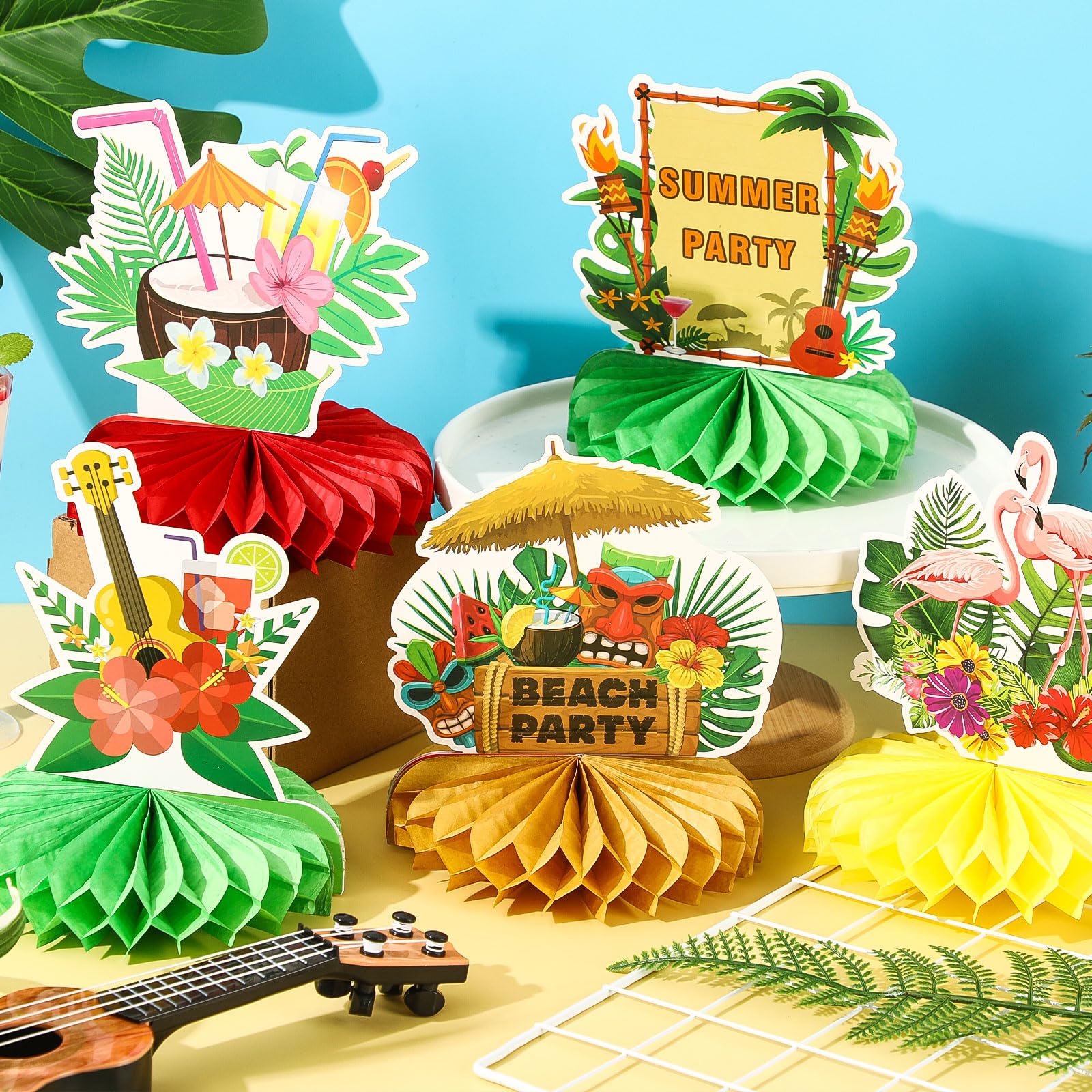 Diverse Style Design: The Hawaiian centerpiece table decorations have 10 different designs, each design has different style, so that the luau honeycomb centerpiece can meet the needs of different themes and occasions, providing more choices for your party decoration, making the party decoration more creative and personalized