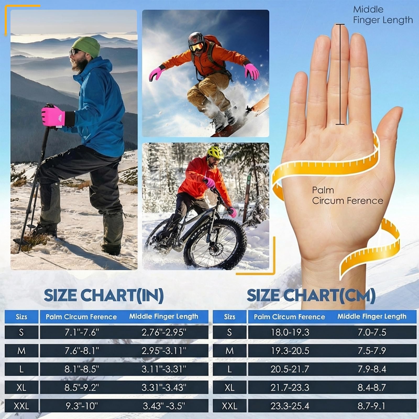 WINTER ESSENTIAL & PERFECT GIFT IDEA The companion you can't go without in winter adventures! With 20 vibrant colors and 6 sizes to choose from, these gloves are the ideal Christmas or Birthday gift for family and friends. IMPORTANT SIZING NOTE: Please measure your hand circumference and refer to our size chart before ordering. If you are between sizes, we recommend choosing one size LARGER for a comfortable fit.