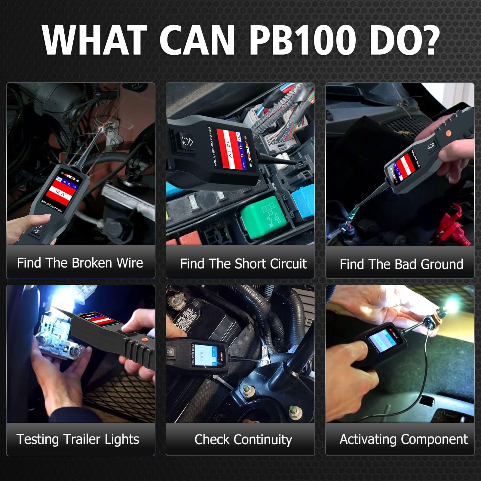 ăWhat does it do?ăThe PB100 is an essential tool for automobile user. It is needed for testing components on and off the vehicle, checking for the good and bad grounds, testing for continuity and diagnosing circuit failures. For example, you can use it to turn on a blower motor. You can run power window motors, windshield wipers, and even rear window defrosters. If the vehicle owner keeps it in his car he can check system failure on his own way no need to go to technician.