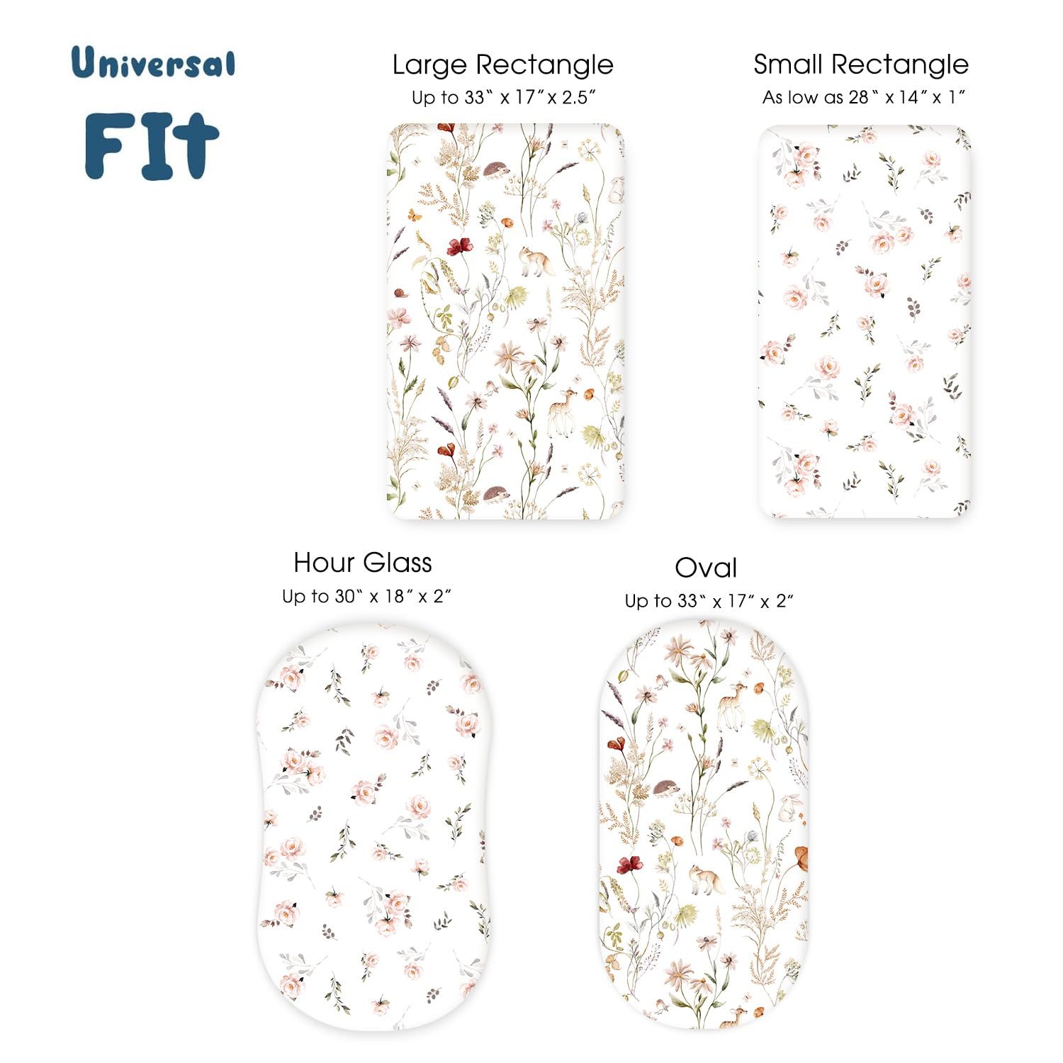 Universal Fit – Measuring 32" x 16" x 5". Our bassinet sheets fit almost all standard oval, round, rectangle, hourglass shaped bassinet mattress. Each bassinet mattress pad cover comes with an elastic band encased at the bottom for safety.