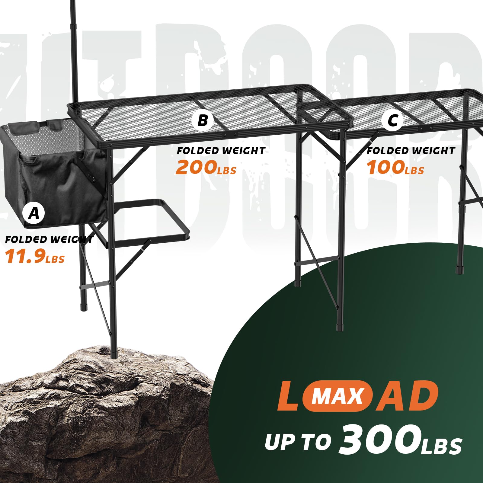 Your Go-To Outdoor Cooking Table: From family camping trips to backyard cookouts, this grill table is your trusted companion for any outdoor event. With generous space, practical features, and a rugged build, it’s the ultimate portable kitchen for the open air.