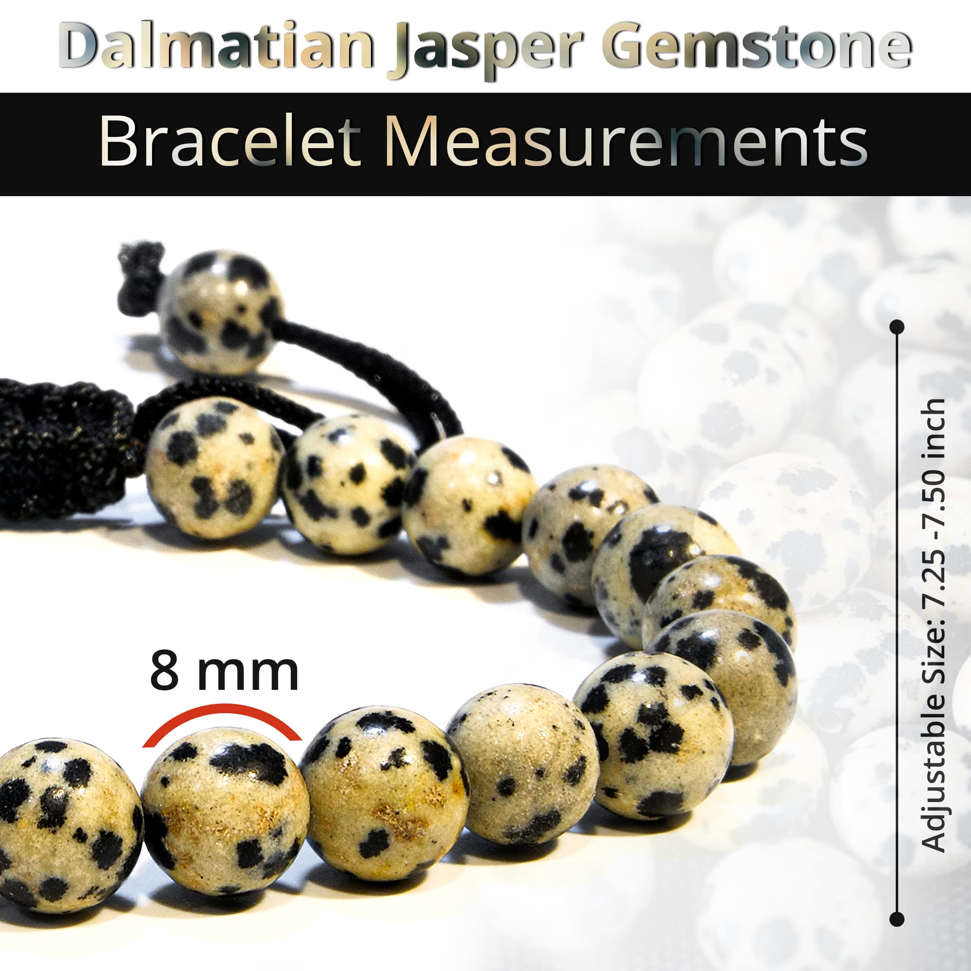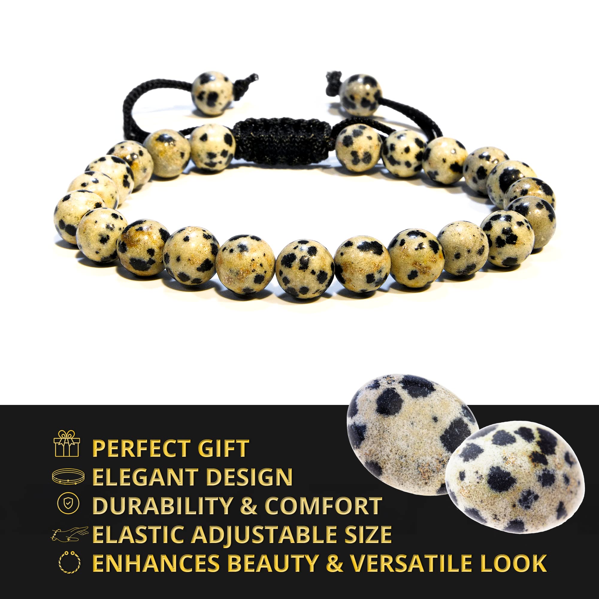 Made with Love: Our Dalmatian Jasper healing bracelets for women and men are made with high-quality, carefully selected real gemstones, smoothly rounded to perfect 8mm beads and an elastic string with macrame closure for comfortable and long-lasting wear.