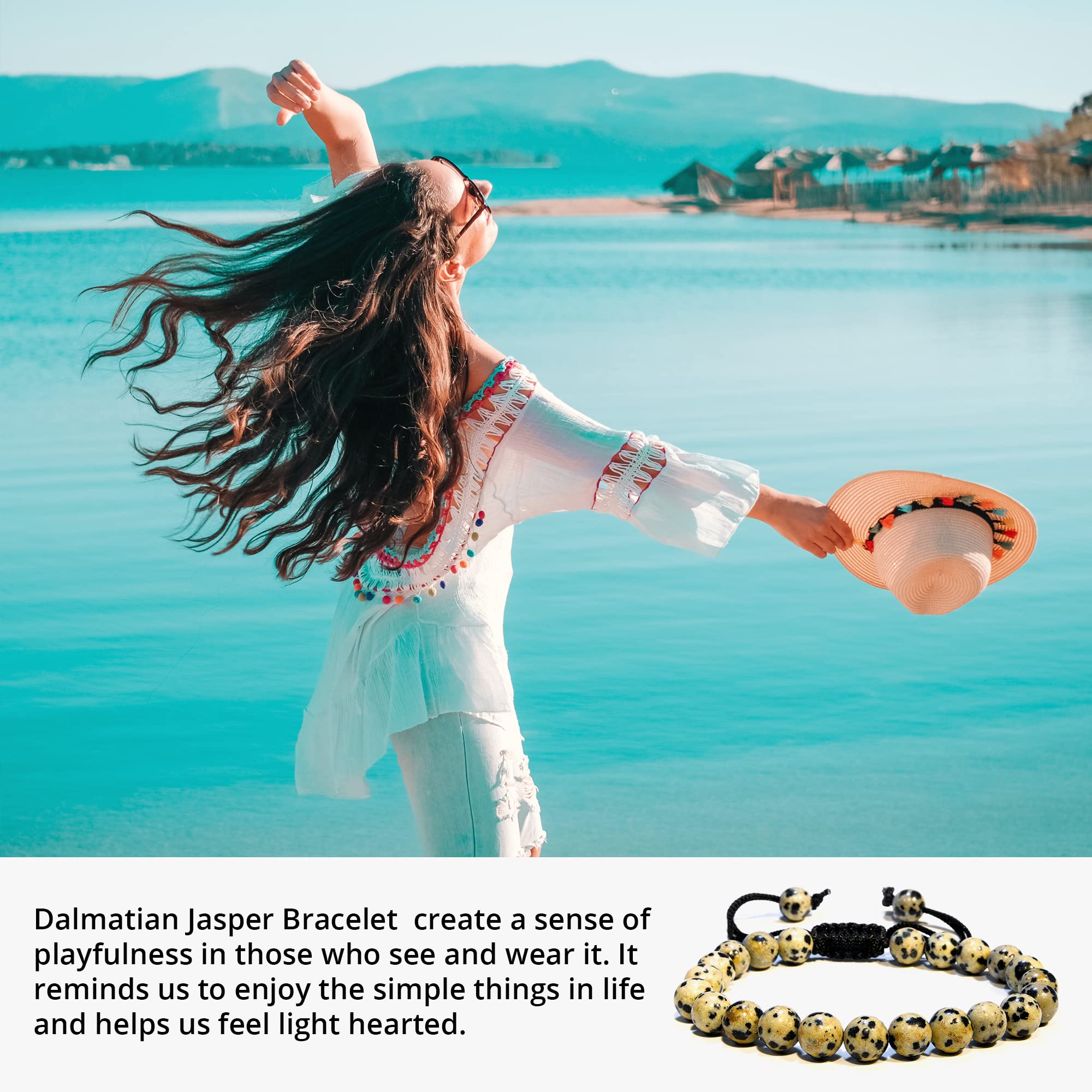 Adjustable Fit: The Dalmatian Jasper crystal bracelet for women and men is lightweight and comfortable to wear thanks to the adjustable macrame string. This macrame addition allows you to adjust the bracelet to any wrist size and enjoy a custom fit without any discomfort.