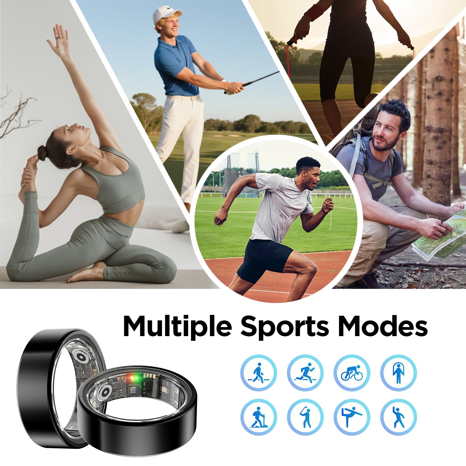 【24/7 Health Monitoring】It's also a fitness ring, automatically tracking your all-day heart rate, SpO₂, sleep quality, step count, and calories burned. It tracks multiple workout modes like running, cycling, jumping rope, walking, hiking, yoga, dancing, and golf, so you can clearly see your progress toward your fitness goals.