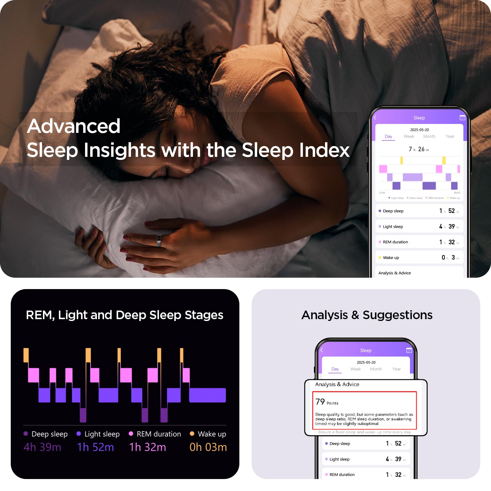 【Advanced Sleep Tracker】Benio smart ring for men and women automatically monitors your sleep quality, including all stages such as REM, light sleep, and deep sleep. This helps you understand your sleep patterns better and ensures you get the rest you need. Plus, it's comfortable and discreet, so you won't even notice it's there while you sleep.