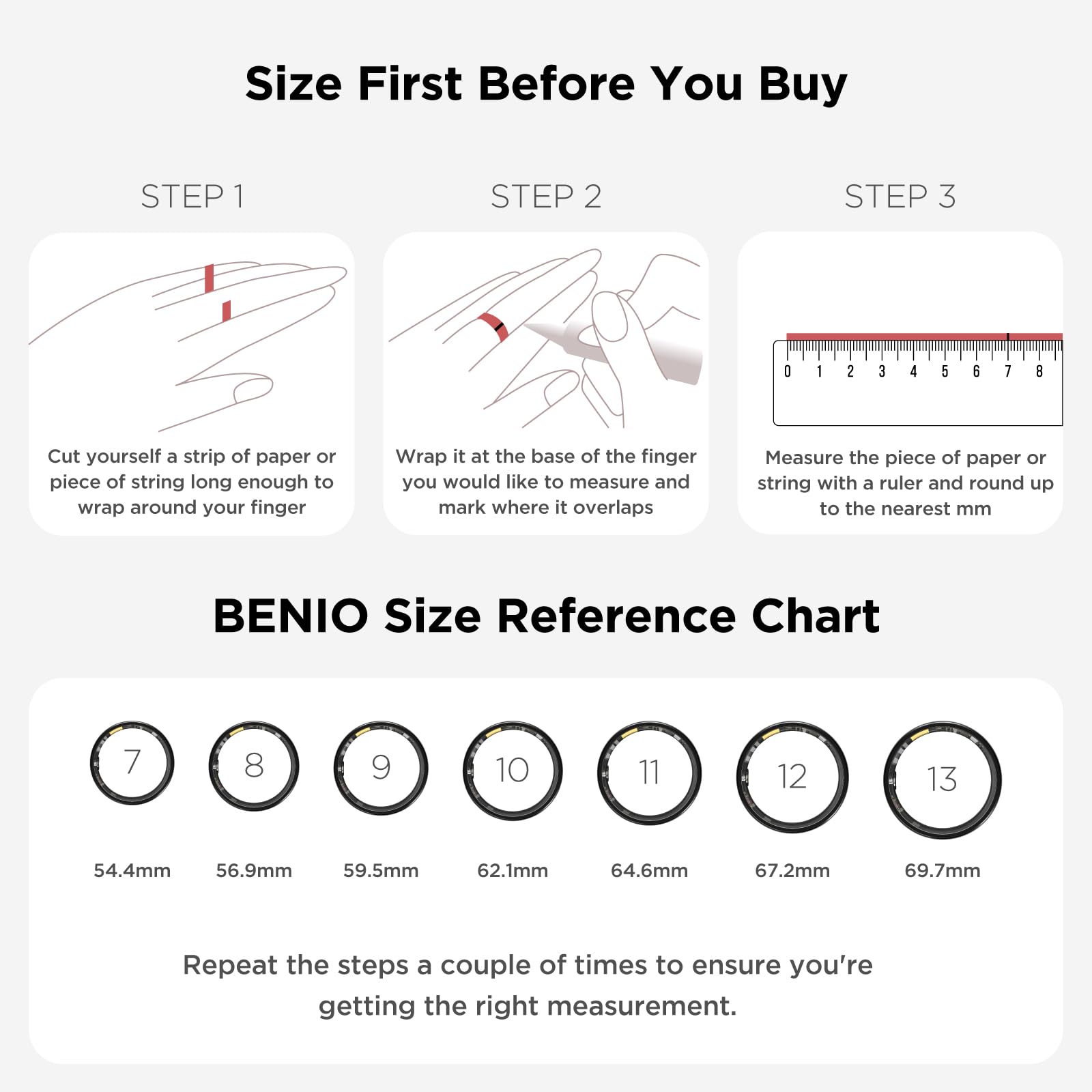 【Size Before You Buy】Before purchasing the Benio smart ring, we highly recommend referencing the size chart and measuring your finger to ensure a comfortable fit and avoid unnecessary returns or exchanges.