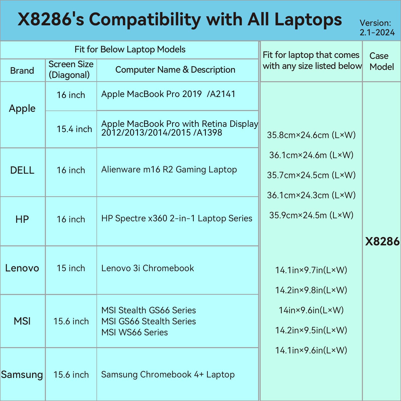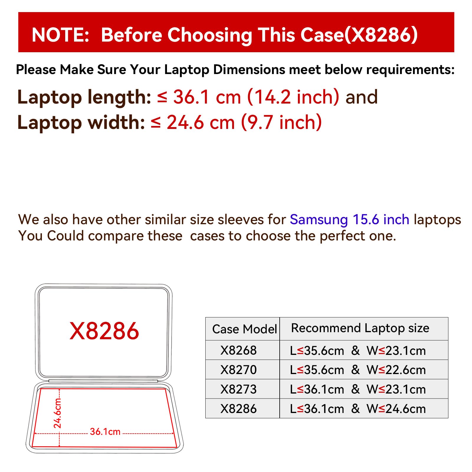 Model No.: X8286: internal dimensions of the case: 36.6x 25x 2.7 cm ( 14.4x 9.8x1.1 inch )