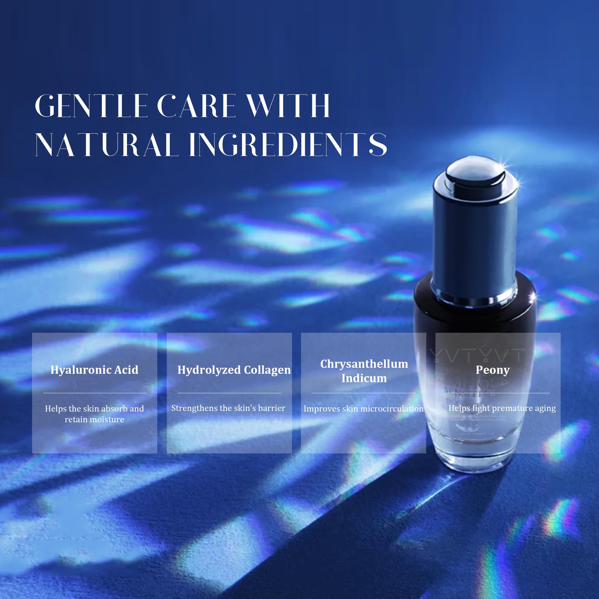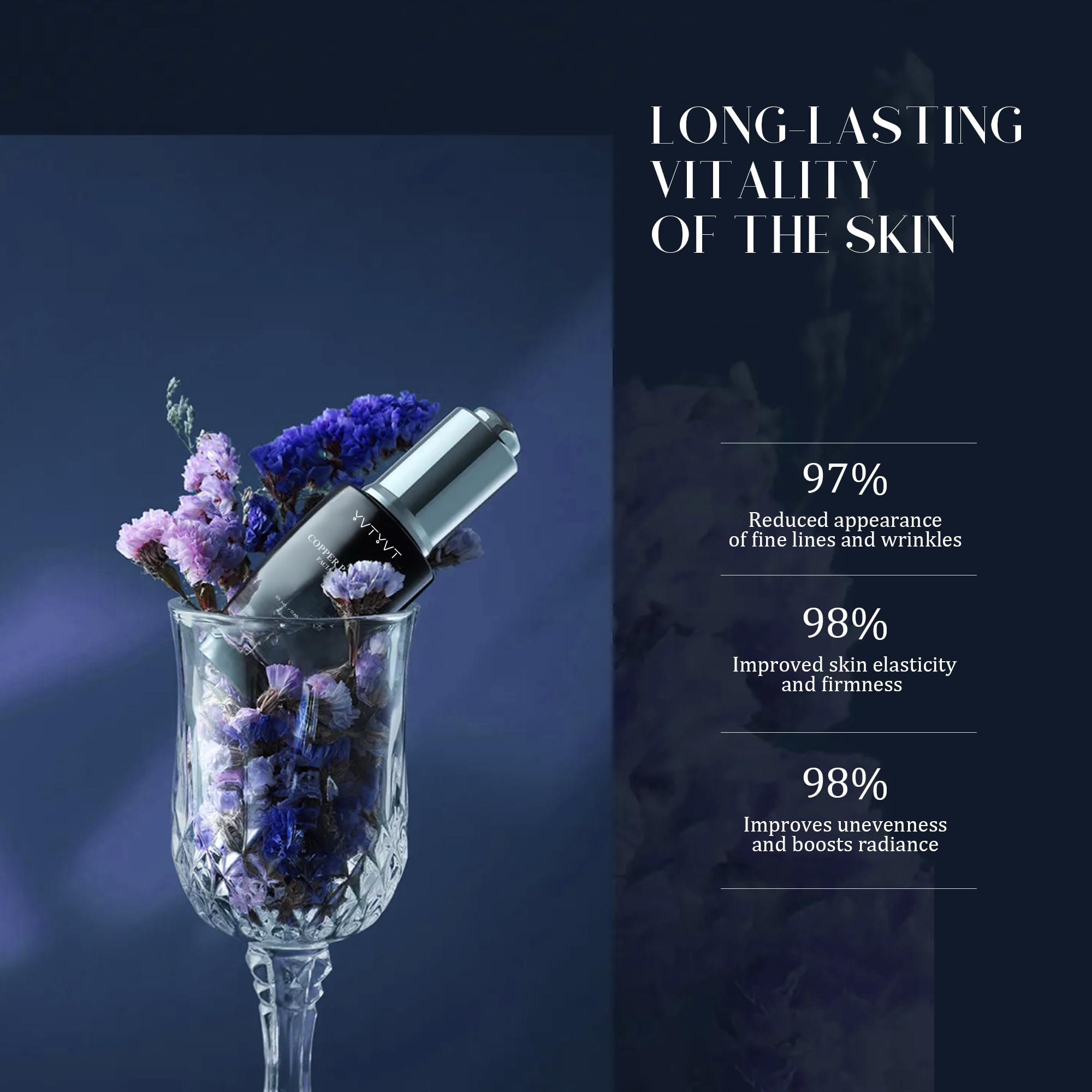 【24H DOUBLE HYDRATION】:Infused with Hydrolyzed Collagen, YVTYVT Copper Serum strengthens your skin’s barrier and delivers deep, lasting hydration.Chrysanthellum Indicum Extract helps improve microcirculation, boosting nutrient supply to your skin for an even, healthy glow. Together, these ingredients provide intense moisture, promoting smooth, plump, and firm skin.