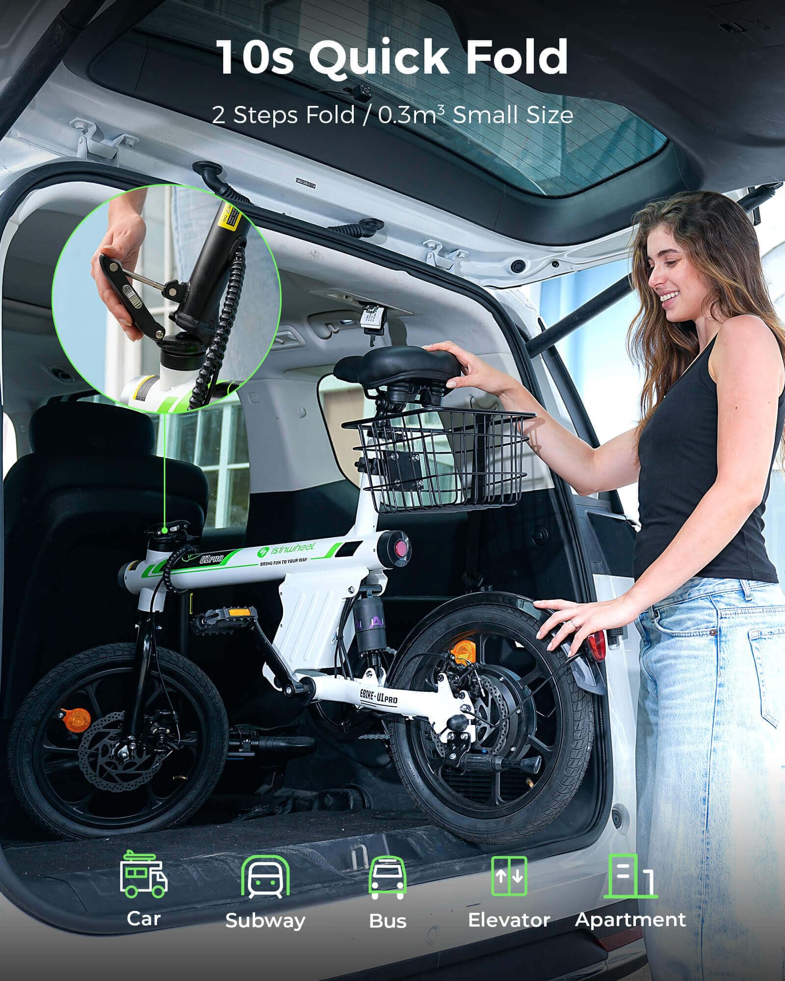 【Excellent Portability】- With foldable handlebars and a height-adjustable seat, the U1 Pro mini electric bike is designed for minimal storage space (<0.15m³). Whether fitting in a car trunk, navigating elevators, or keeping your apartment uncluttered, it's your ideal first e bike