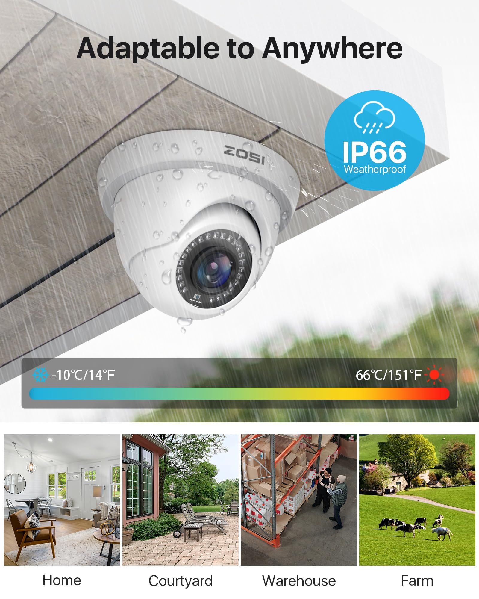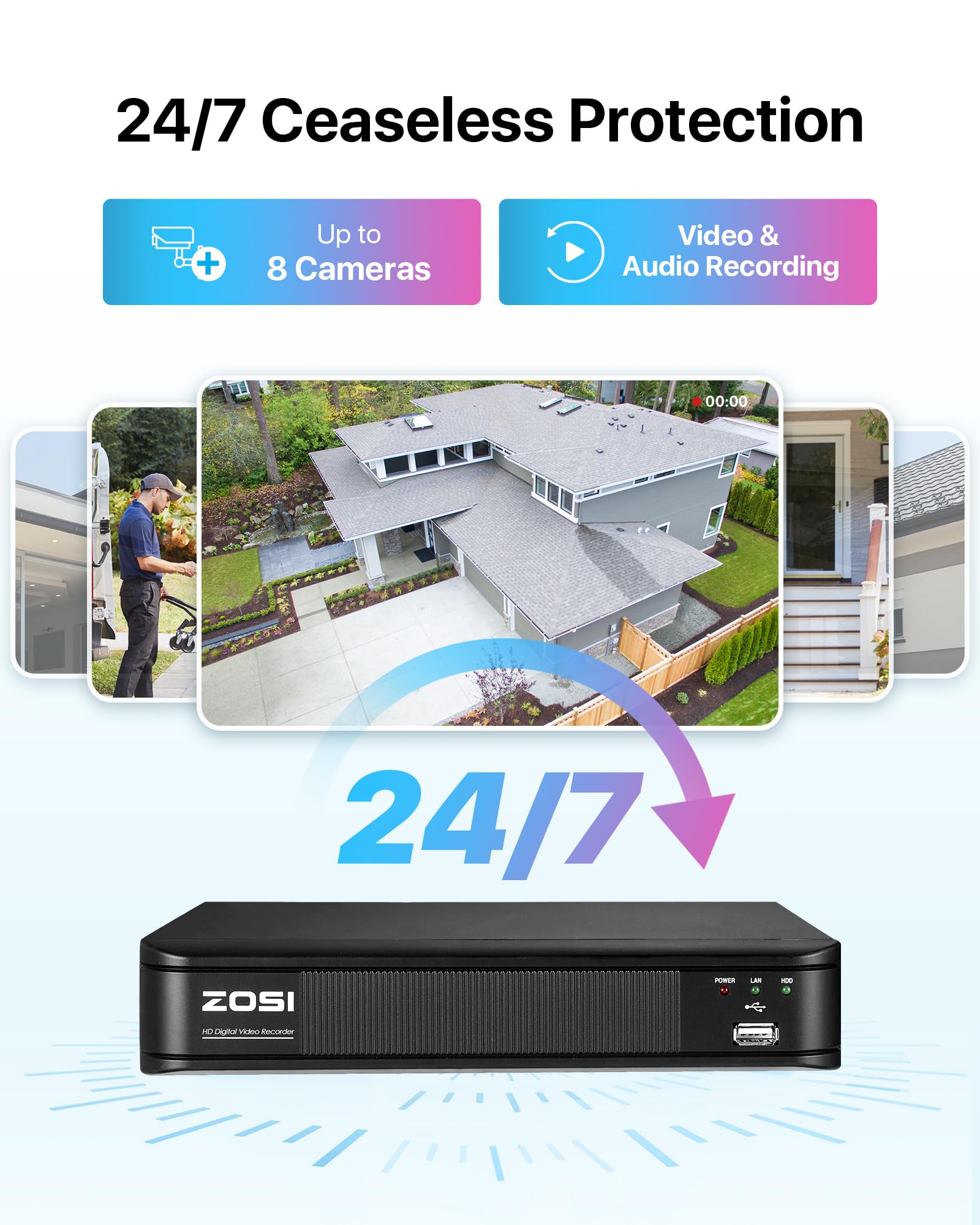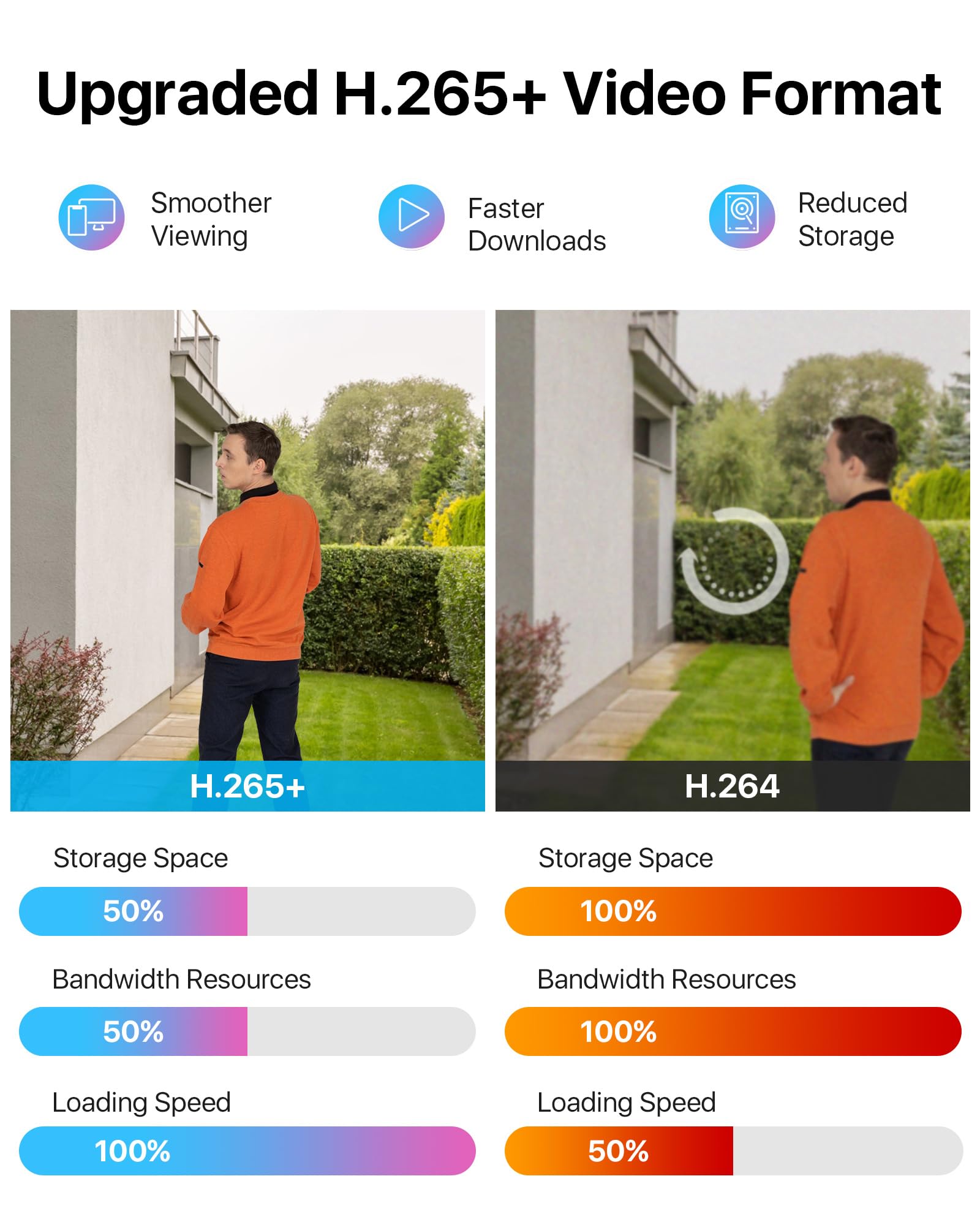 (4). [ Advanced H.265+ High Efficiency Video Compression ] __ ZOSI self-developed H.265+ video coding technology extract features that focus on characteristics of the surveillance scenes for larger storage space and better image quality. H.265+ can further improve compression ratio on the basis of H.265 standard and save about 80% storage compared with H.264, and thus effectively saving storage resources and provides an excellent and smooth viewing experience.