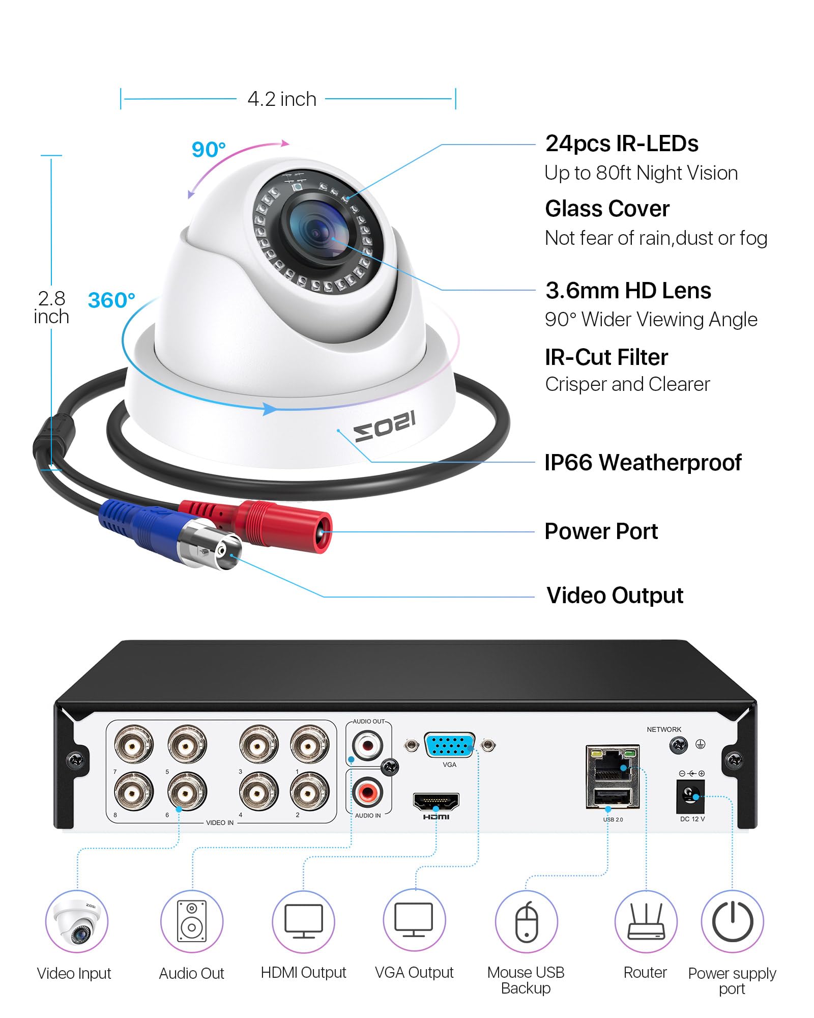 (2). [ 2MP System Overview ] __ Exclusive 8 Channel 5MP-Lite DVR Recorder paired with 8 Weatherproof 1080p dome cameras with 80ft night vision and 90°view angle. 60FT BNC+DC CCTV cabling provides both video and power to your cameras,more stable and reliable than wireless security system.(No Hard Drive Included)