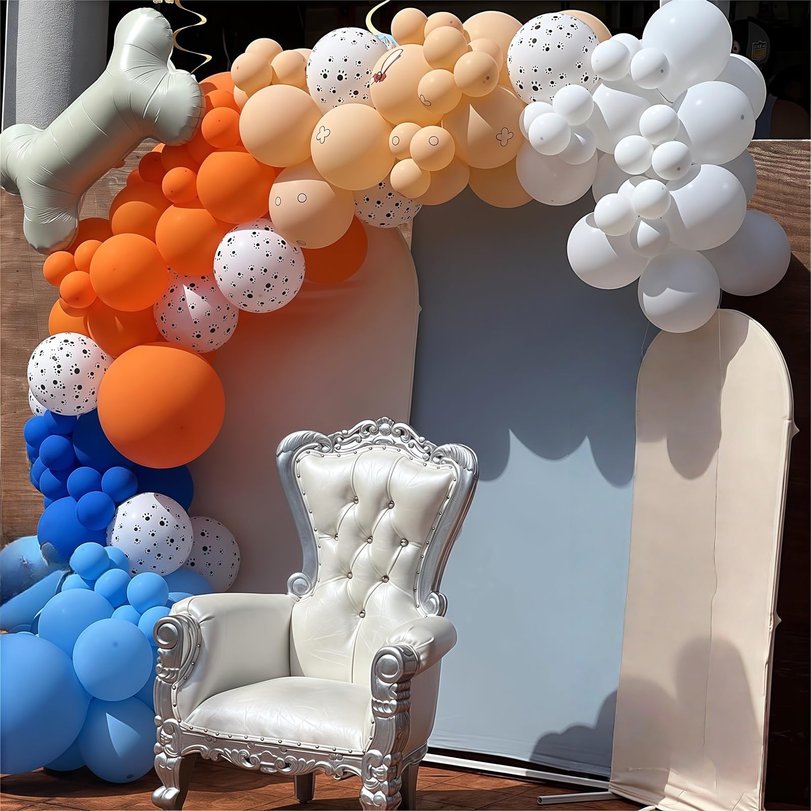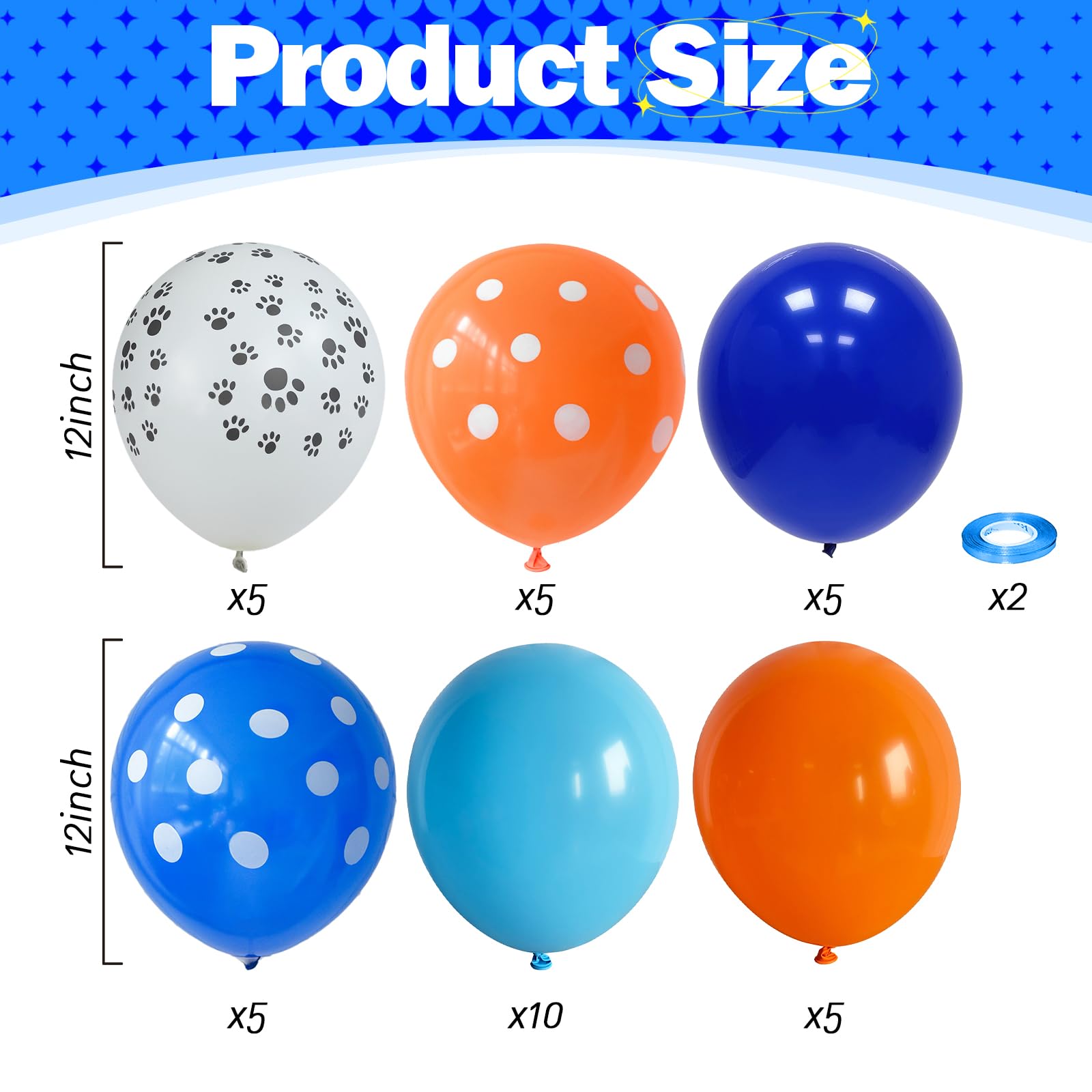 🦴 Blue and Orange Balloons Set: This is a beautiful bright balloon, which contains balloons of different colors. Include 12 inch dog paw print balloon(5pcs), light blue balloon(10pcs), royal blue balloon(5pcs), orange balloon(5pcs), orange white print balloon(5pcs), dark blue white print balloon(5pcs), 2 rolls of ribbons. You can use these different shades of blue and orange balloon kits, DIY balloon combinations to create your birthday party.
