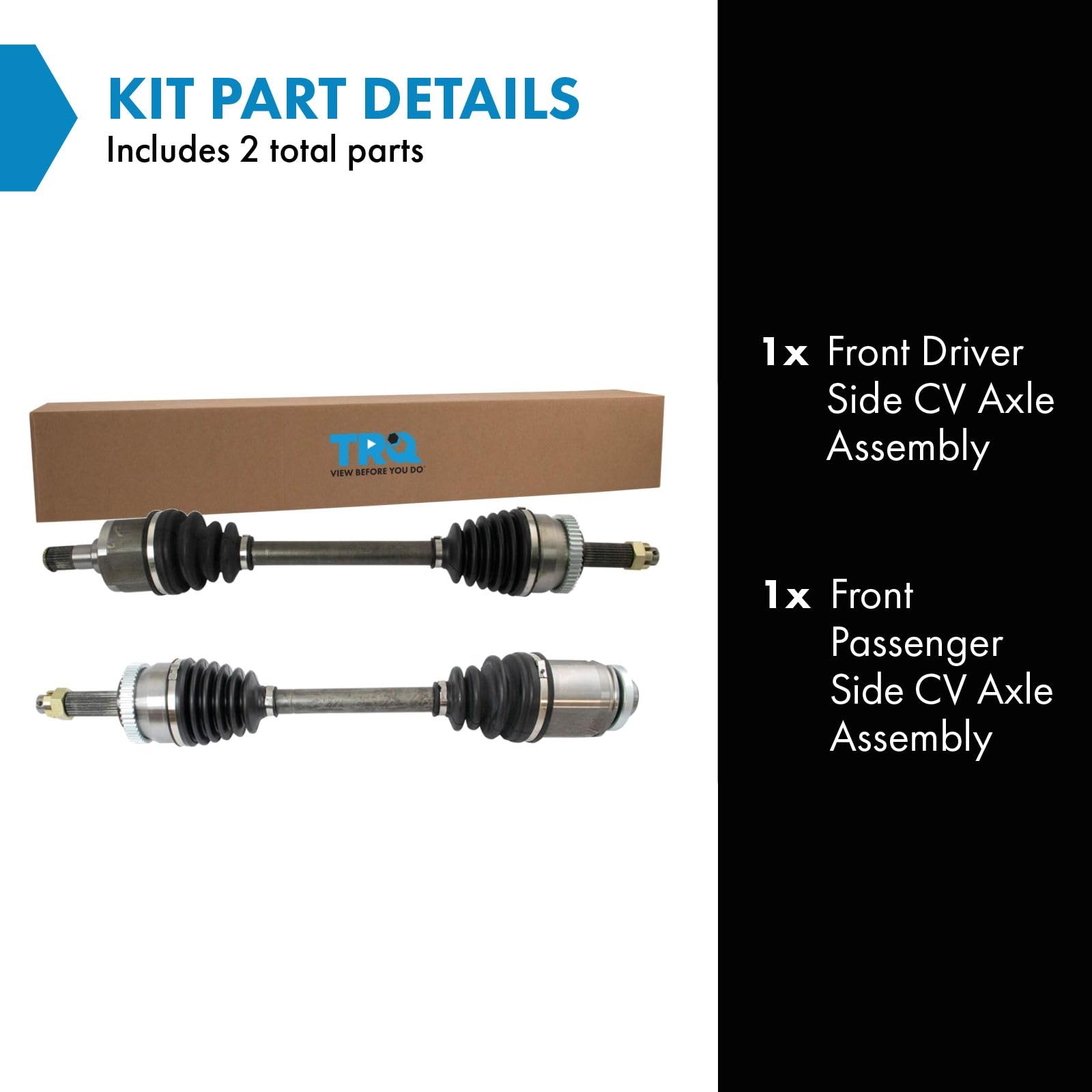 2 Piece CV Axle Assembly Set Kit Includes (1) Front Driver Side CV Axle Assembly (1) Front Passenger Side CV Axle Assembly Fitment Compatible with: 2005-09 Kia Sportage V6 2.7L Front Wheel Drive Front Driver & Passenger Side Compatible with: 2005-09 Kia Sportage L4 2.0L All Wheel Drive Front Driver & Passenger Side Compatible with: 2005-09 Kia Sportage V6 2.7L All Wheel Drive Front Driver & Passenger Side Compatible with: 2005-06 Hyundai Tucson GL 4 Wheel Drive Manual Transmission Front Driver & Passenger Side Compatible with: 2005-06 Hyundai Tucson GLS 4 Wheel Drive Automatic Transmission Front Driver & Passenger Side Compatible with: 2006 Hyundai Tucson Limited 4 Wheel Drive Automatic Transmission Front Driver & Passenger Side Compatible with: 2005 Hyundai Tucson LX 4 Wheel Drive Automatic Transmission Front Driver & Passenger Side Compatible with: 2007 Hyundai Tucson SE Front Wheel Drive Automatic Transmission Front Driver & Passenger Side Compatible with: 2007 Hyundai Tucson Limited Front Wheel Drive Automatic Transmission Front Driver & Passenger Side Compatible with: 2007 Hyundai Tucson GLS 4 Wheel Drive Manual Transmission Front Driver & Passenger Side Compatible with: 2008 Hyundai Tucson V6 2.7L Front Driver & Passenger Side Compatible with: 2010 Kia Sportage All Wheel Drive Front Driver & Passenger Side Compatible with: 2009 Hyundai Tucson V6 2.7L Front Wheel Drive Front Driver & Passenger Side Product Attributes Quantity: 2 Piece Product Features 100% New: Manufactured to tighter tolerances for extended service life Neoprene Boots: Improved durability compared to stock material Moly Greased: Specifically-designed grease shield to reduce premature wear Application Specific Design: No modification Item Details TRQ CV (constant velocity) drive axles are manufactured using premium raw materials designed to restore original performance. TRQ CV drive axles are new, so there is no core charge with your TRQ purchase. TRQ-designed drive axles utilize neoprene boots, moly grease, stainless steel clamps, and heat-treated ball tracks to ensure extended service life. Each TRQ axle is application-specific so each spline and thread will mate properly for a seamless fit. All products are fit and road-tested in our Massachusetts R&D facility to ensure we deliver on our promise of Trusted Reliable Quality. Reference Numbers 447-61611L 447-61612L 447-61613L 447-61693L 447-61694L 495001F400 495001F600 495001F800 495002E550 495002E900 495002E950 495011F200 495011F400 495012E201 495012E400 495012E900 66-3439 66-3504 663439 ADS00055 ADS00102 NCV37567 NCV51519 NCV51522