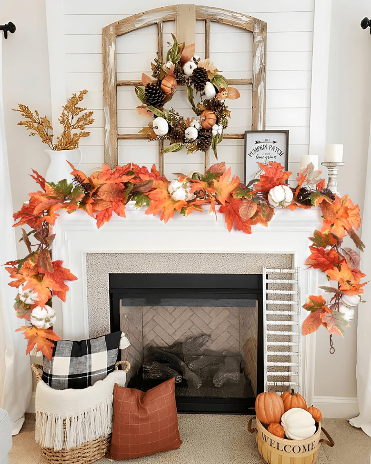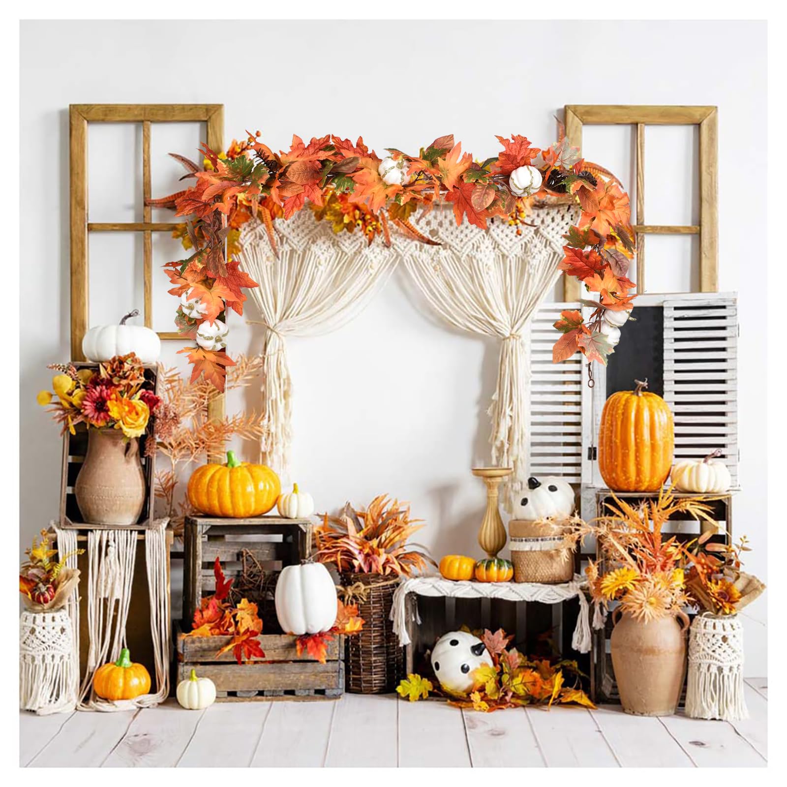 DearHouse Pumpkins Maple Leaves Fall Garland Decoration Get into the spirit of Fall! Nothing quite says Fall like leaves changing colors and dropping from trees. What better way to capture the Autumn season than with a colorful maple leaf garland on your mantelpiece or across your piano? Beautiful Colors Warm Up Your Home If you're looking to spruce up the entryway, cozy up those indoor plants, or add some Fall color to the centerpiece on your dining table. DearHouse Maple Leaf Garland helps bring the beauty of the changing seasons right into your home! Make this Fall colorful not only outside, but inside your home too. Ideal Maple Leaves Fall Garland Decoration Suitable for indoor and outdoor decoration in gardens, swings, balconies, bedrooms, wall hangings, birthdays, banquets, weddings, etc. Handmade maple leaf that look like real preserved plants, but do not wither, fade or be easily damaged. No water, no maintenance required. Add landscapes to your patio or balcony indefinitely throughout the year. Features: ☛ Color: Green, orange and brown and more other colors ☛ Material: Silk and plastic ☛ Length:5.9 feet ☛ Wide applications: This artificial fall garland is widely used to decorate fireplaces, windows, frontdoor, garden, staircase etc. Great for autumn Thanksgiving holiday party decoration, also good as a gift to your family and friends. ☛ It can be used indoor or outdoor, won't fade under rain and sunlight, beutiful decoration all year around. What you will get? 1 strand of Artificial Maple Leaves Garlands 2 hooks