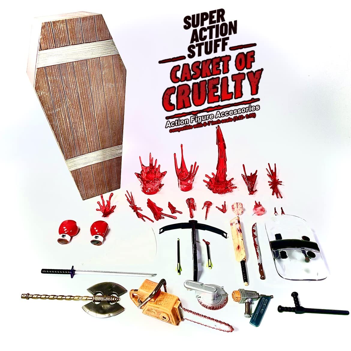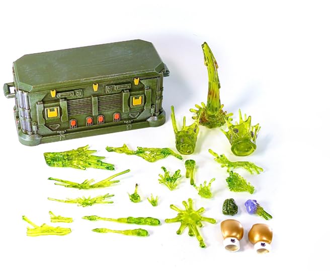 The CURSED CRATE by Super Action Stuff is a set including over 22 accessories compatible with 1/12 scale action figures. This set includes a sci-fi styled crate with removable lid, numerous gory translucent green blood effects and a pair of gold colored boxing gloves. Bloody green effects come in all shapes and sizes including an alien heart and brain, exit wounds, impact effects, different splashes, and a green splashing vomiting effect. Perfect for action figure photography with translucent green blood effects designed to add some bloody effects with your green-blooded characters. Increase the brutality of your action figure displays, and bring some green blood to your aliens, orcs, goblins, monsters, mutants, green shape-shifters, hulking beasts, reptiles, and other creatures in your collection! Set contents: Crate Set of boxing gloves Heart with dripping blood Bloody brain Slash effect Large dripping blood effects Small dripping blood effects Entry and exit bullet wound blood effectBloody vomit effect 1/12 Scale Materials: Plastic Compatible with most major figure lines Figures not included