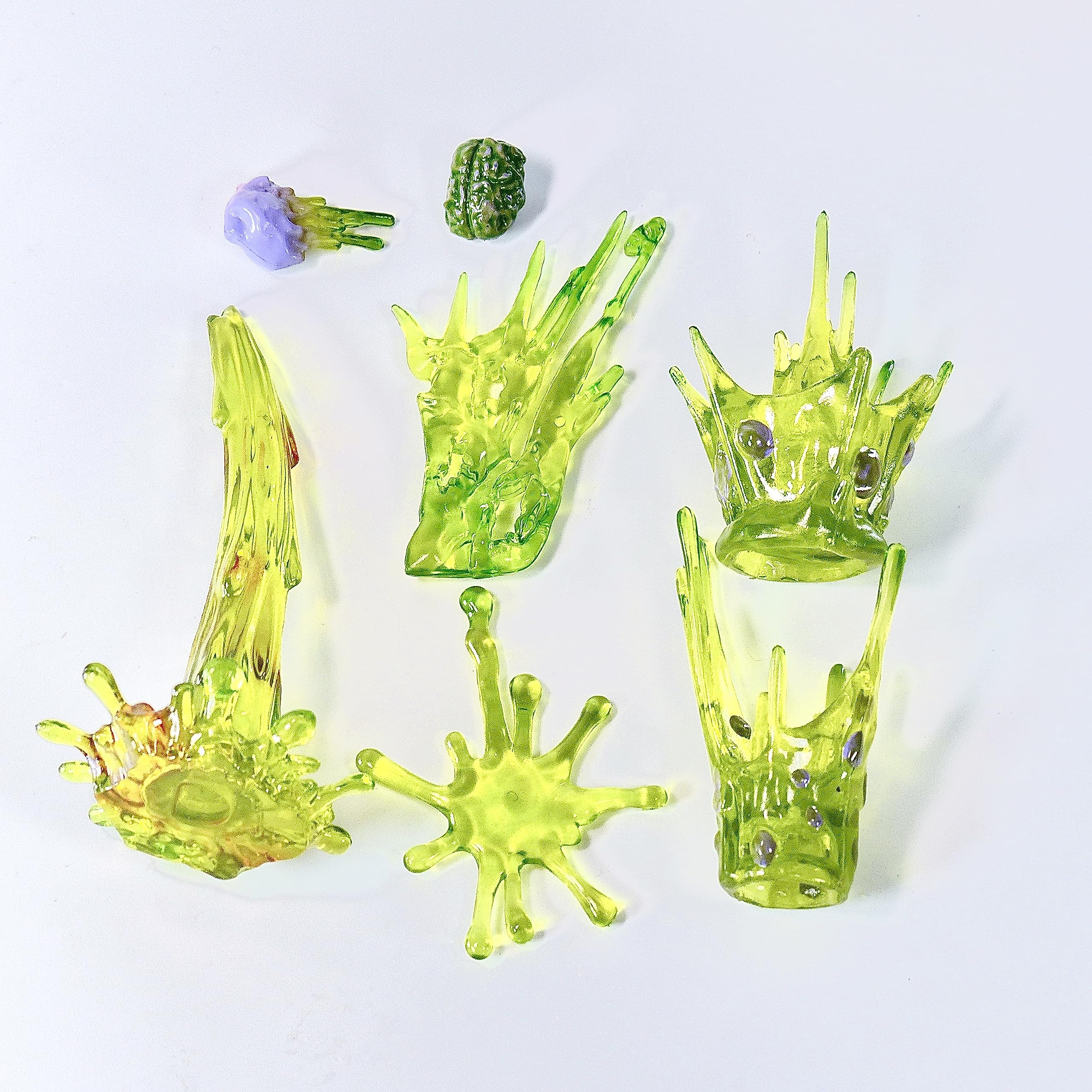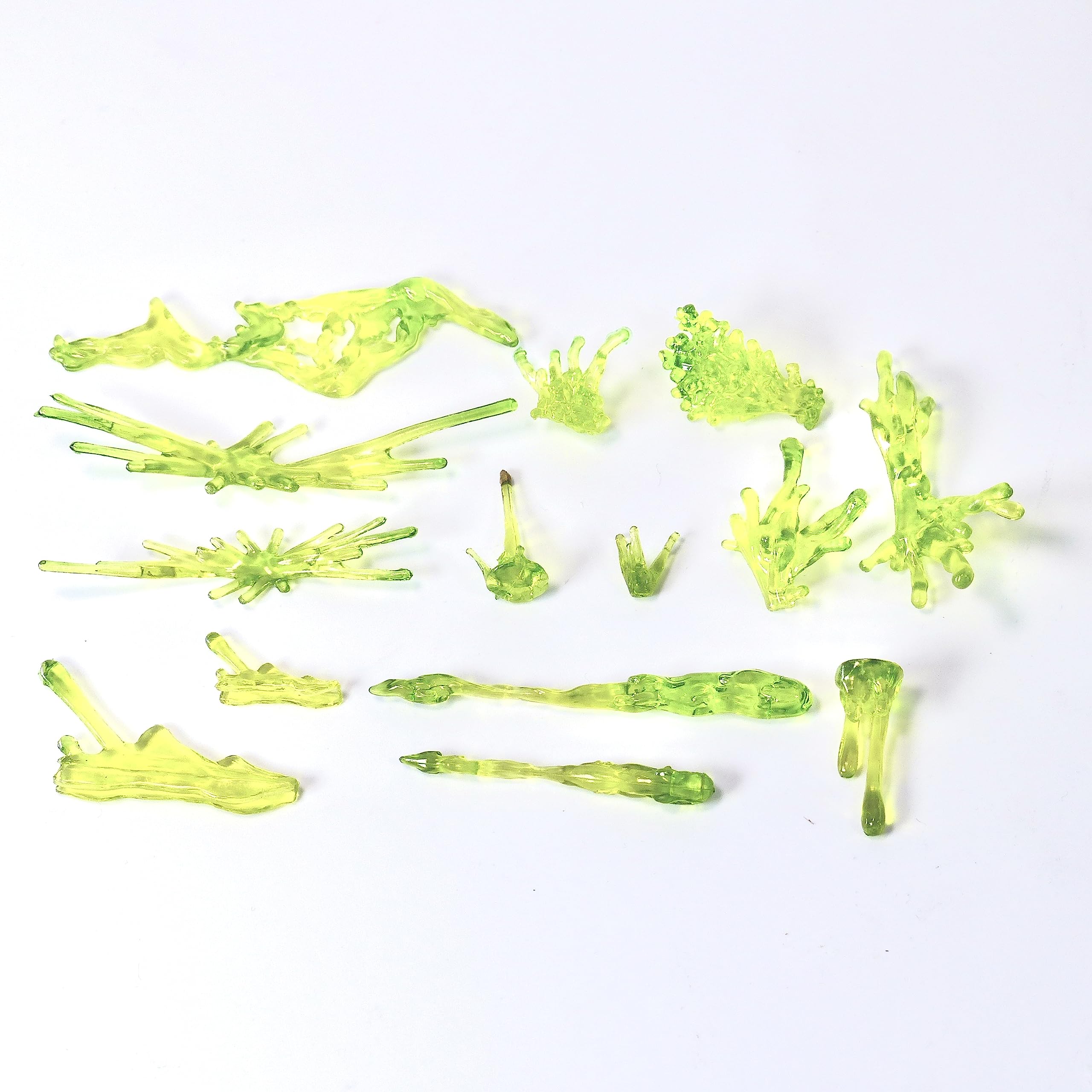 Numerous green blood effects compatible with action figures (sticky adhesive may be needed to stick to figures)